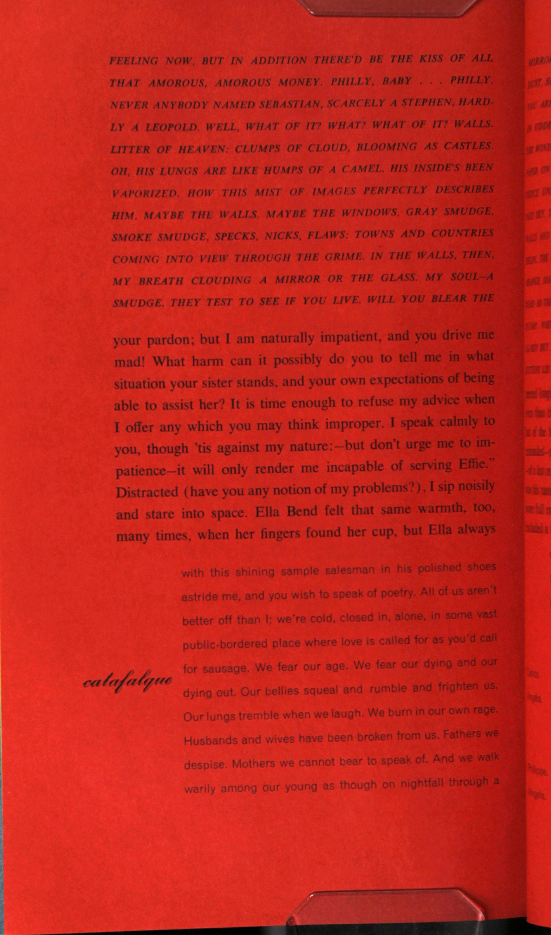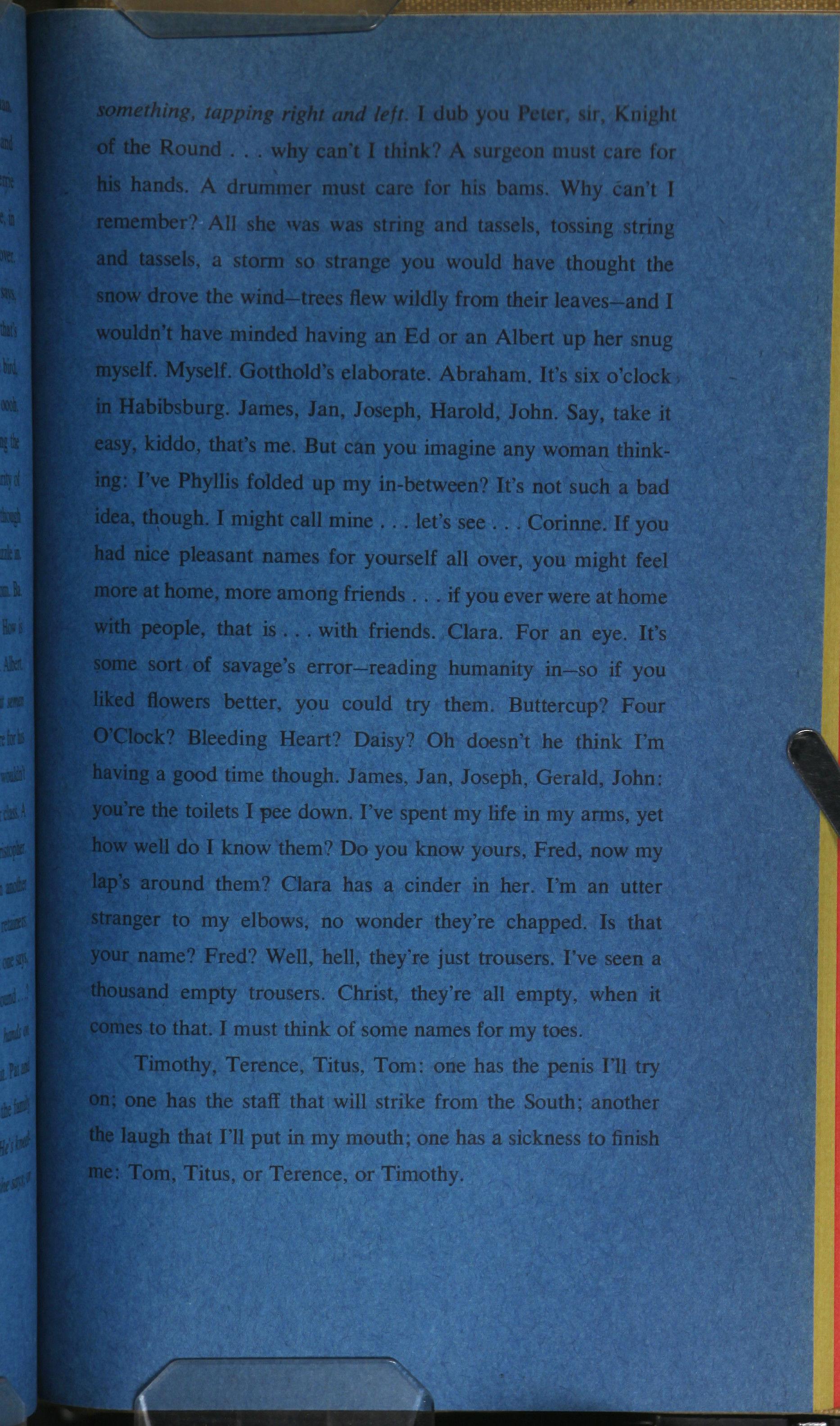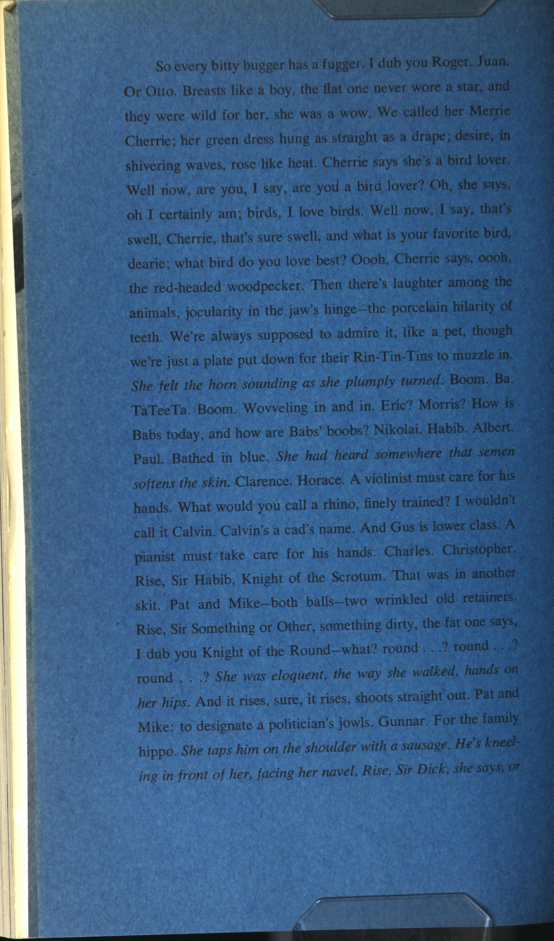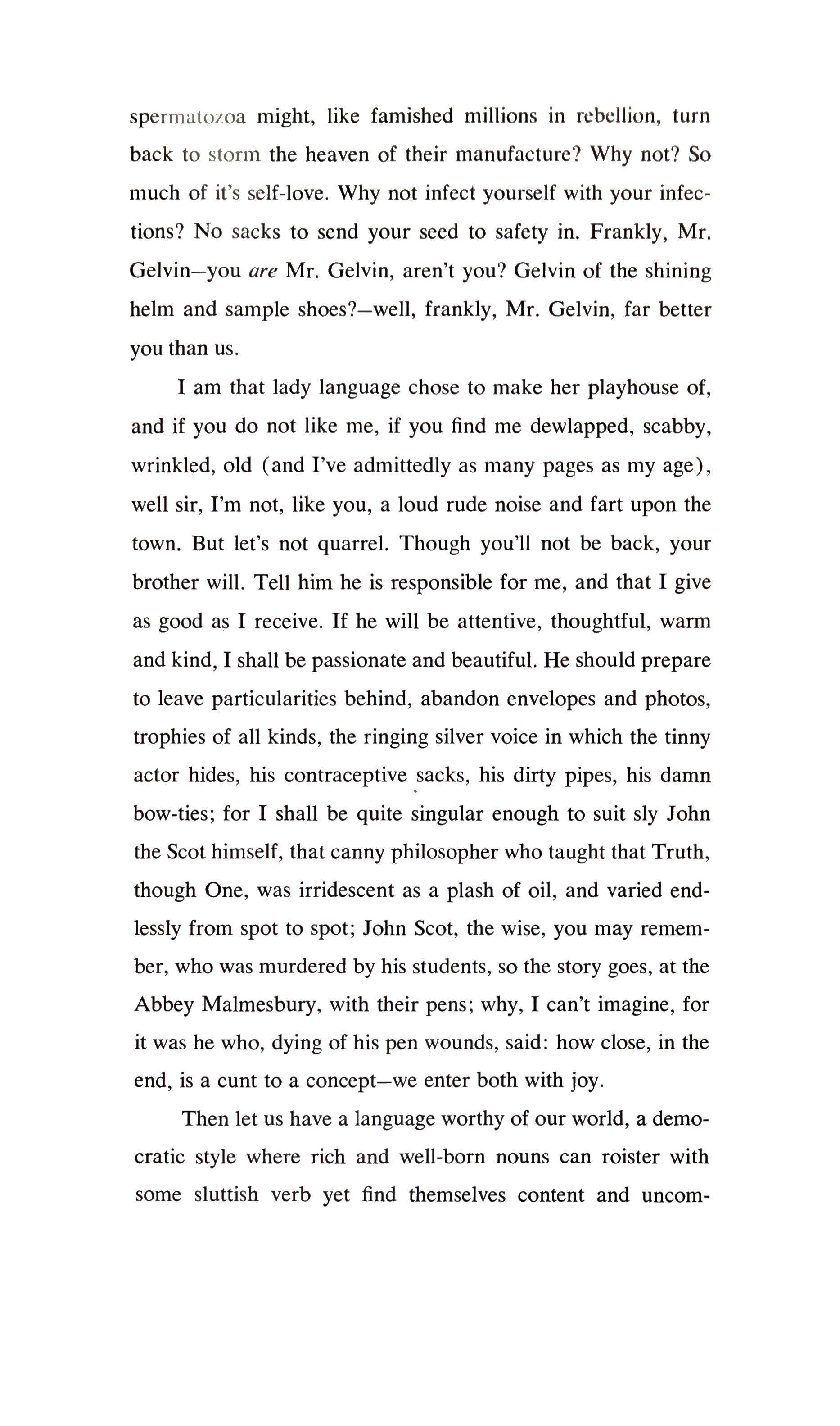 I am that lady language chose to make her playhouse of, and if you do not like me, if you find me dewlapped, scabby, wrinkled, old (and I've admittedly as many pages as my age), well sir, I'm not, like you, a loud rude noise and fart upon the town. But let's not quarrel. Though you'll not be back, your brother will. Tell him he is responsible for me, and that I give as good as I receive. If he will be attentive, thoughtful, warm and kind, I shall be passionate and beautiful. He should prepare to leave particularities behind, abandon envelopes and photos, trophies of all kinds, the ringing silver voice in which the tinny actor hides, his contraceptive sacks, his dirty pipes, his damn bow-ties; for I shall be quite singular enough to suit sly John the Scot himself, that canny philosopher who taught that Truth, though One, was irridescent as a plash of oil, and varied endlessly from spot to spot; John Scot, the wise, you may remember, who was murdered by his students, so the story goes, at the Abbey Malmesbury, with their pens; why, I can't imagine, for it was he who, dying of his pen wounds, said: how close, in the end, is a cunt to a concept we enter both with joy.