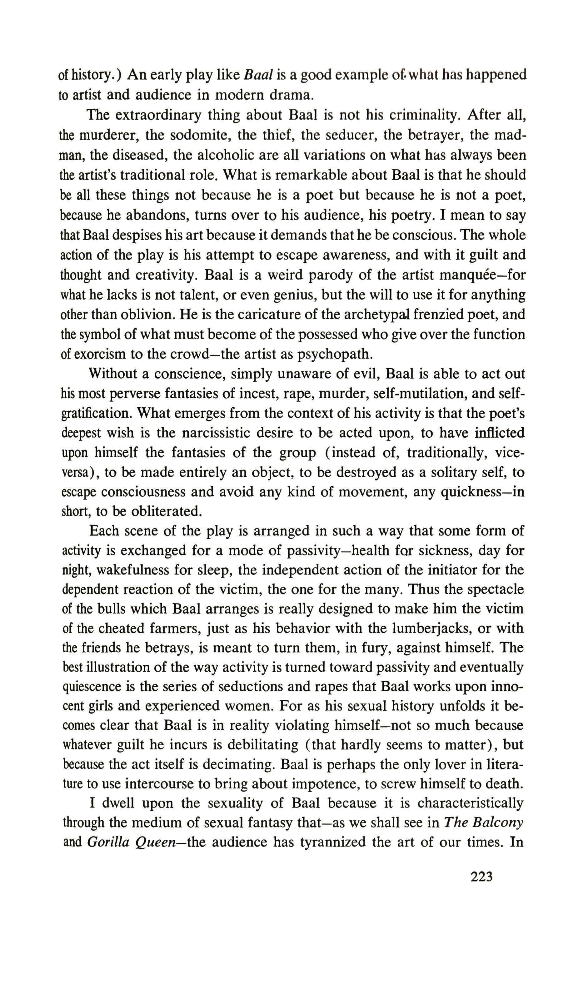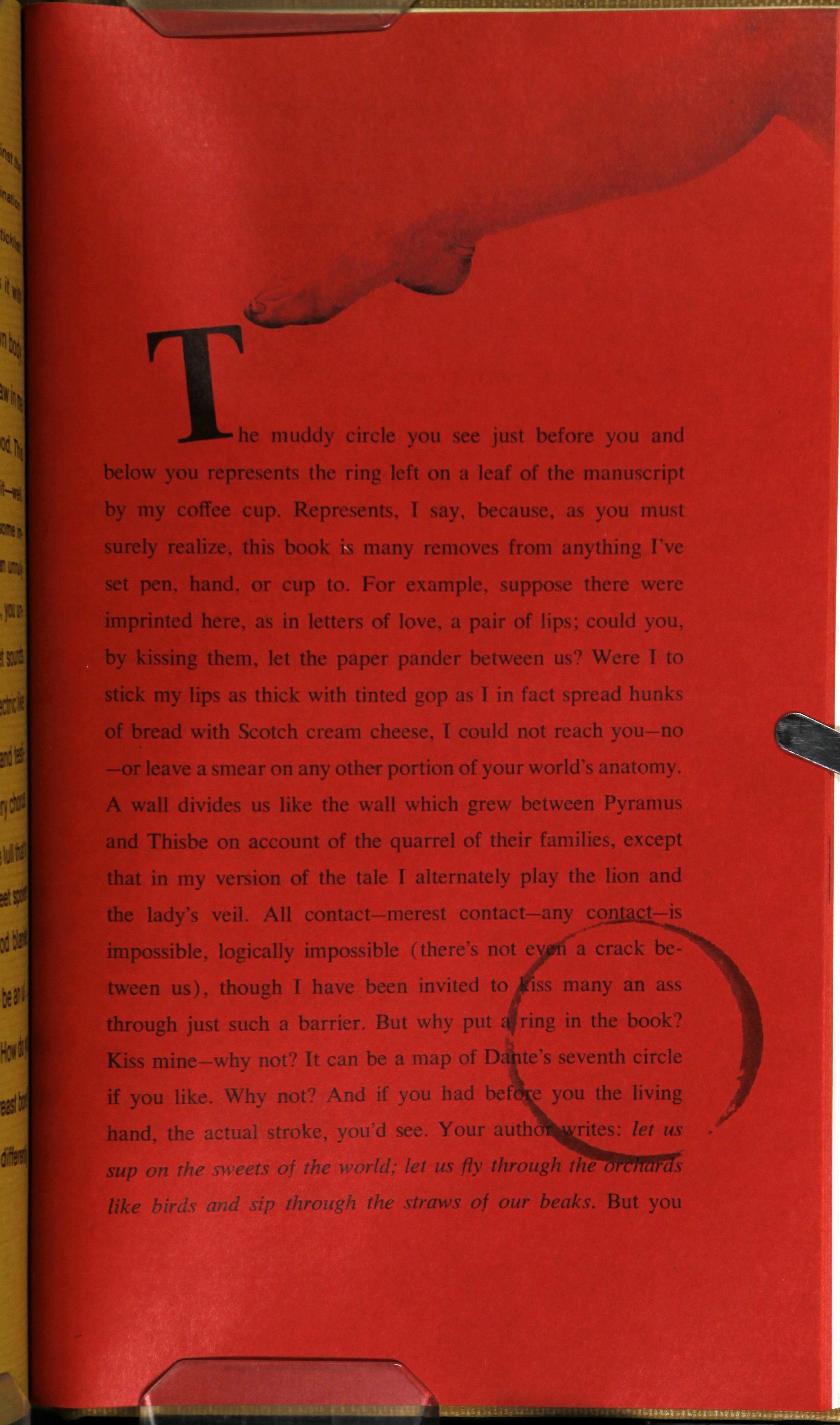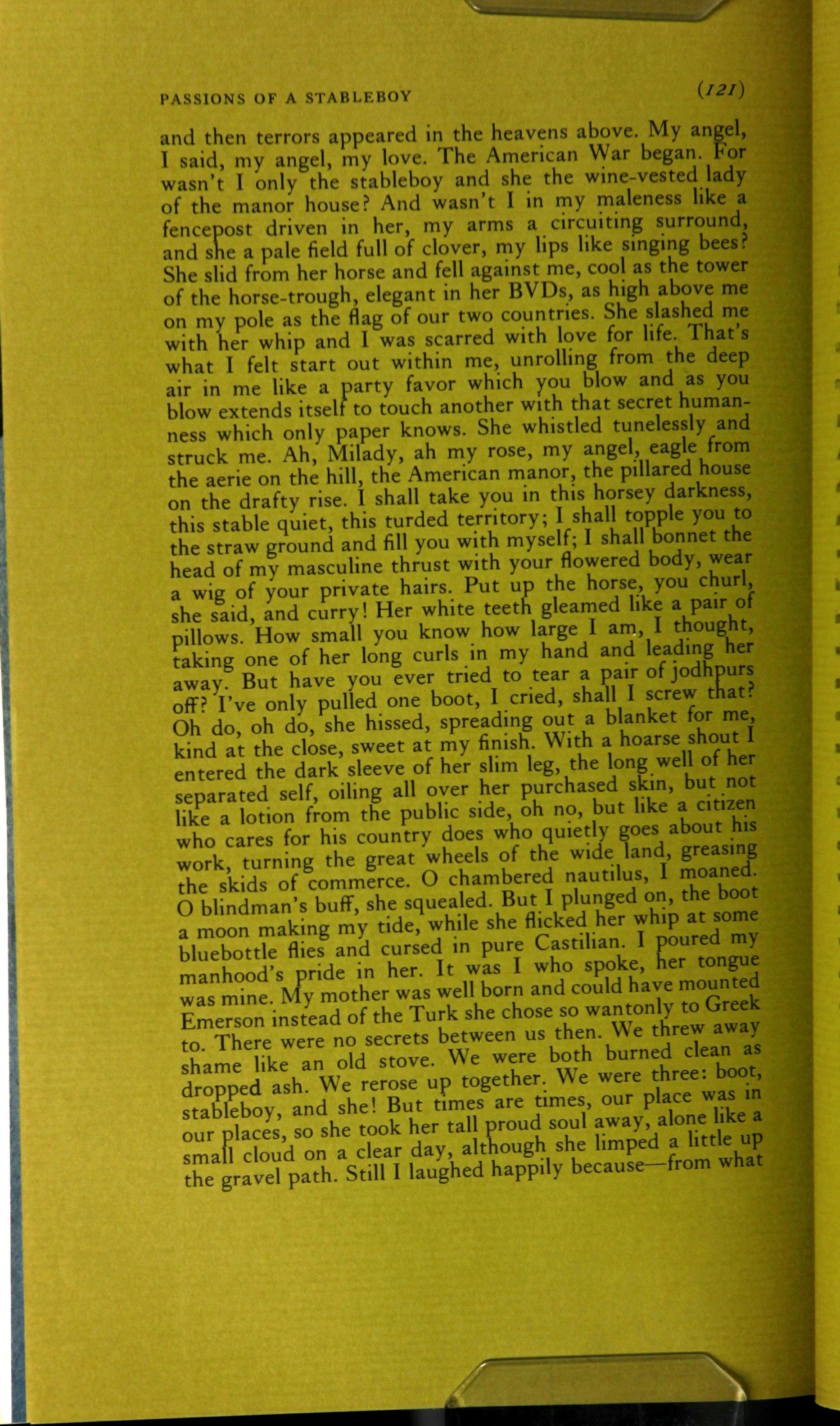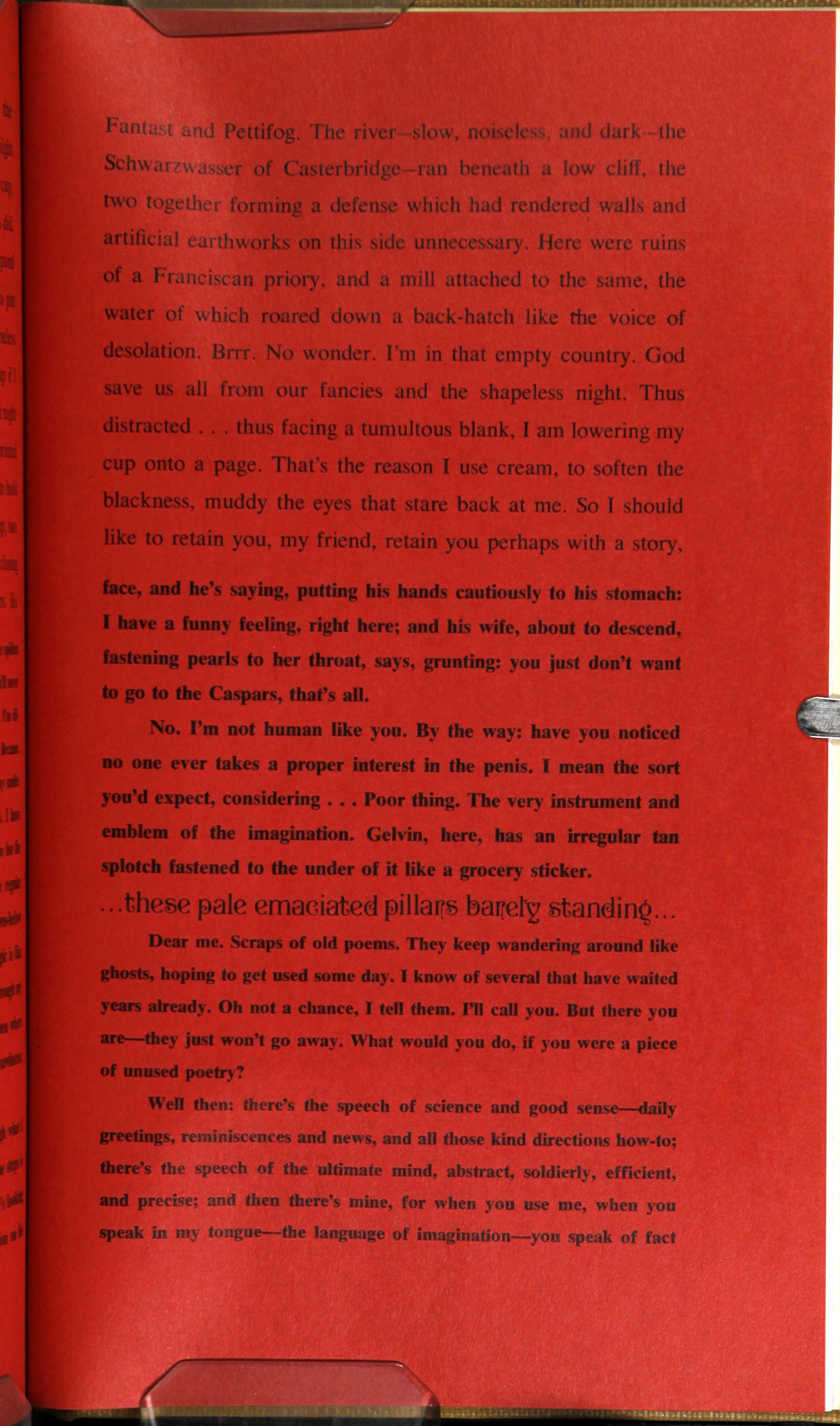 I am that lady language chose to make her playhouse of, and if you do not like me, if you find me dewlapped, scabby, wrinkled, old (and I've admittedly as many pages as my age), well sir, I'm not, like you, a loud rude noise and fart upon the town. But let's not quarrel. Though you'll not be back, your brother will. Tell him he is responsible for me, and that I give as good as I receive. If he will be attentive, thoughtful, warm and kind, I shall be passionate and beautiful. He should prepare to leave particularities behind, abandon envelopes and photos, trophies of all kinds, the ringing silver voice in which the tinny actor hides, his contraceptive sacks, his dirty pipes, his damn bow-ties; for I shall be quite singular enough to suit sly John the Scot himself, that canny philosopher who taught that Truth, though One, was irridescent as a plash of oil, and varied endlessly from spot to spot; John Scot, the wise, you may remember, who was murdered by his students, so the story goes, at the Abbey Malmesbury, with their pens; why, I can't imagine, for it was he who, dying of his pen wounds, said: how close, in the end, is a cunt to a concept we enter both with joy.