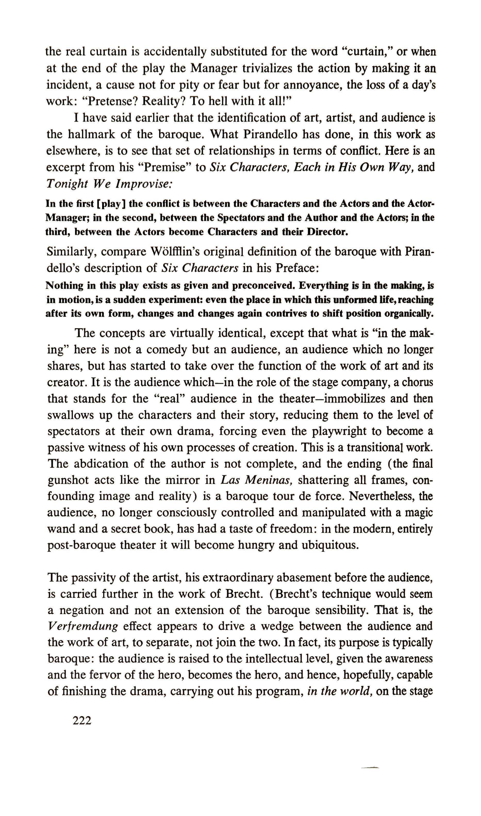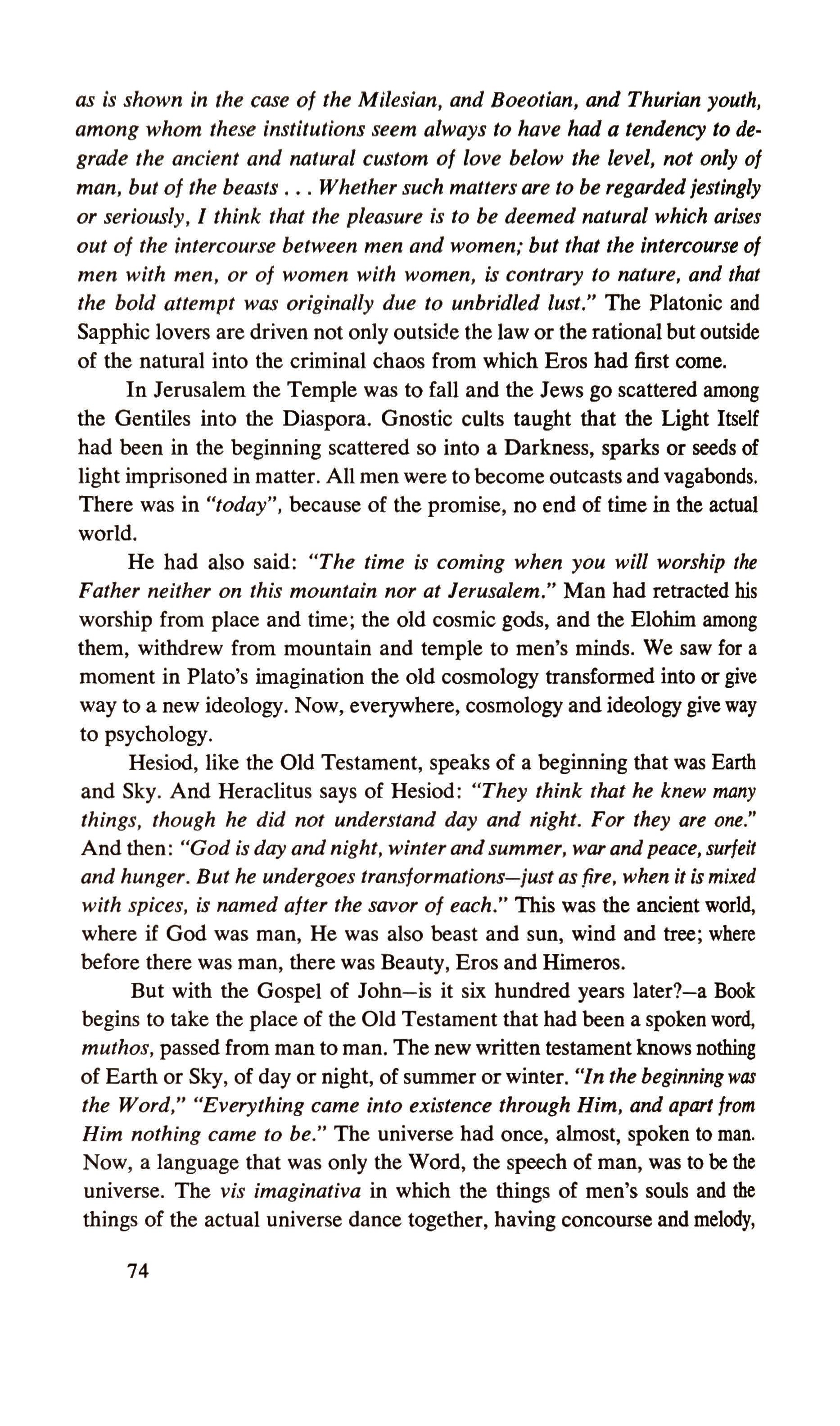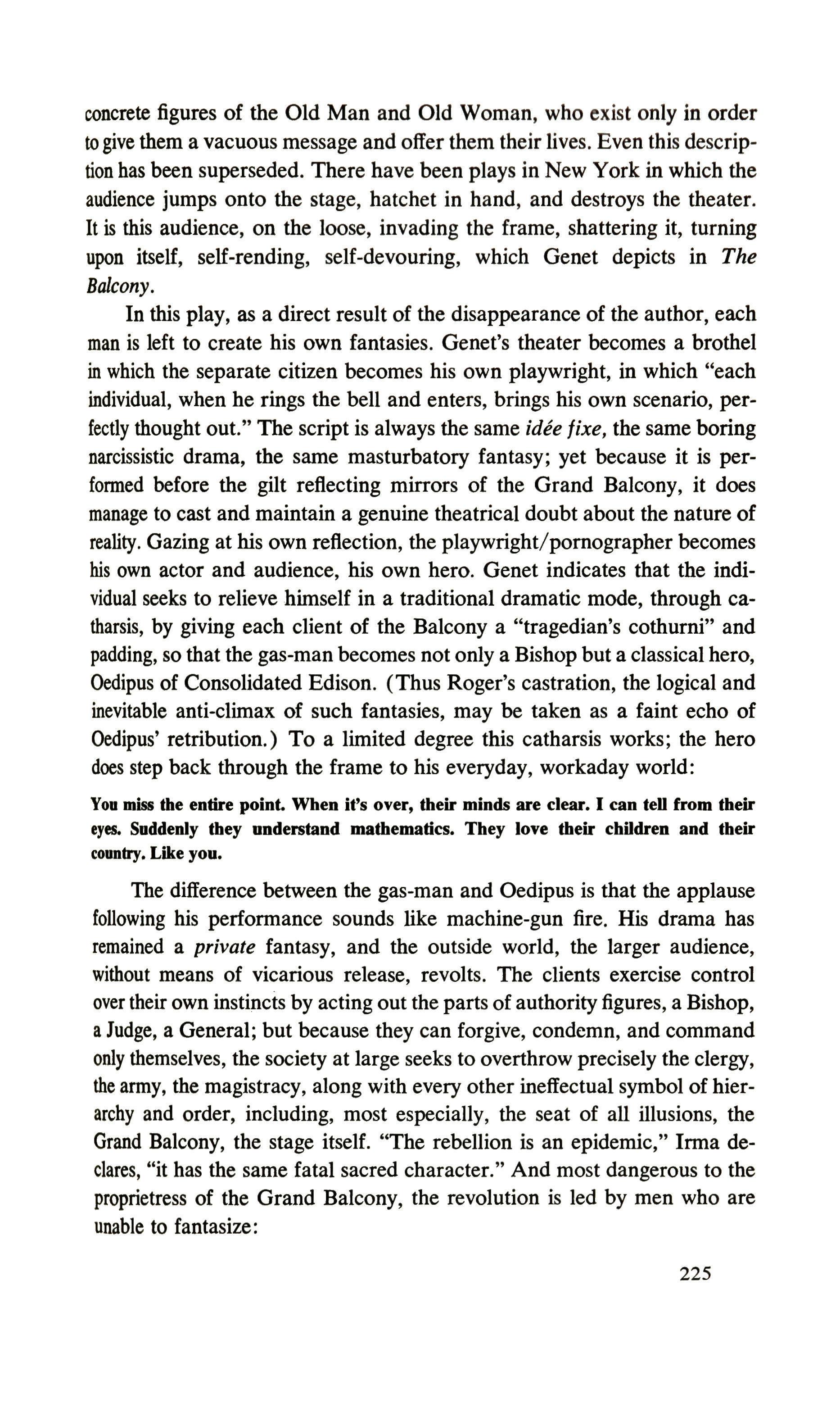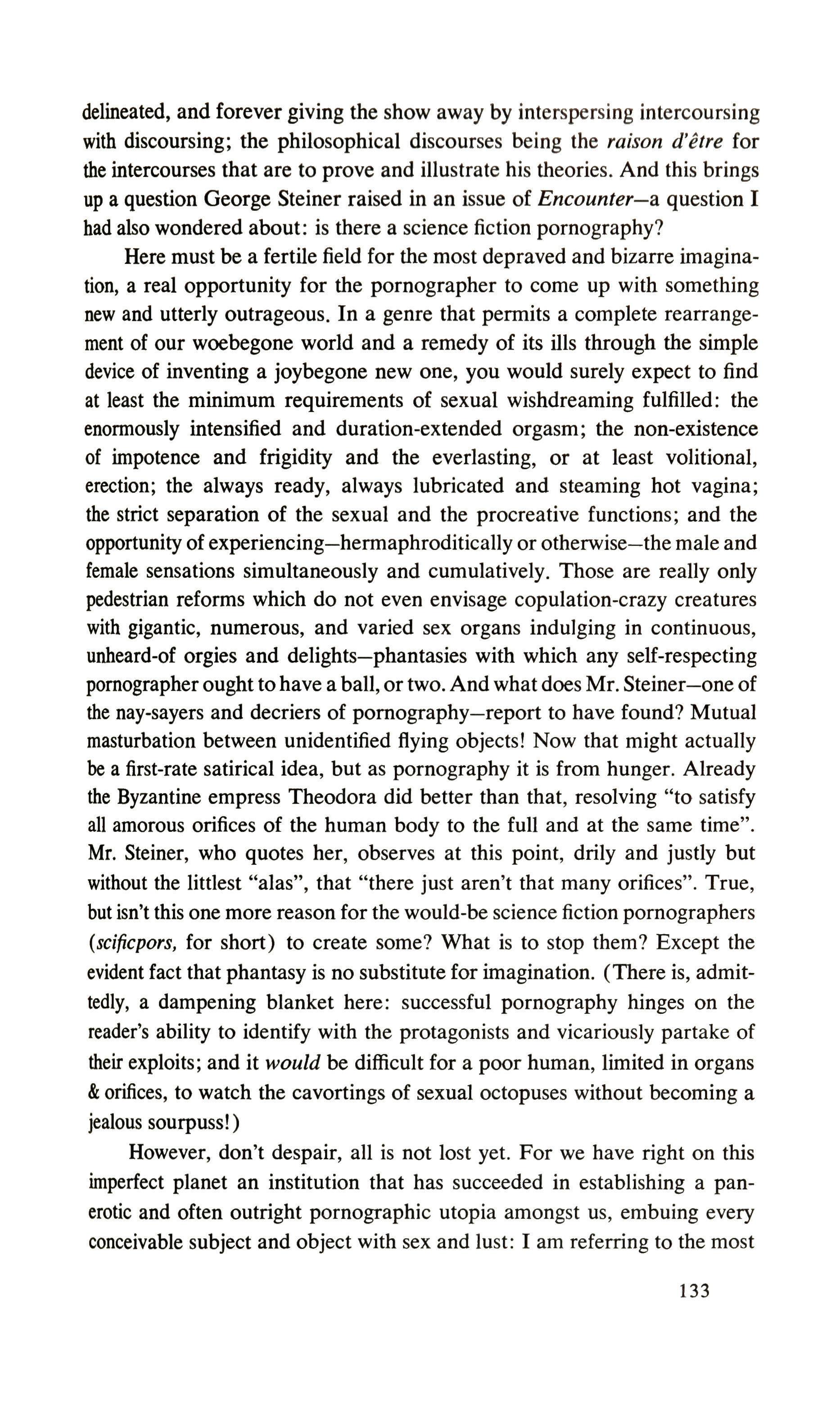 I am that lady language chose to make her playhouse of, and if you do not like me, if you find me dewlapped, scabby, wrinkled, old (and I've admittedly as many pages as my age), well sir, I'm not, like you, a loud rude noise and fart upon the town. But let's not quarrel. Though you'll not be back, your brother will. Tell him he is responsible for me, and that I give as good as I receive. If he will be attentive, thoughtful, warm and kind, I shall be passionate and beautiful. He should prepare to leave particularities behind, abandon envelopes and photos, trophies of all kinds, the ringing silver voice in which the tinny actor hides, his contraceptive sacks, his dirty pipes, his damn bow-ties; for I shall be quite singular enough to suit sly John the Scot himself, that canny philosopher who taught that Truth, though One, was irridescent as a plash of oil, and varied endlessly from spot to spot; John Scot, the wise, you may remember, who was murdered by his students, so the story goes, at the Abbey Malmesbury, with their pens; why, I can't imagine, for it was he who, dying of his pen wounds, said: how close, in the end, is a cunt to a concept we enter both with joy.