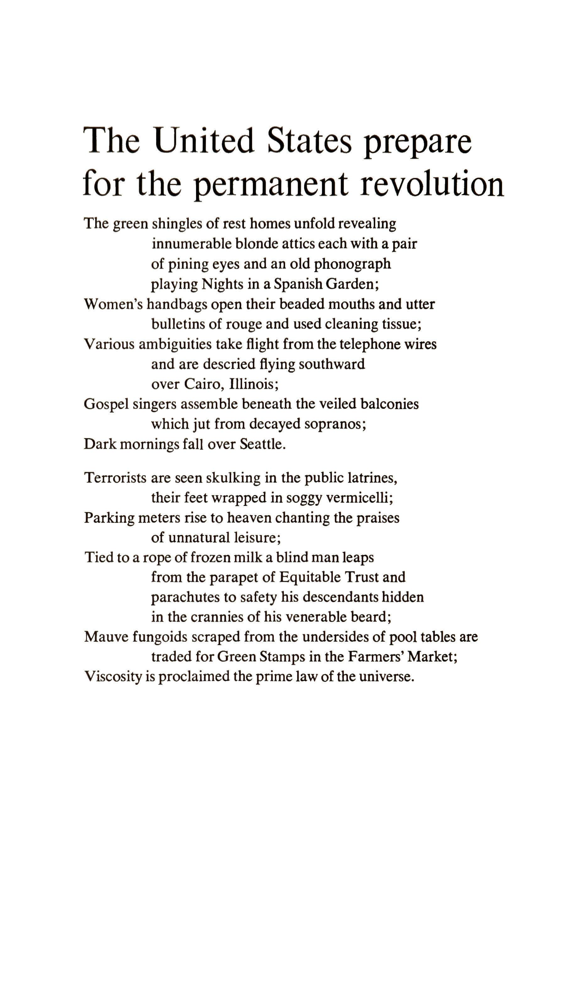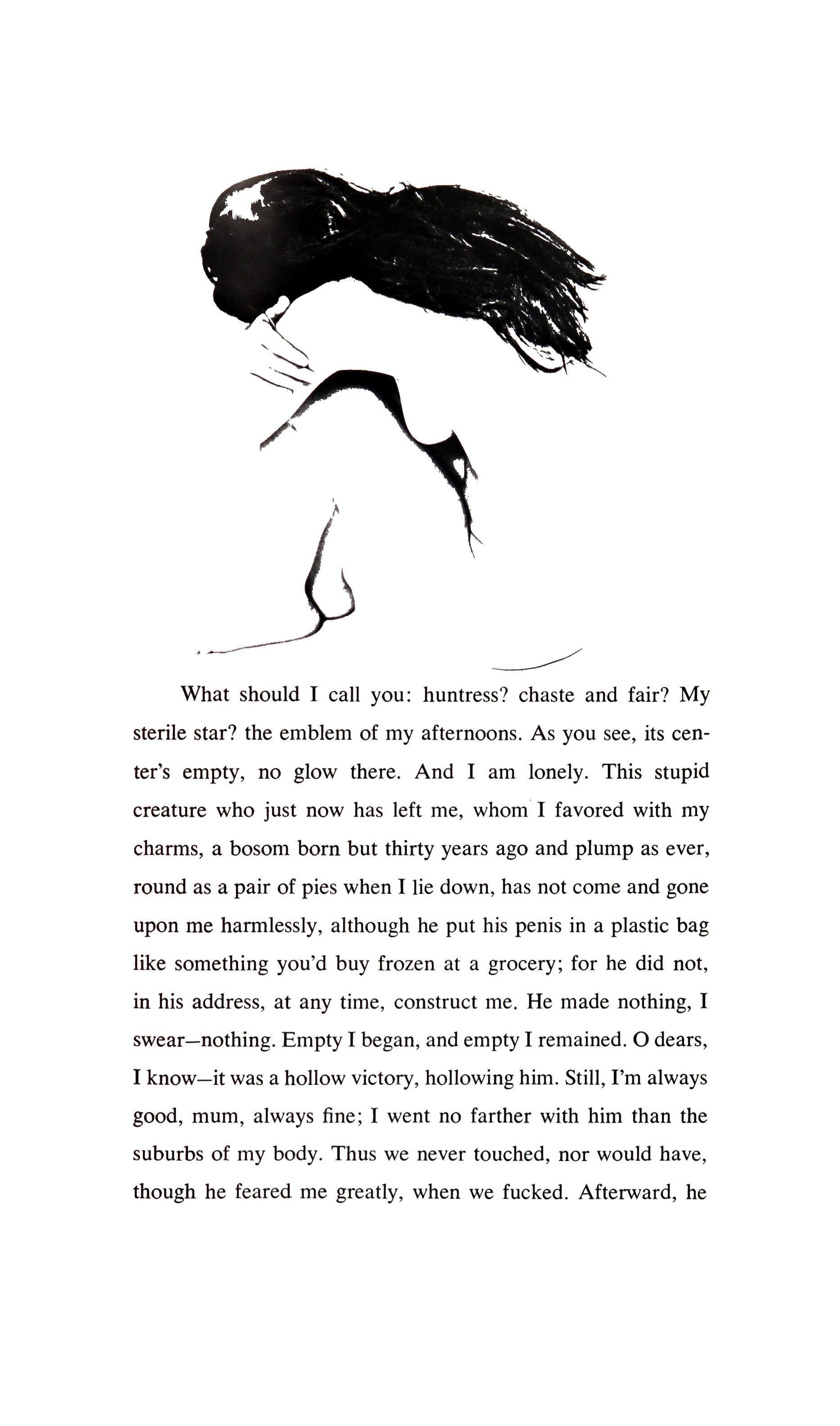 What should I call you: huntress? chaste and fair? My sterile star? the emblem of my afternoons. As you see, its center's empty, no glow there. And I am lonely. This stupid creature who just now has left me, whom I favored with my charms, a bosom born but thirty years ago and plump as ever, round as a pair of pies when I lie down, has not come and gone upon me harmlessly, although he put his penis in a plastic bag like something you'd buy frozen at a grocery; for he did not, in his address, at any time, construct me. He made nothing, I swear nothing. Empty I began, and empty I remained. 0 dears, I know it was a hollow victory, hollowing him. Still, I'm always good, mum, always fine; I went no farther with him than the suburbs of my body. Thus we never touched, nor would have, though he feared me greatly, when we fucked. Afterward, he