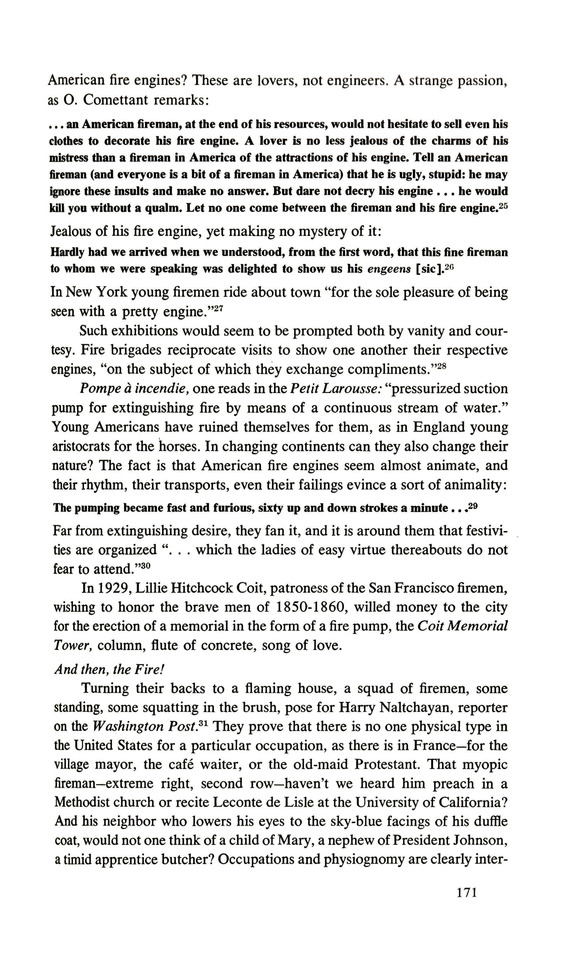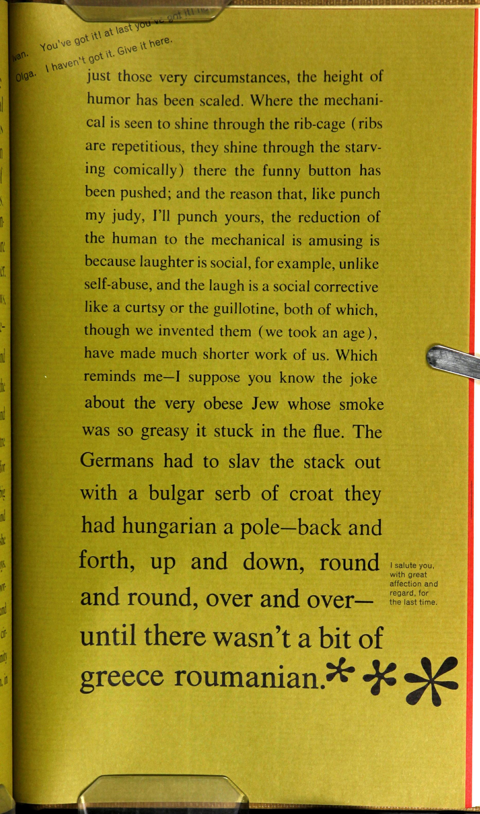 f Just those very circumstances, the height 0 humor has been scaled. Where the mechanical is seen to shine through the rib-cage (ribs are repetitious, they shine through the starving comically) there the funny button has been pushed; and the reason that, like punch my judy, I'll punch yours, the reduction of the human to the mechanical is amusing is because laughter is social, for example, unlike self-abuse, and the laugh is a social corrective like a curtsy or the guillotine, both of which, though we invented them (we took an age), have made much shorter work of us. Which reminds me I suppose you know the joke about the very obese Jew whose smoke was so greasy it stuck in the flue. The Germans had to slav the stack out