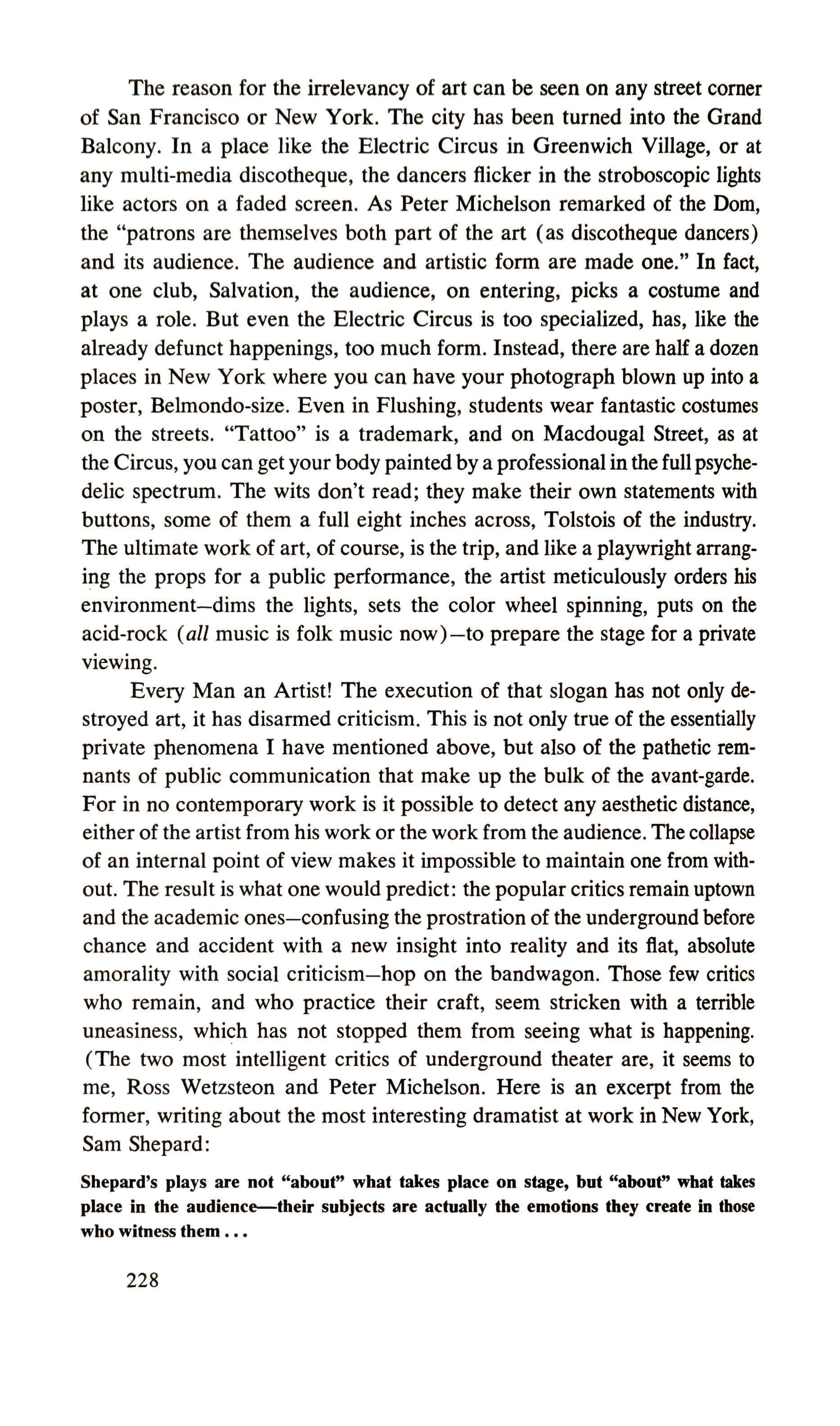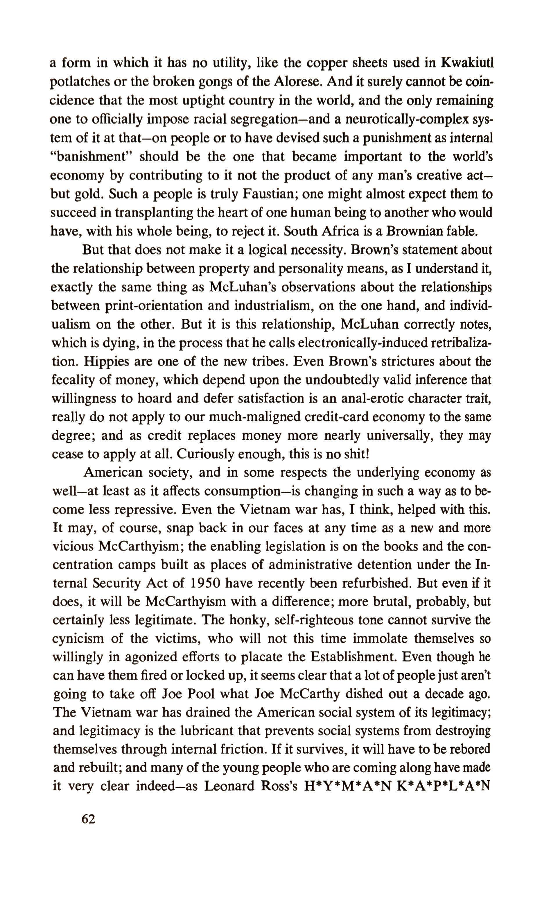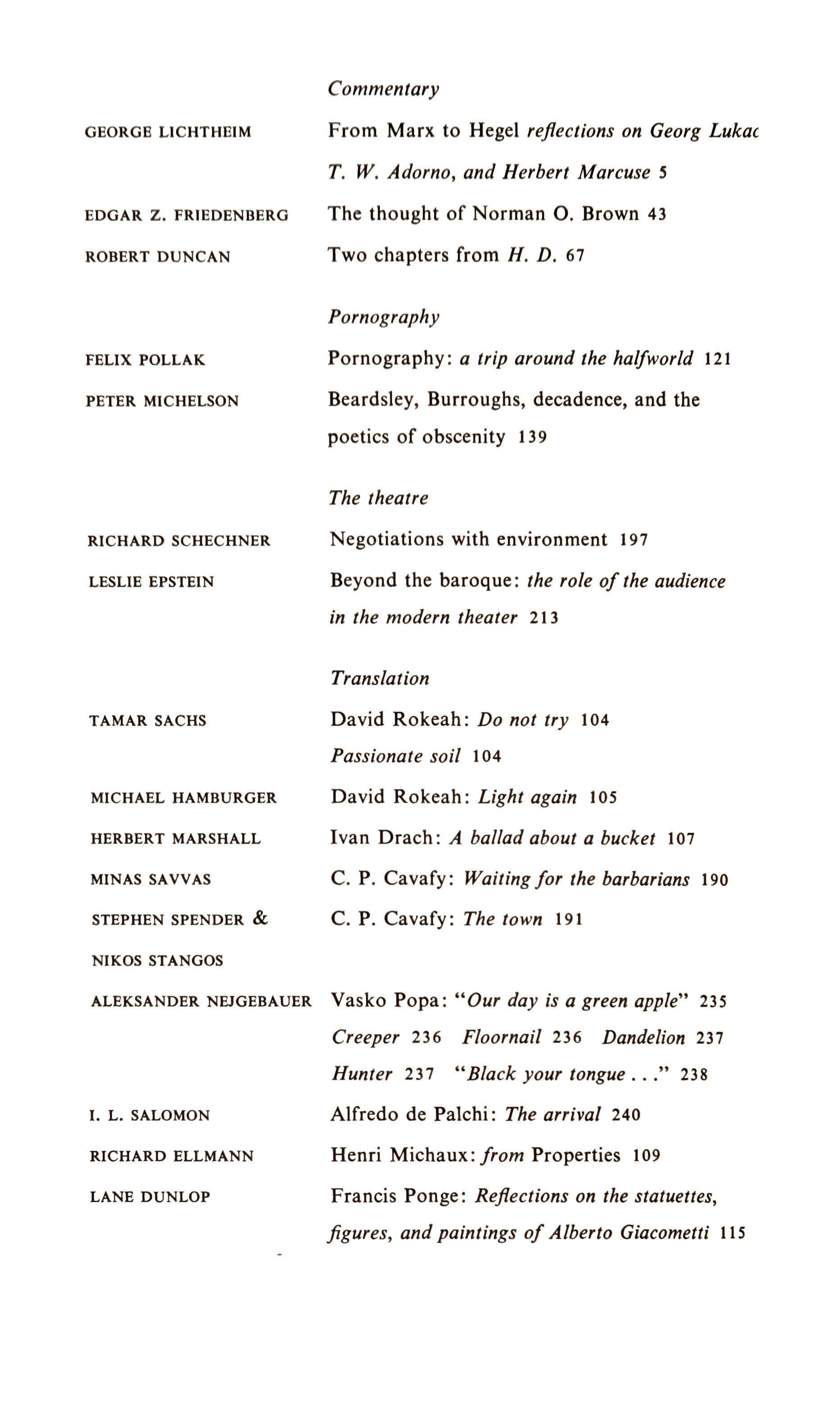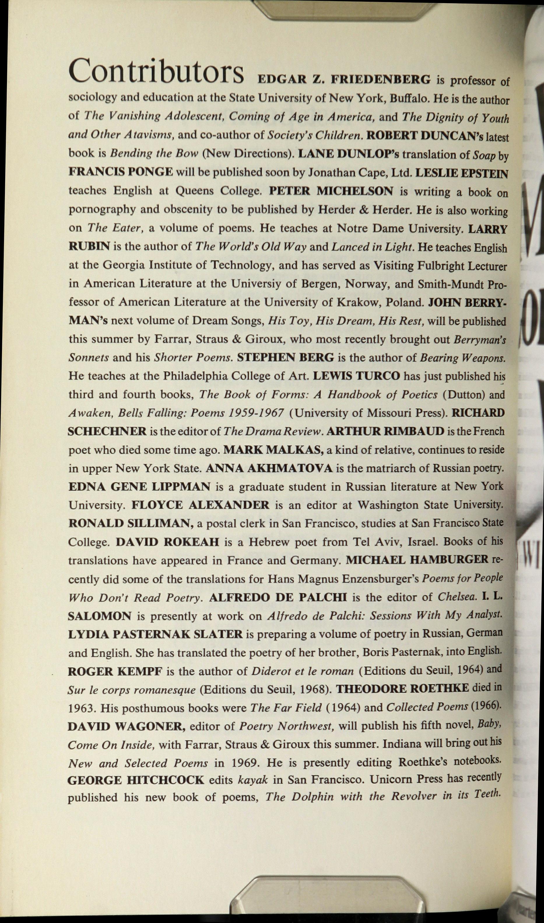 TriQuarterly is a national journal of arts, letters and opinion, published in the fall, winter and spring at Northwestern University, Evanston, Illinois. Subscription rates: $4.00 yearly within the United States; $4.25 Canada and Mexico; $4.75 Foreign. Single copies will be sold for $1.50. Contributions, correspondence and subscriptions should be addressed to TriQuarterly, University Hall 101, Northwestern University, Evanston, Illinois. Unsolicited manuscripts are welcome, but will not be returned unless accompanied by a self-addressed stamped envelope. All manuscript accepted for publication becomes the property of the editors, unless otherwise indicated. Copyright © 1968 by Northwestern University Press. All rights reserved. The views expressed in this magazine are to be attributed to the writers, not the editors or sponsors.