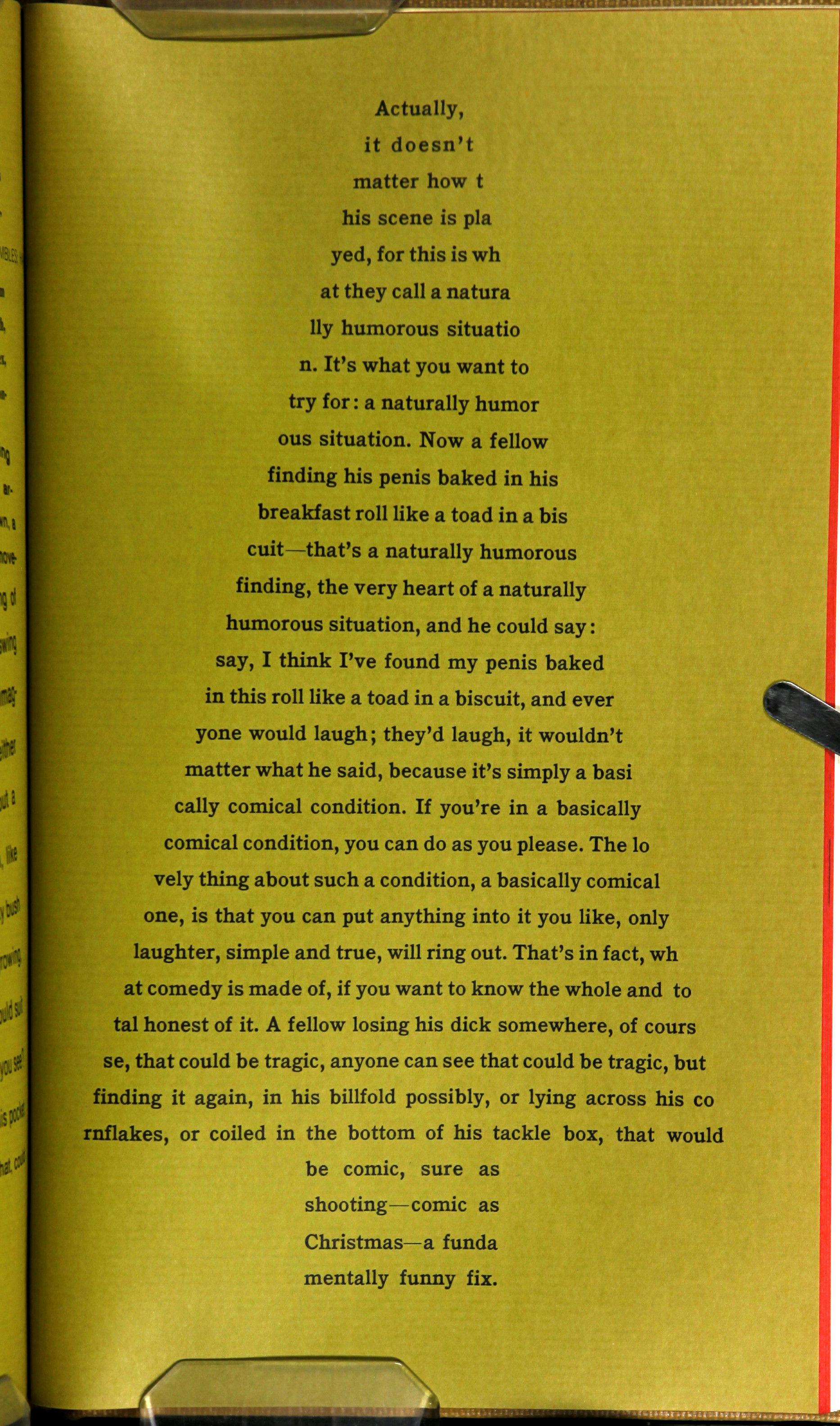 n. It's what you want to try for: a naturally humor ous situation. Now a fellow finding his penis baked in his breakfast roll like a toad in a bis cuit that's a naturally humorous finding, the very heart of a naturally humorous situation, and he could say: say, I think I've found my penis baked in this roll like a toad in a biscuit, and ever yone would laugh; they'd laugh, it wouldn't matter what he said, because it's simply a basi cally comical condition. If you're in a basically comical condition, you can do as you please. The 10 vely thing about such a condition, a basically comical one, is that you can put anything into it you like, only laughter, simple and true, will ring out. That's in fact, wh at comedy is made of, if you want to know the whole and to tal honest of it. A fellow losing his dick somewhere, of cours se, that could be tragic, anyone can see that could be tragic, but finding it again, in his billfold possibly, or lying across his co rnfiakes, or coiled in the bottom of his tackle box, that would be comic, sure as shooting-comic as Christmas a funda mentally funny fix.