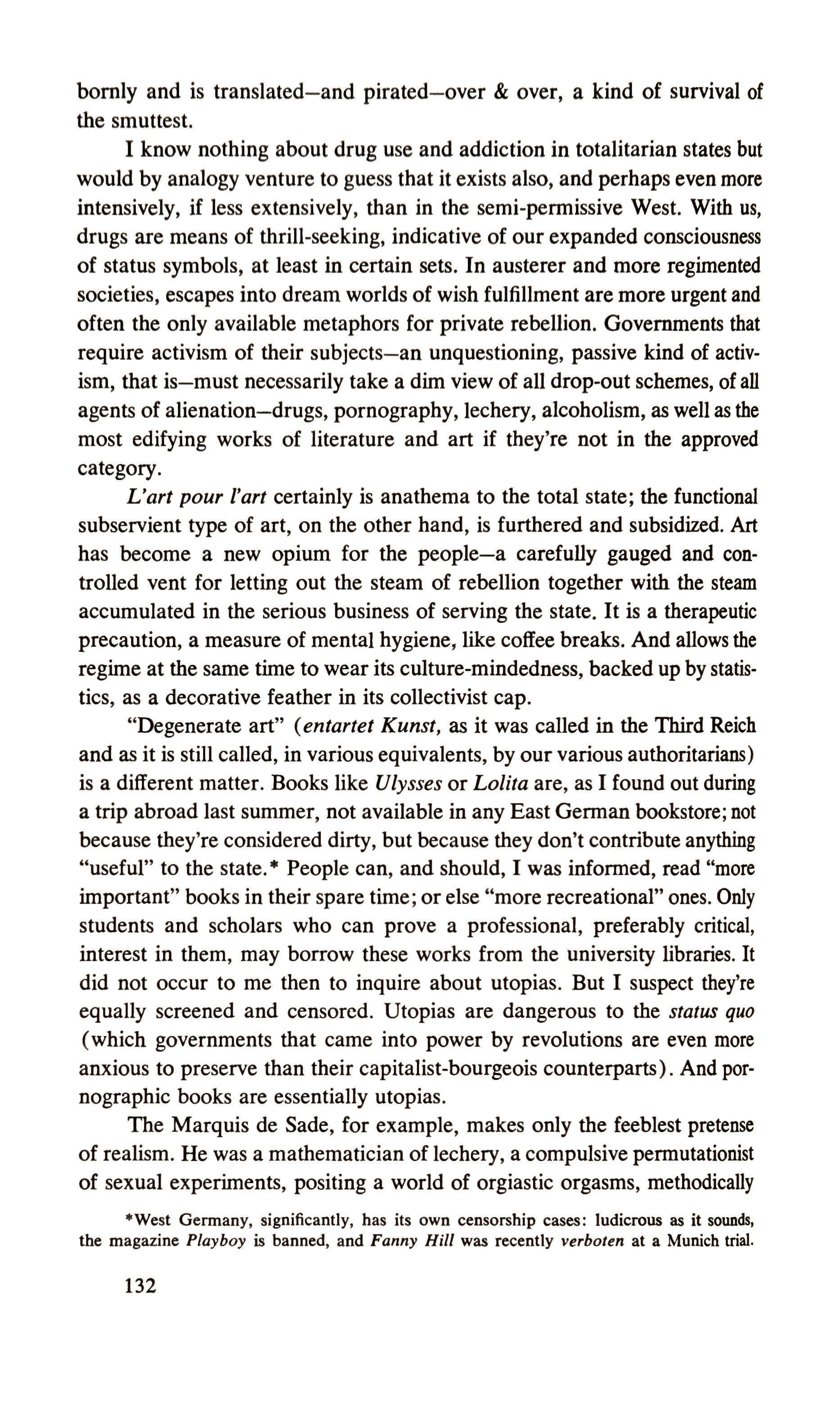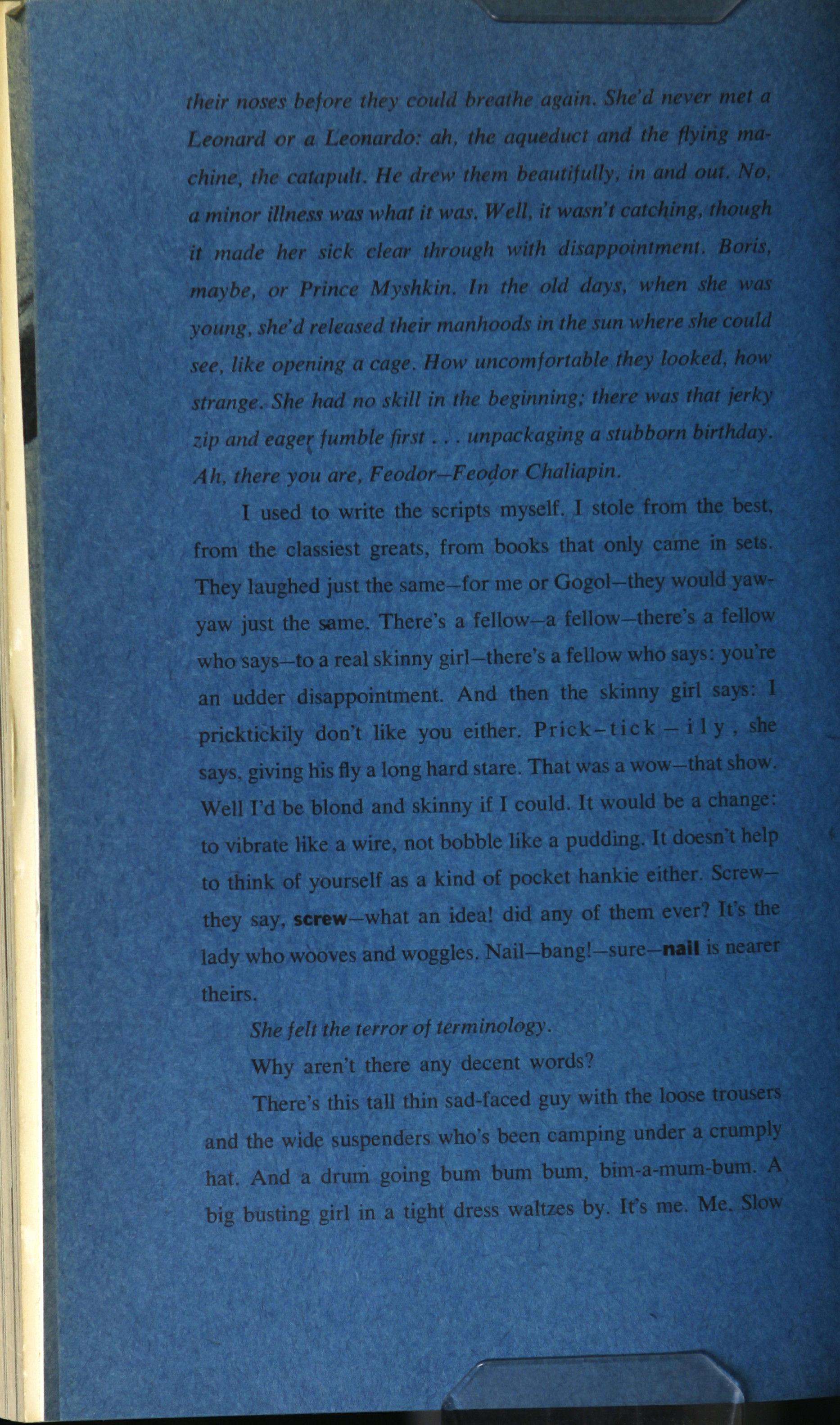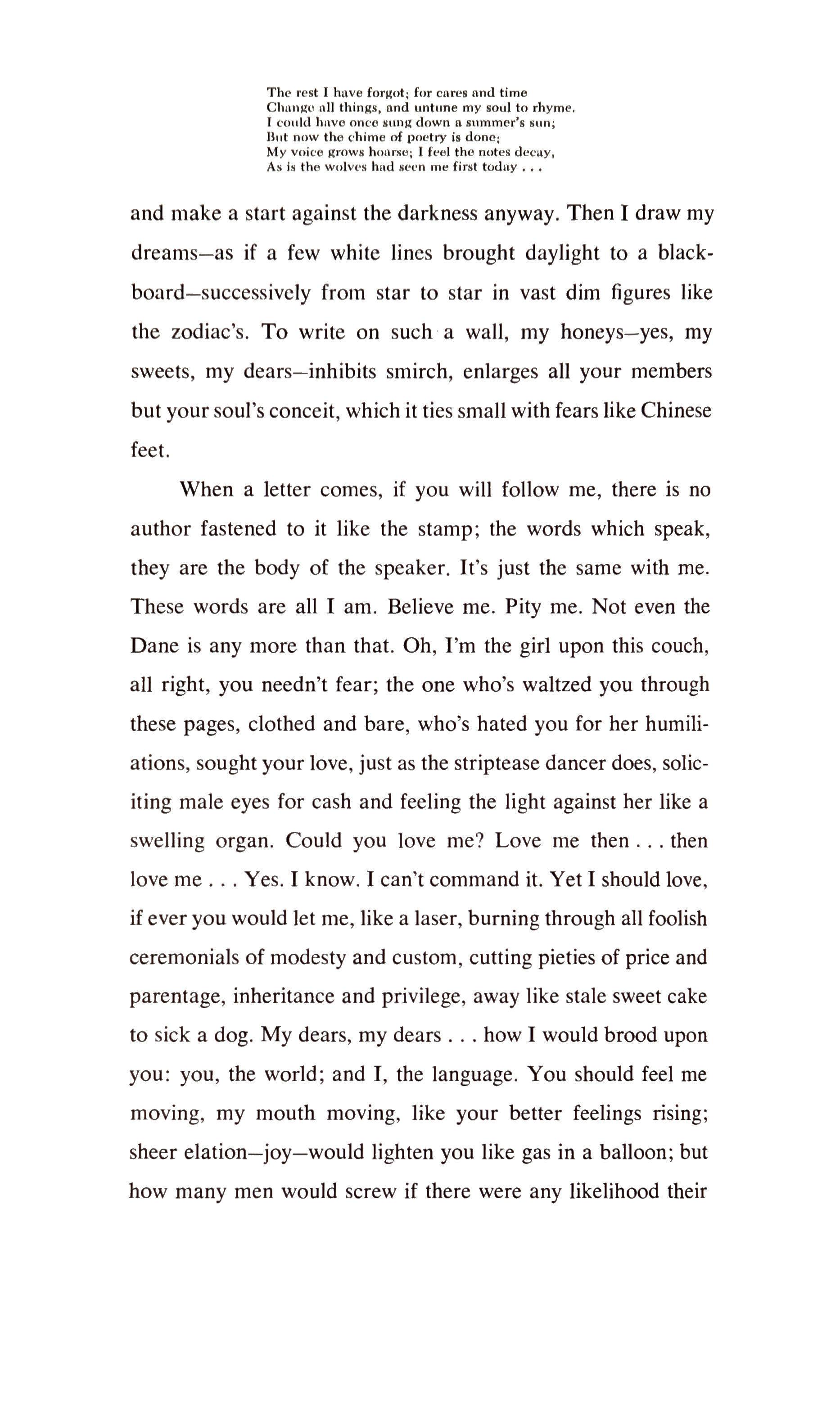 When a letter comes, if you will follow me, there is no author fastened to it like the stamp; the words which speak, they are the body of the speaker. It's just the same with me. These words are all I am. Believe me. Pity me. Not even the Dane is any more than that. Oh, I'm the girl upon this couch, all right, you needn't fear; the one who's waltzed you through these pages, clothed and bare, who's hated you for her humiliations, sought your love, just as the striptease dancer does, soliciting male eyes for cash and feeling the light against her like a swelling organ. Could you love me? Love me then then love me Yes. I know. I can't command it. Yet I should love, if ever you would let me, like a laser, burning through all foolish ceremonials of modesty and custom, cutting pieties of price and parentage, inheritance and privilege, away like stale sweet cake to sick a dog. My dears, my dears how I would brood upon you: you, the world; and I, the language. You should feel me moving, my mouth moving, like your better feelings rising; sheer elation joy would lighten you like gas in a balloon; but how many men would screw if there were any likelihood their
