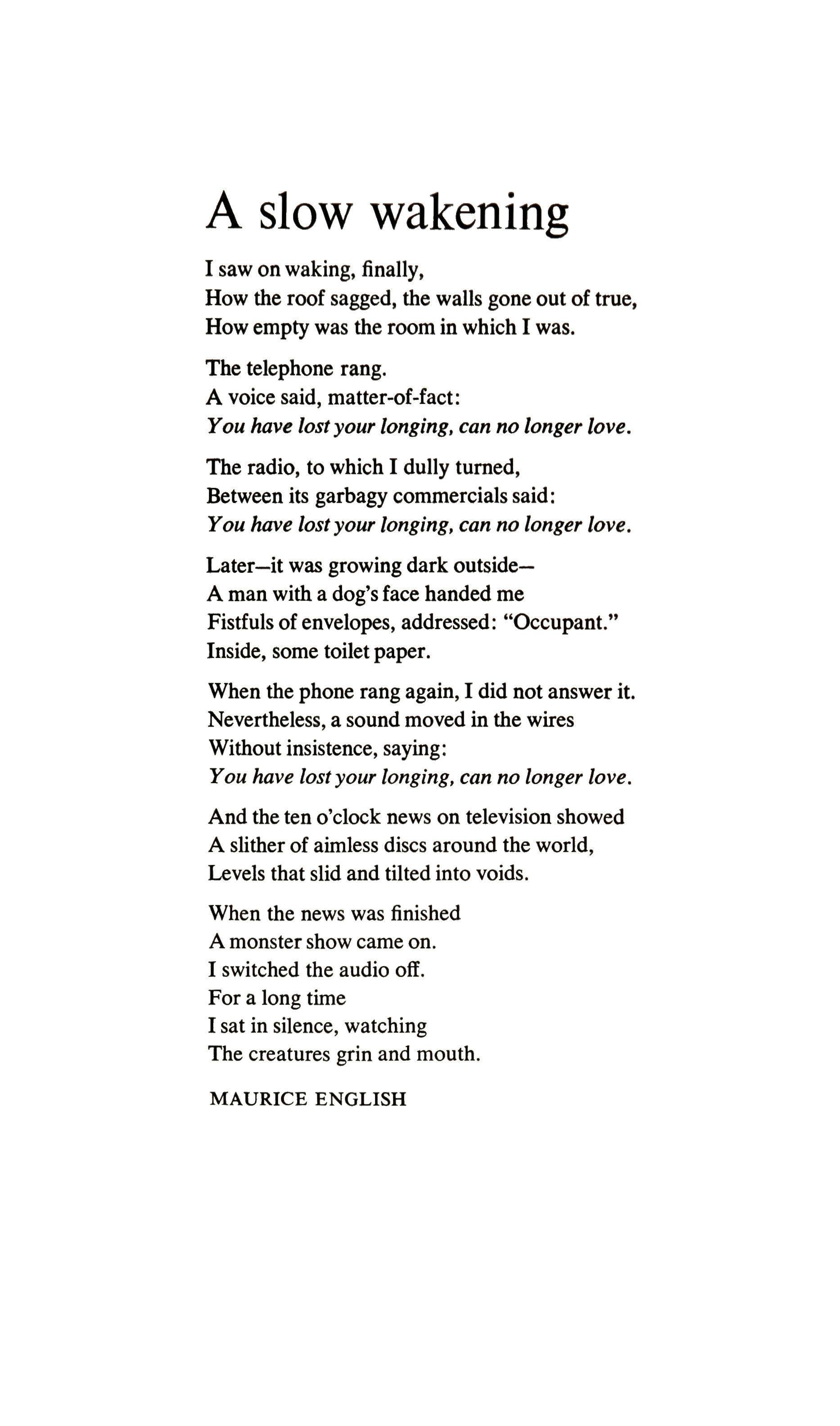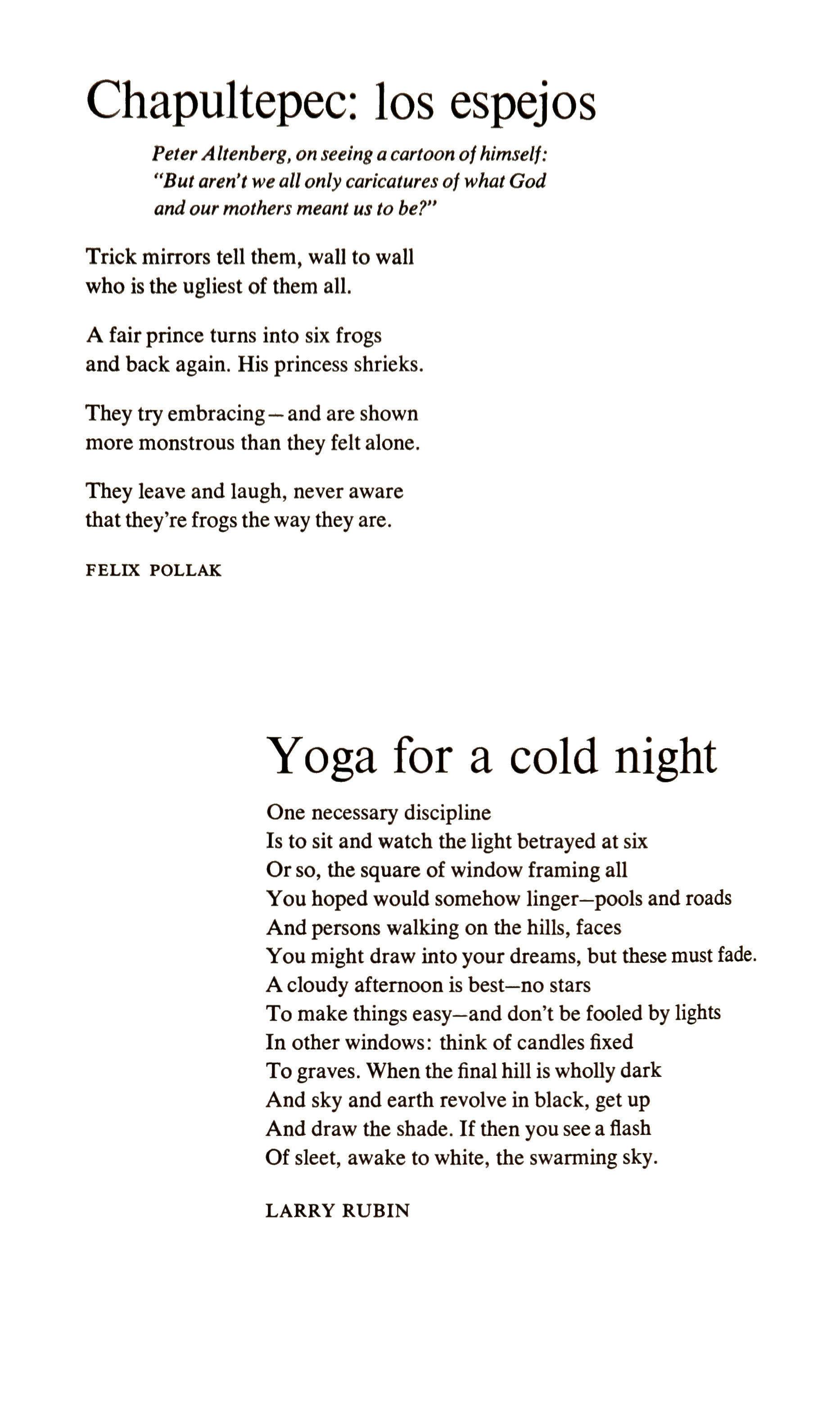 The rest I have forgot, for cares and time Cburure 111I things, and untune my soul to rhyme. r could hnve once Slln!! down a summer's sun, But II()W the chime of poetry is dono; My voice grow. hoarse, I Feel the notes decuy, As is the wolves had seen me first today and make a start against the darkness anyway. Then I draw my dreams as if a few white lines brought daylight to a blackboard successively from star to star in vast dim figures like the zodiac's. To write on such a wall, my honeys yes, my sweets, my dears inhibits smirch, enlarges all your members but your soul's conceit, which it ties small with fears like Chinese feet.