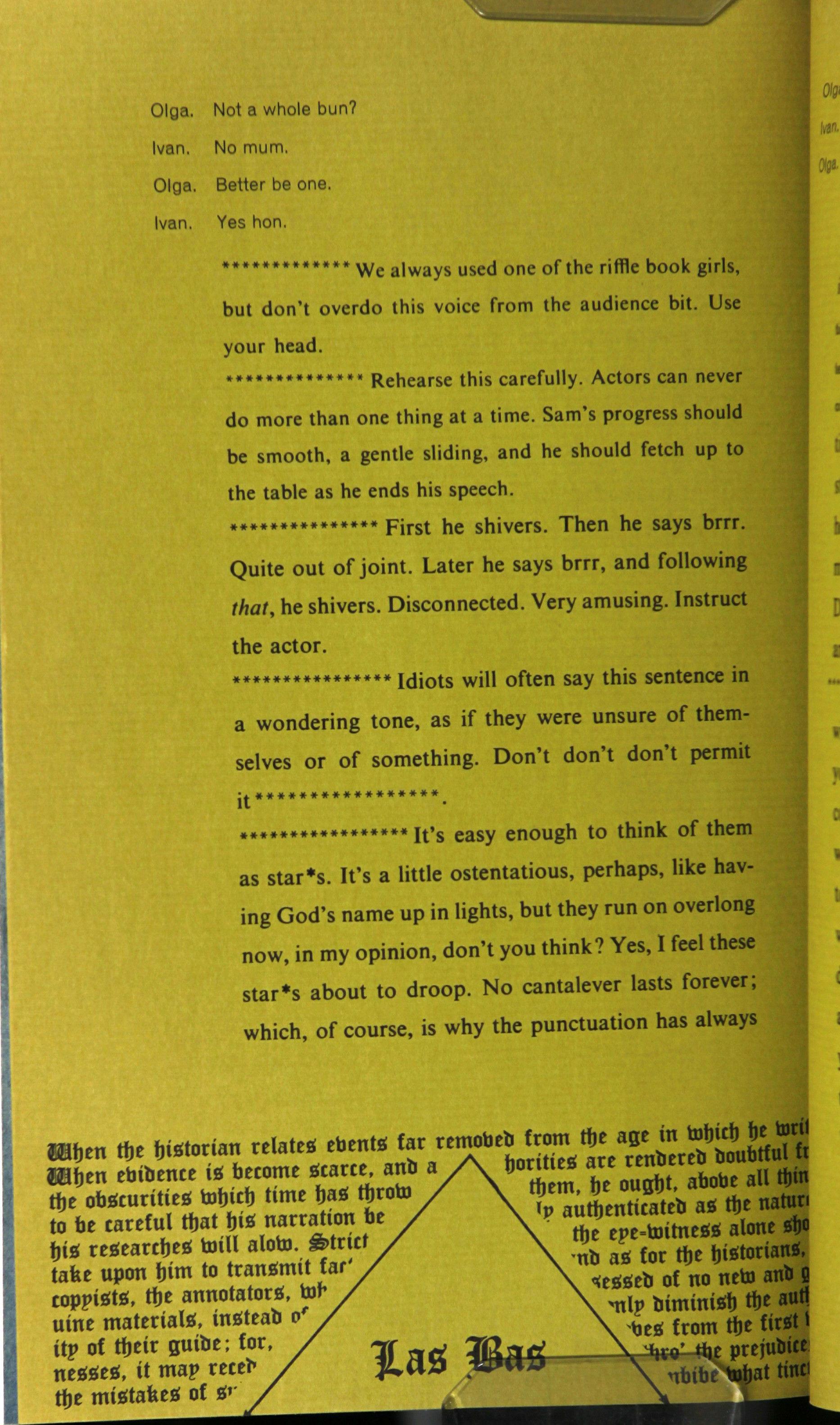 During this great and moving speech the actress playing Olga must try to keep still, not peep over the top of her paper, stir noisily, waggle her foot or show more of her twot than the situation calls for. This is asking for a lot and will be hard. The chief trouble with the stage is that all the actors normally are alive. Everything else is dead as dumbbells but the actors and they're alive. It's incongruous. She's also not to wiggle during the music. All you can do is try. Beg. Plead. Still, she'll wiggle. I always did. The stage it's a mug's game.
