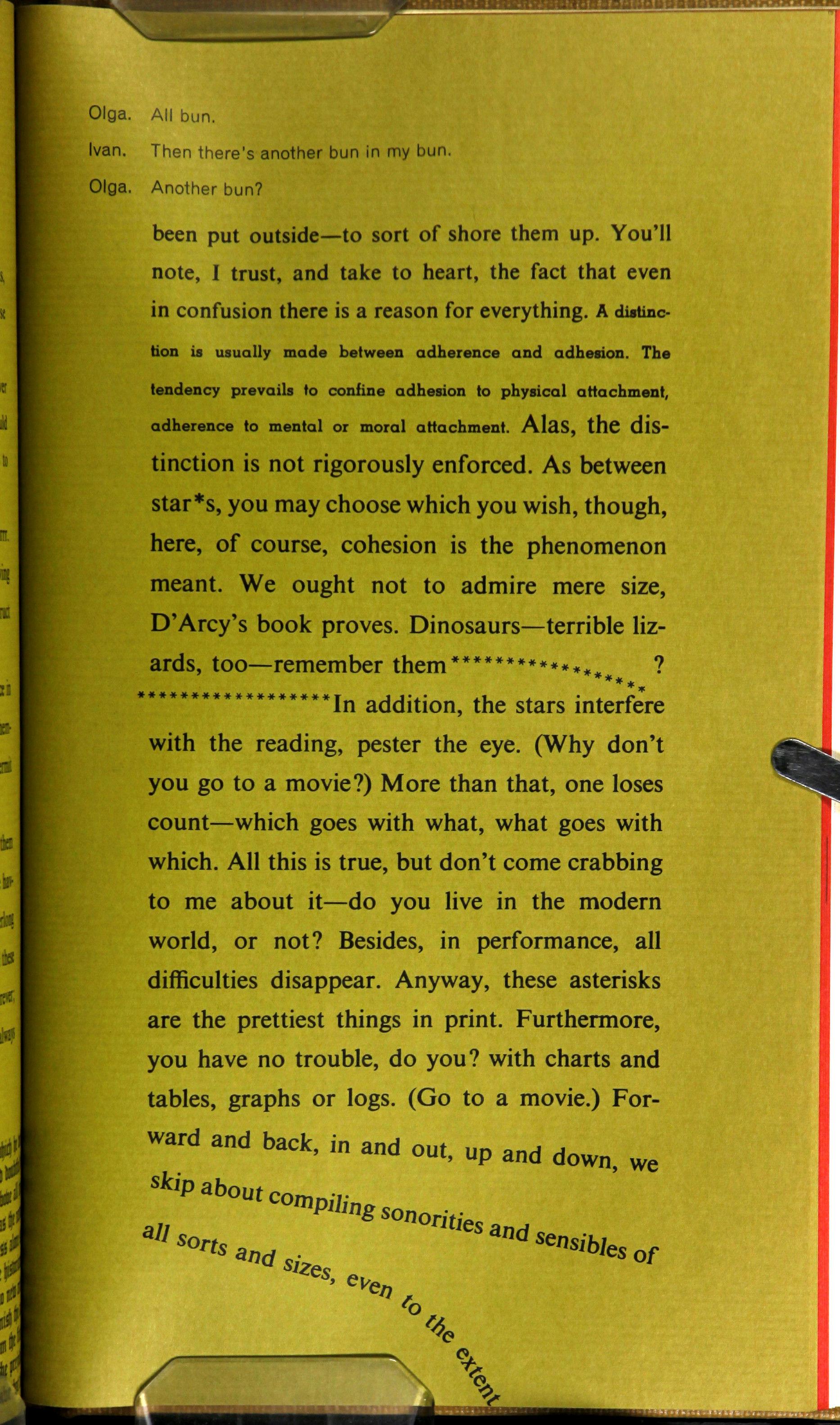 ***********************Contrast is the essence of the comic. Got that? Jesus, it breaks me up. There are all kinds: Olga loud and Ivan soft; Olga tough and brassy, Ivan soft; Olga mountainously rumped and titted, Ivan soft; Olga precipitously cunted, but Ivan soft. The language, too, is sometimes loud and tough and brassy, crude and local, momentary, cheap and jazzy, sometimes euphonious and memorable, swift and flossy, technical and double-jointed. The tone, too, alternates between disgust and dismay, scorn and revulsion, condescension and contempt. Etc