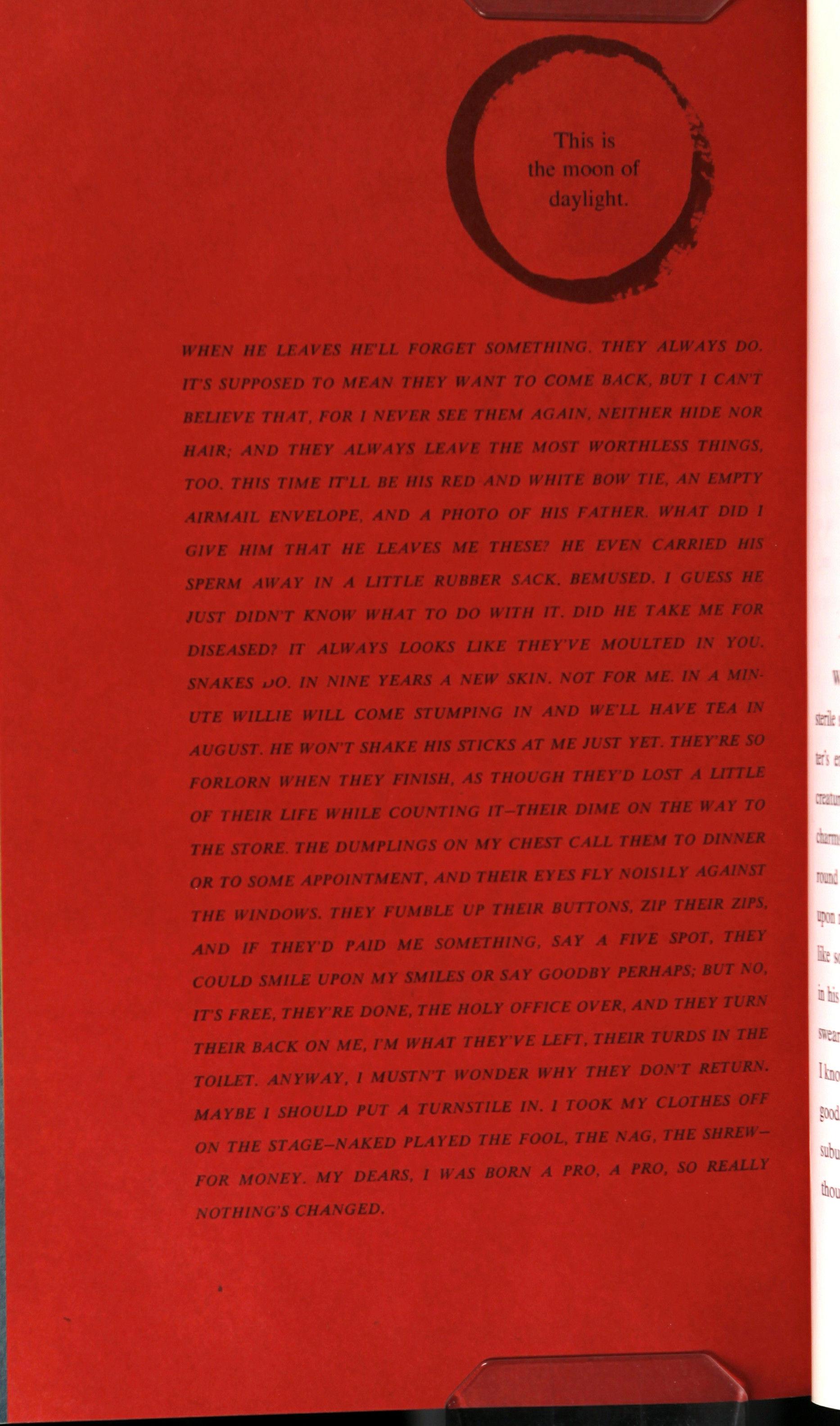 carried his seed off safely in a sack. Well, what the hell he's some hybrid maybe, strain of Burpee, supergiant, extra early, so I should, had he not worn his celloguard, have been but seven months to bud, a week to bloom, and three more days to fruiting. This moon, then, is something like me. For one thing, I'm an image. I still reflect the spots which lit me all those years. I turned in them, revolved you know the way it was I shook. My hands felt for me, slowly slid along my thighs so every customer could dream his own were sliding slowly in that sliding place. Poor gentlemen. I'd like to laugh at them because I cannot cry. Well, I'm no longer the nooky-look-see sort of tease I was, I can tell you that. I used to sweep my nipples clean and blacken the stage in a single gesture. Their own straining undid them, you know the starting of their eyes, the stare; it was never as dark as it seemed. Anyhow, that's the way it worked: I gave them tantalizing glimpses, passed behind clouds constantly, or simply changed my shape into a mouth, to a curl, to a shiver. Sometimes an actress, shut up in her dressing room, loses herself in her role and emerges a queen; but I moult my dress and panties on the stage and only wish it were another, not myself, that I discover. Then I dispose my flesh to pretense like a paper napkin; put on passion as I. put on paint and powder; try to believe I've flung my body in the wings and out of seeshot with my spangles. Still, wherever I am, I'm lonely. Night frightens me. I do not watch the moon there. Only by daylight, when it seems almost a tissue, frail and antic, can I bear it and its scrutiny. I want to have familiar things around me when a man is on me; he'll be too strange, too foreign for me, otherwise. Something unforeseen might happen. It must have the carpet,