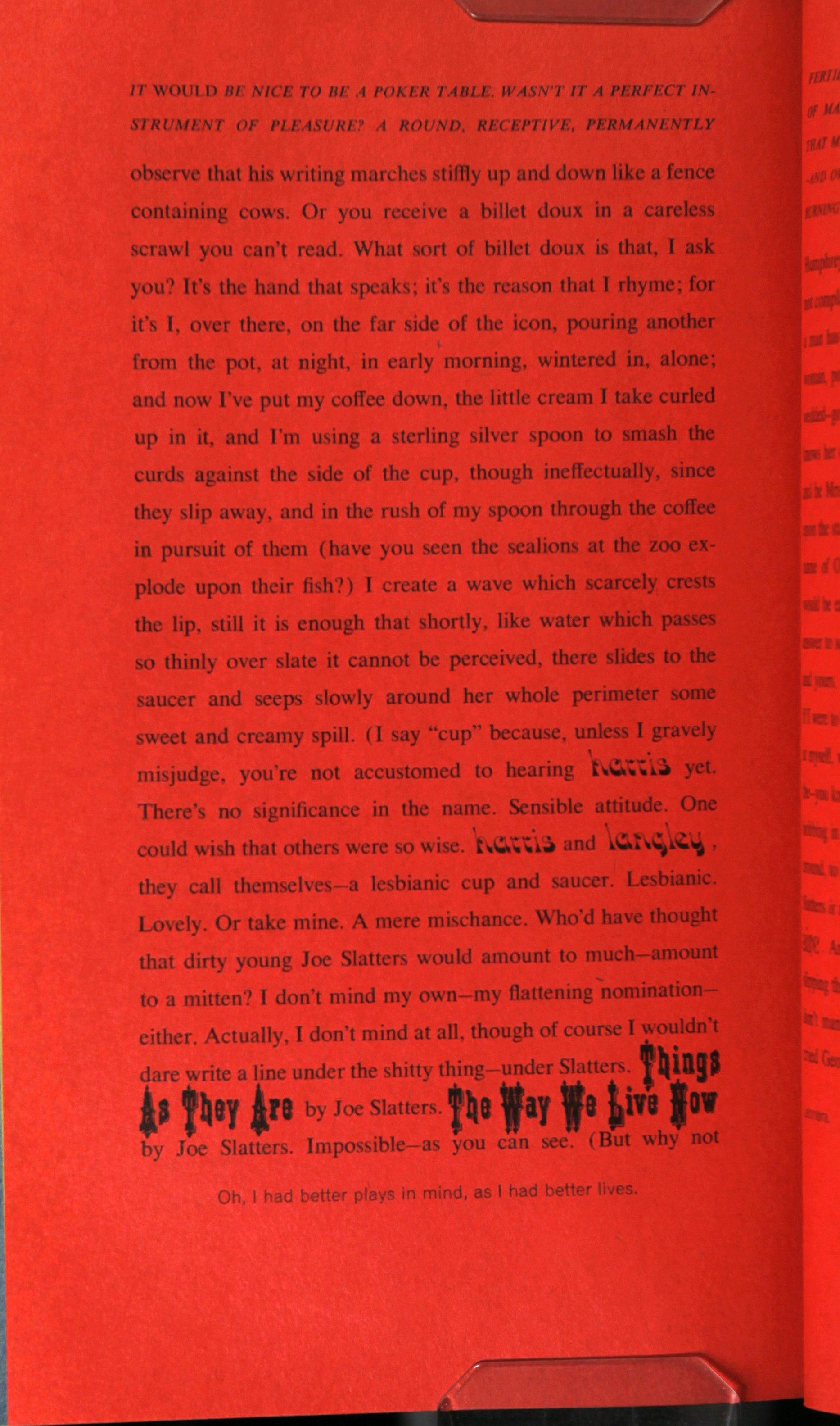 I'LEASUREf A It.OUND. "BC�I'TIY., I'DMIAN observe that bJa writinSlilarches tUlly Up and rawl you can't I cad. \'lhlt sort d. billet dou" ia you? It' the hand that : it' the that I it' I, over there, on the far side of the icon, the pot, at night, in early m I, win and now I've put my coffee down, tho little CI�iil I up in it. and I'm using a sterling silver CIII.ls &pinst the ide of the cup, though iDe they lip away, and in the rush of my in pursuit of tbellt (have you seen the upon their fish?) 1 create a wave which the lip, still it is enough that shortly. like walei' so thinly over slate it be saucer and seeps slowly her sweet and creamy spill. (I say "cup" because, misjudge, you're not ICCIlmAlled to There's no significance in the name. could wish that were so wise. they call themselves a lesbianic cup amd saucer. Lovely. Or take mine. A mere ml Who d that dirty young Joe Slatters would amount to to a mitten? I don't mind my own my fta either. Actually, I don't mind at all, though of dare write a line under the shitty thing l.ode. Slatters. fl by Joe Slatters. by Joe Slatters. Impossible-as you can see. ( ut