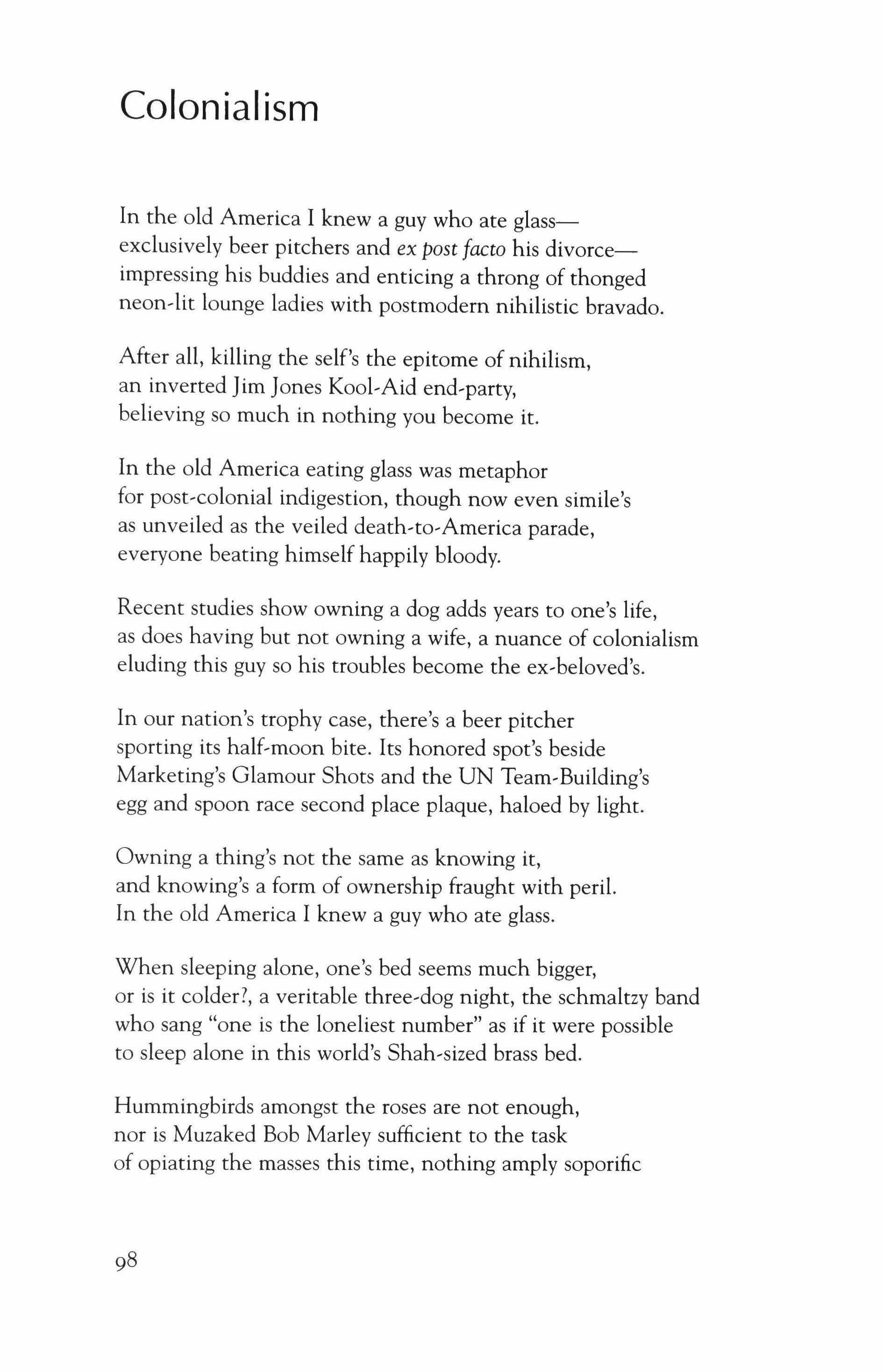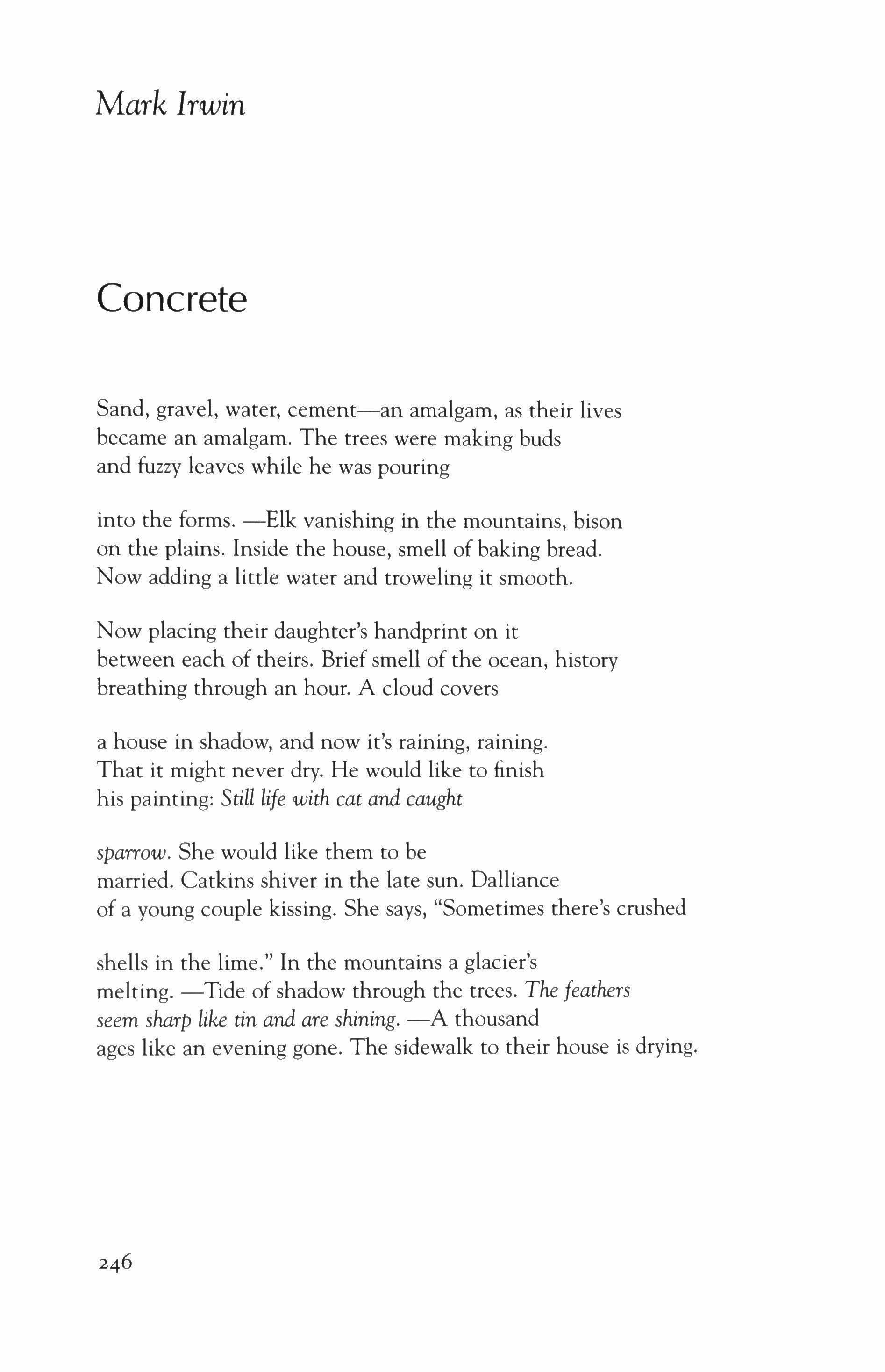 can Voice, Bennington Review, Southwest Review, and the Ontario Review, among other journals. A.G. Harmon is the author of A House AU StiUed (UT Press, 2002) winner of the Peter Taylor Prize for the Novel in 2001, and Eternal Bonds, True Contracts: Law and Nature in Shakespeare's Problem Plays (SUNY, 2004). His stories, essays, and reviews have appeared in Image, the Bellingham Review, the Arkansas Review, Logos, and Commonweal, among others. He teaches at the Catholic University of America in Washington, D.C. Mark Irwin is the author of five books of poetry: Bright Hunger (2004), White City (2000), Quick, Now, Always (1996), Against the Meanwhile (1989), and The Halo ofDesire (1987). He has held fellowships from the Fulbright, Lilly, NEA, and Wurlitzer foundations, and teaches in the creative writing program at the University of Southern California. He lives in Los Angeles and Colorado. The most recent of Greg Johnson's eleven books is the story collection Last Encounter with the Enemy (Johns Hopkins, 2004). He lives in Atlanta. David Milofsky has published four novels, most recently A Friend of Kissinger (University of Wisconsin Press, 2003). His short stories, articles and reviews have appeared in a variety of periodicals for the last sixteen years. He has served as editor of the lit journals Denver Quarterly and Colorado Review. He has also received fellowships from the NEA, Bread Loaf, and the MacDowell Colony. He is presently professor of English at Colorado State University. Alix Ohlin is the author of Babylon and Other Stories (Knopf, 2006) and The Missing Person, a
