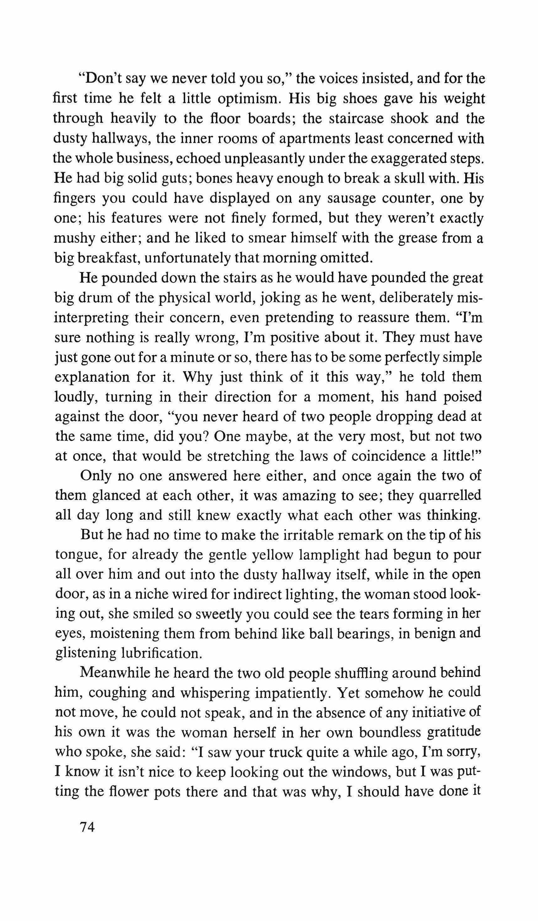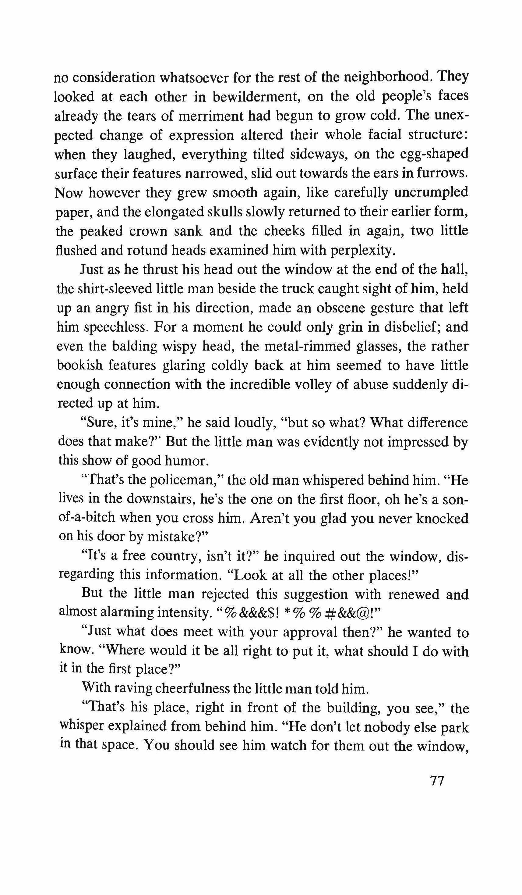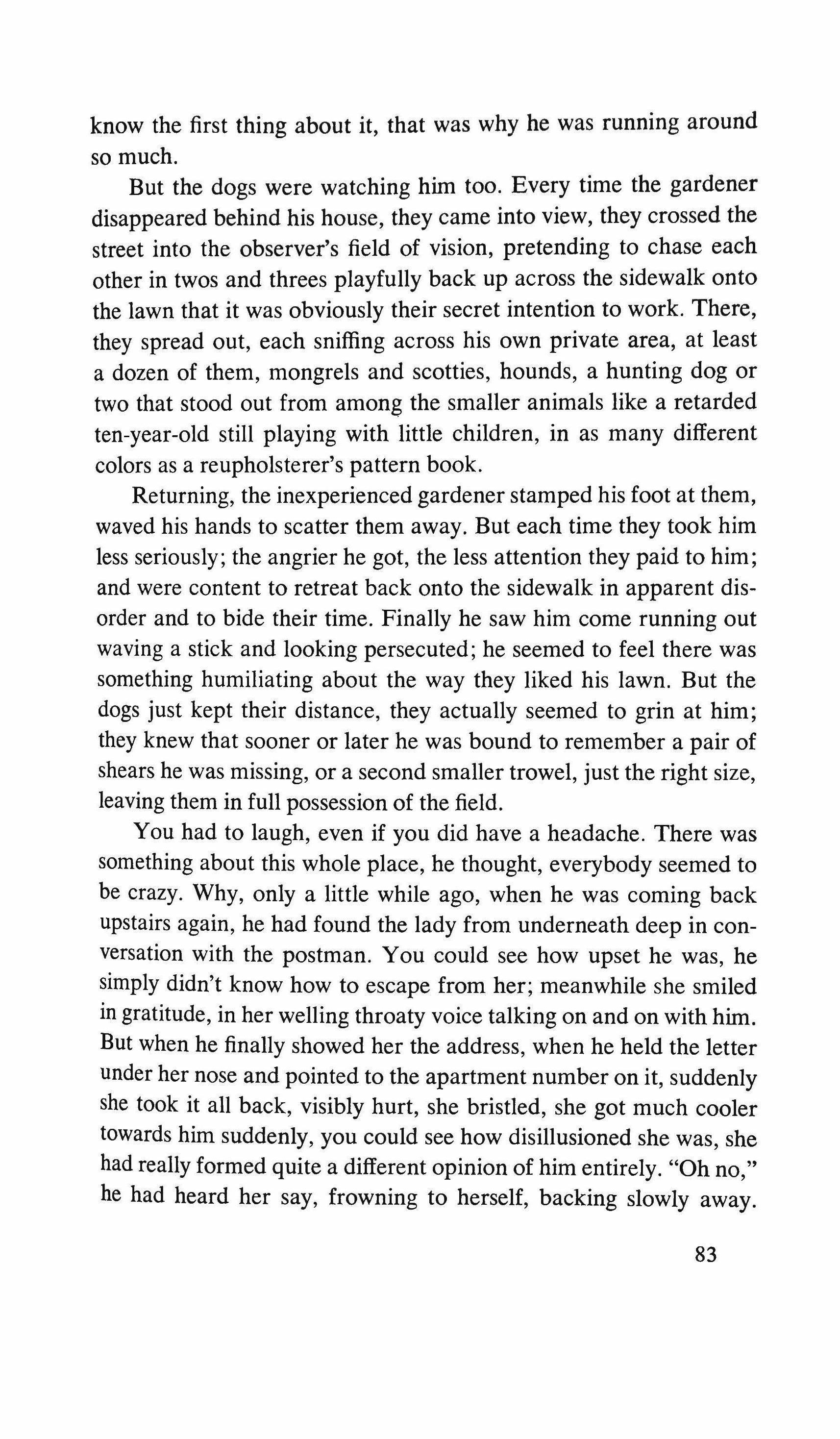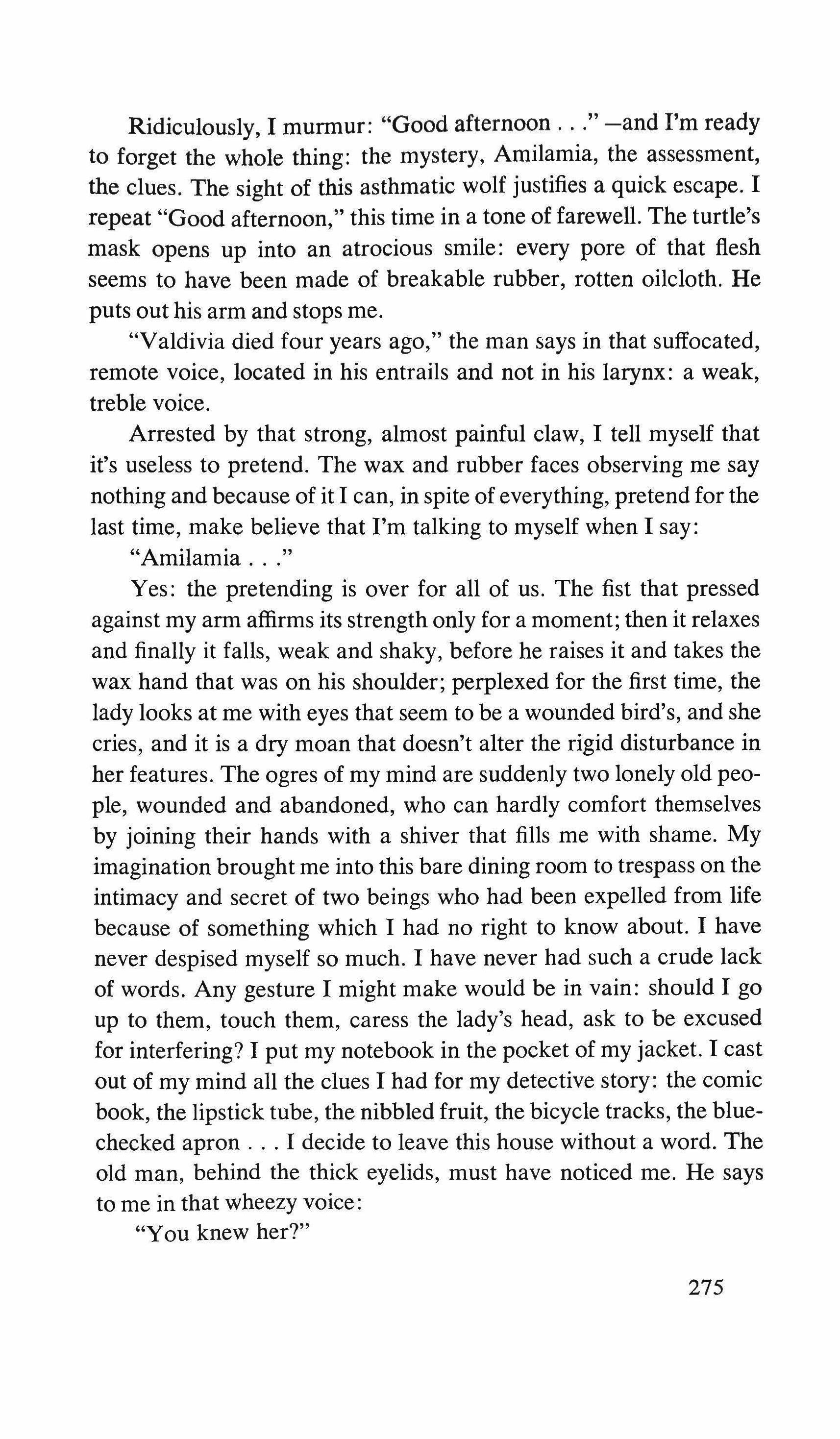 Ridiculously, I murmur: "Good afternoon -and I'm ready to forget the whole thing: the mystery, Amilamia, the assessment, the clues. The sight of this asthmatic wolf justifies a quick escape. I repeat "Good afternoon," this time in a tone of farewell. The turtle's mask opens up into an atrocious smile: every pore of that flesh seems to have been made of breakable rubber, rotten oilcloth. He puts out his arm and stops me.