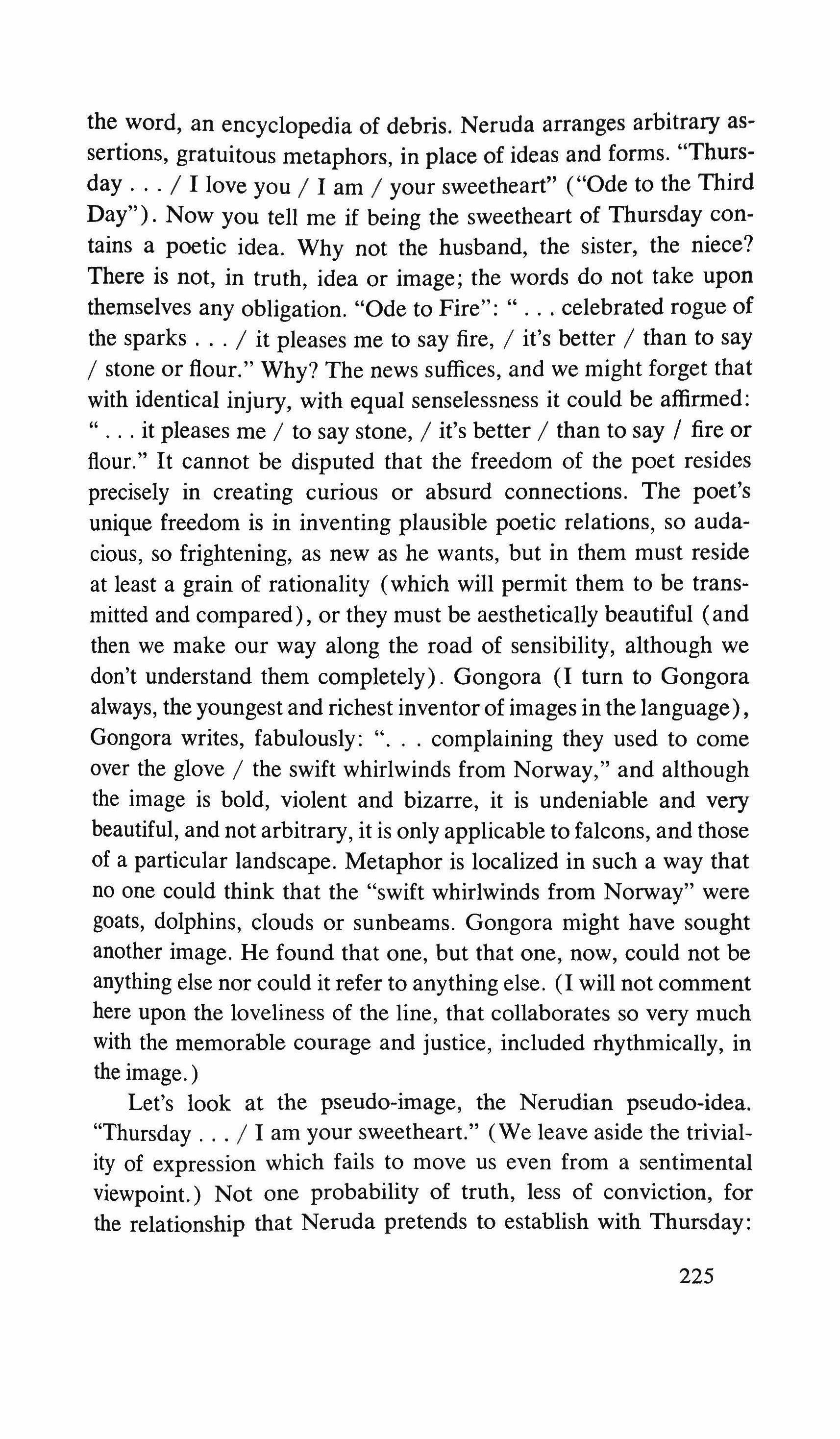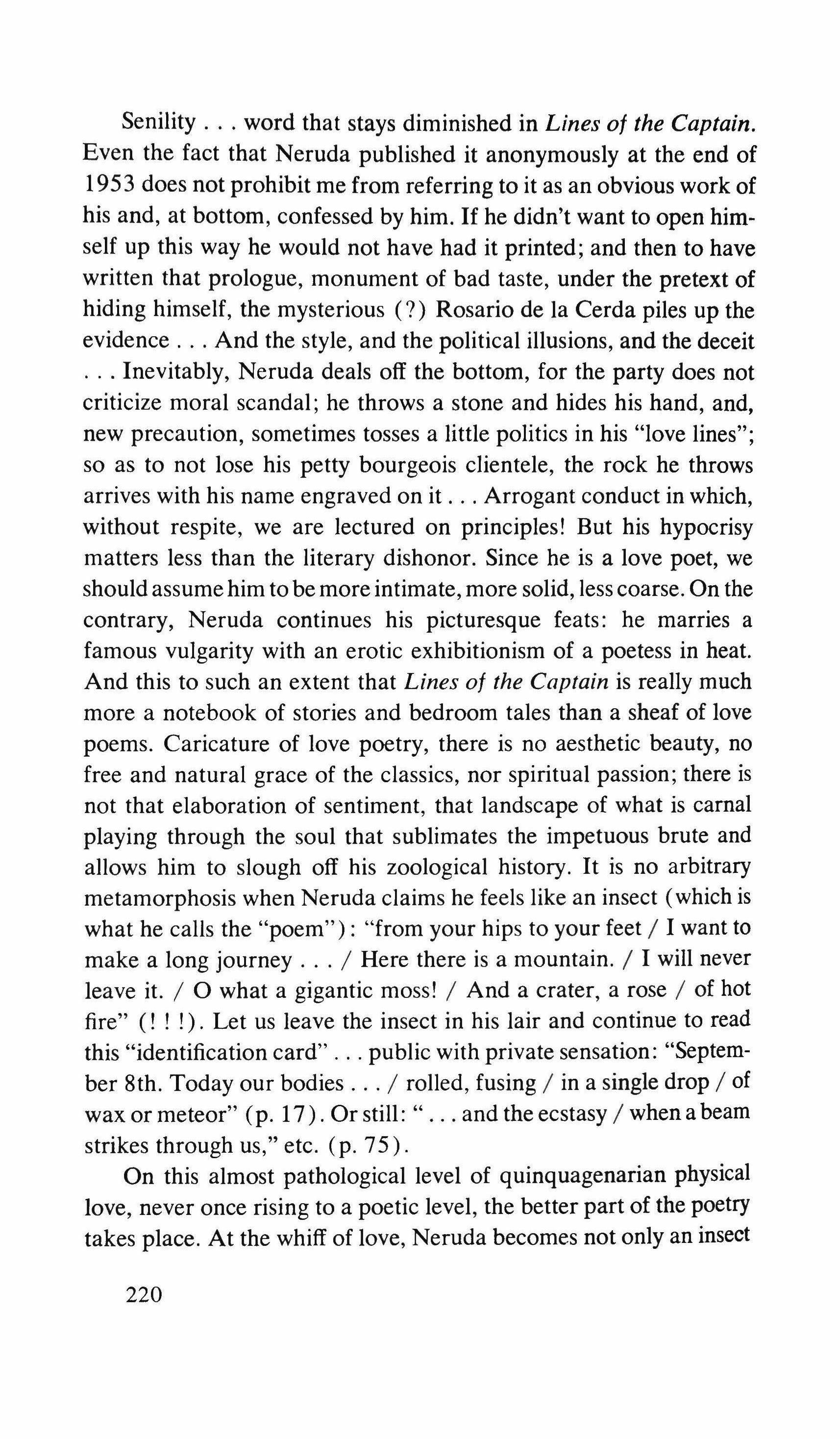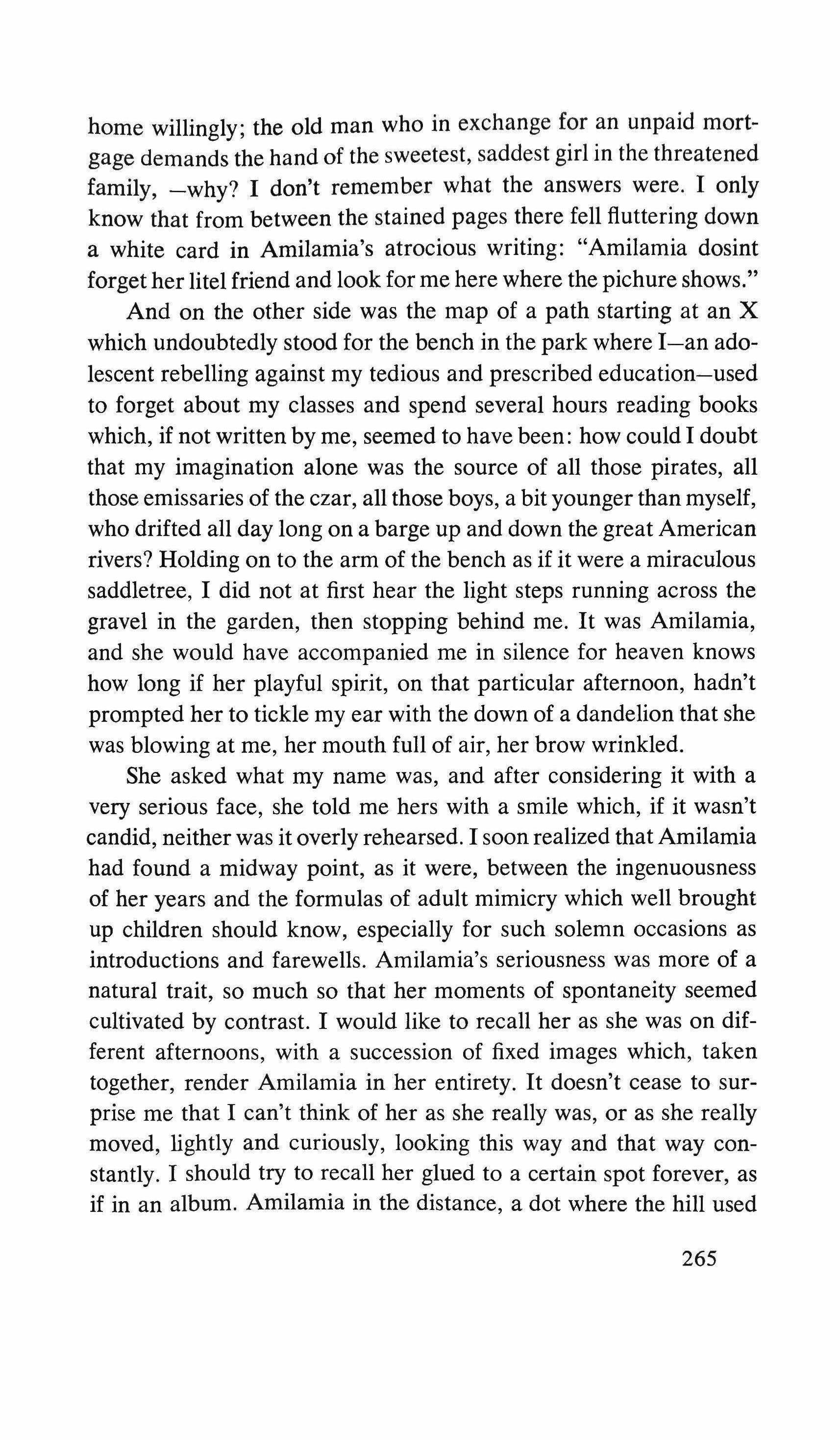 between my own unresolved childhood and the open world, the promised land that was beginning to be mine through books. Not then. Then I dreamed of the women in my books, the females -the word disturbed me-who disguised themselves as the Queen so as to buy a necklace incognito; the mythological creations-part recognizable beings, part salamanders, white-breasted and dampwombed-who awaited monarchs in their beds. And thus, imperceptibly, I moved from an indifference toward my infantile company to an acceptance of the little girl's grace and seriousness, and from there to an unexpected rejection of that useless presence. It was finally irritating to me-me, already a fourteen year old, to be around that seven year old girl who wasn't, then, a memory and nostalgia of it, but the past and its actuality. I had given in to a weakness. We had run together, hand in hand, over the meadow. We had shaken the pines together and gathered the cones, which Amilamia put eagerly into her apron pocket. We had made paper sailboats together and followed them overjoyed along the edge of the drain. And that afternoon, when we rolled down the hill together, amidst cries of happiness, and fell down together at the bottom, Amilamia on my chest, the little girl's hair in my lips, and when I felt her panting in my ear and her little arms sticky with candy around my neck, I pushed away her arms angrily and let her fall. Amilamia cried, stroking her wounded elbow and knee, and I went back to my bench. Then Amilamia left and the next day returned and without a word, she gave me the piece of paper and disappeared humming into the forest. I couldn't decide whether to tear up the card or keep it between the pages of the book: Afternoons on the Farm. Being around Amilamia had even made my reading become childish. She did not come back to the park. After a few days, I left for vacation, and when I came back, it was to the duties of a first year baccalaureate student. I never saw her again.