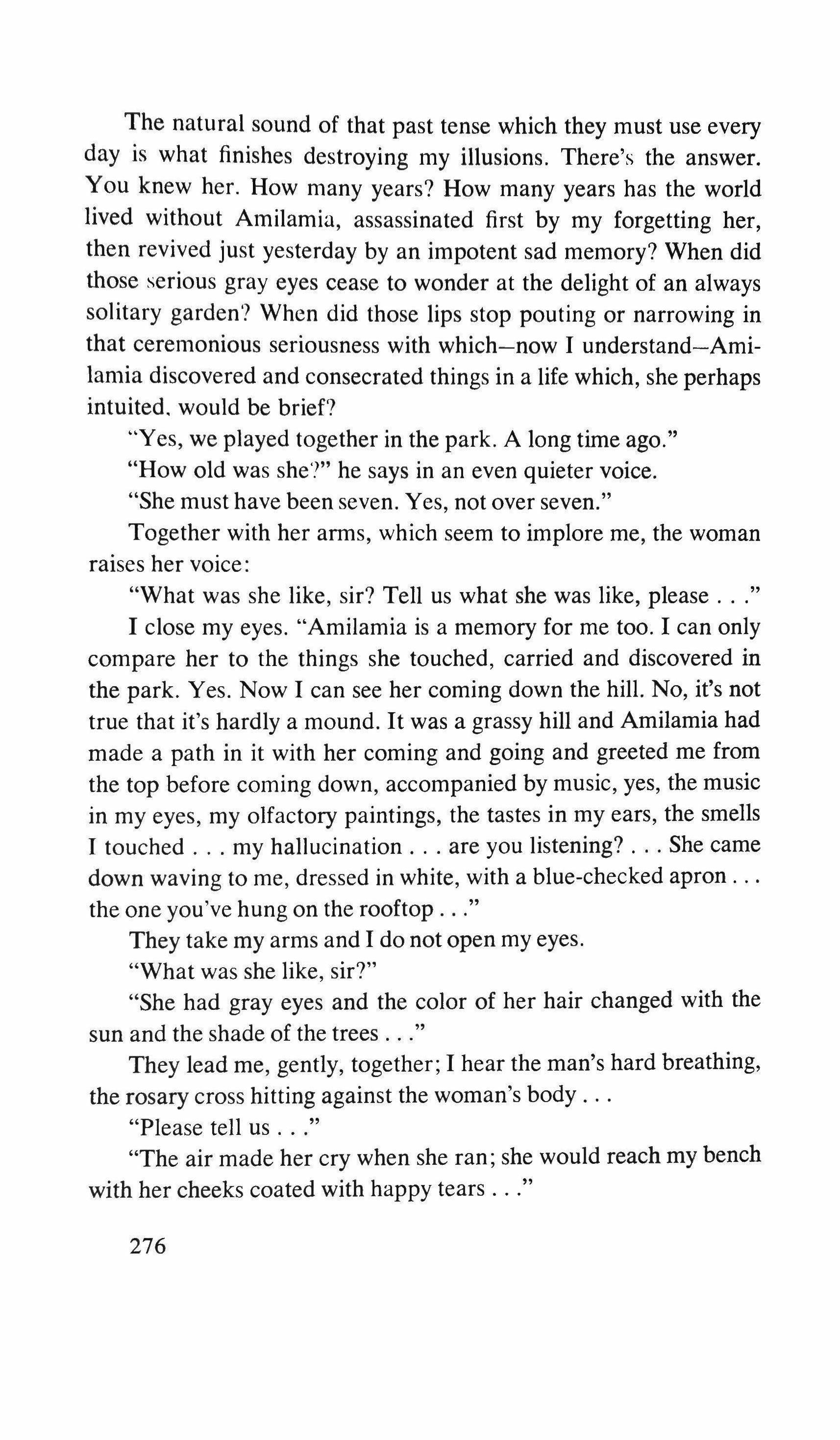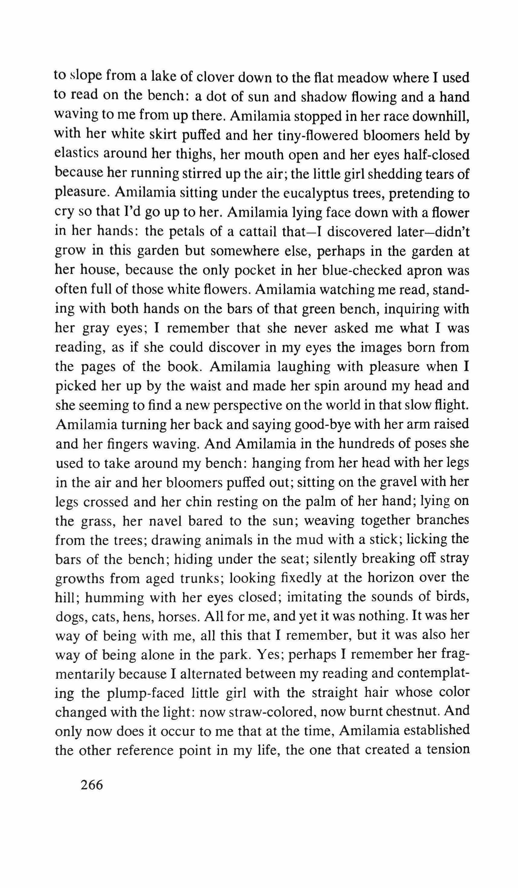 to slope from a lake of clover down to the flat meadow where I used to read on the bench: a dot of sun and shadow flowing and a hand waving to me from up there. Amilamia stopped in her race downhill, with her white skirt puffed and her tiny-flowered bloomers held by elastics around her thighs, her mouth open and her eyes half-closed because her running stirred up the air; the little girl shedding tears of pleasure. Amilamia sitting under the eucalyptus trees, pretending to cry so that I'd go up to her. Amilamia lying face down with a flower in her hands: the petals of a cattail that-I discovered later-didn't grow in this garden but somewhere else, perhaps in the garden at her house, because the only pocket in her blue-checked apron was often full of those white flowers. Amilamia watching me read, standing with both hands on the bars of that green bench, inquiring with her gray eyes; I remember that she never asked me what I was reading, as if she could discover in my eyes the images born from the pages of the book. Amilamia laughing with pleasure when I picked her up by the waist and made her spin around my head and she seeming to find a new perspective on the world in that slow flight. Amilamia turning her back and saying good-bye with her arm raised and her fingers waving. And Amilamia in the hundreds of poses she used to take around my bench: hanging from her head with her legs in the air and her bloomers puffed out; sitting on the gravel with her legs crossed and her chin resting on the palm of her hand; lying on the grass, her navel bared to the sun; weaving together branches from the trees; drawing animals in the mud with a stick; licking the bars of the bench; hiding under the seat; silently breaking off stray growths from aged trunks; looking fixedly at the horizon over the hill; humming with her eyes closed; imitating the sounds of birds, dogs, cats, hens, horses. All for me, and yet it was nothing. It was her way of being with me, all this that I remember, but it was also her way of being alone in the park. Yes; perhaps I remember her fragmentarily because I alternated between my reading and contemplating the plump-faced little girl with the straight hair whose color changed with the light: now straw-colored, now burnt chestnut. And only now does it occur to me that at the time, Amilamia established the other reference point in my life, the one that created a tension
