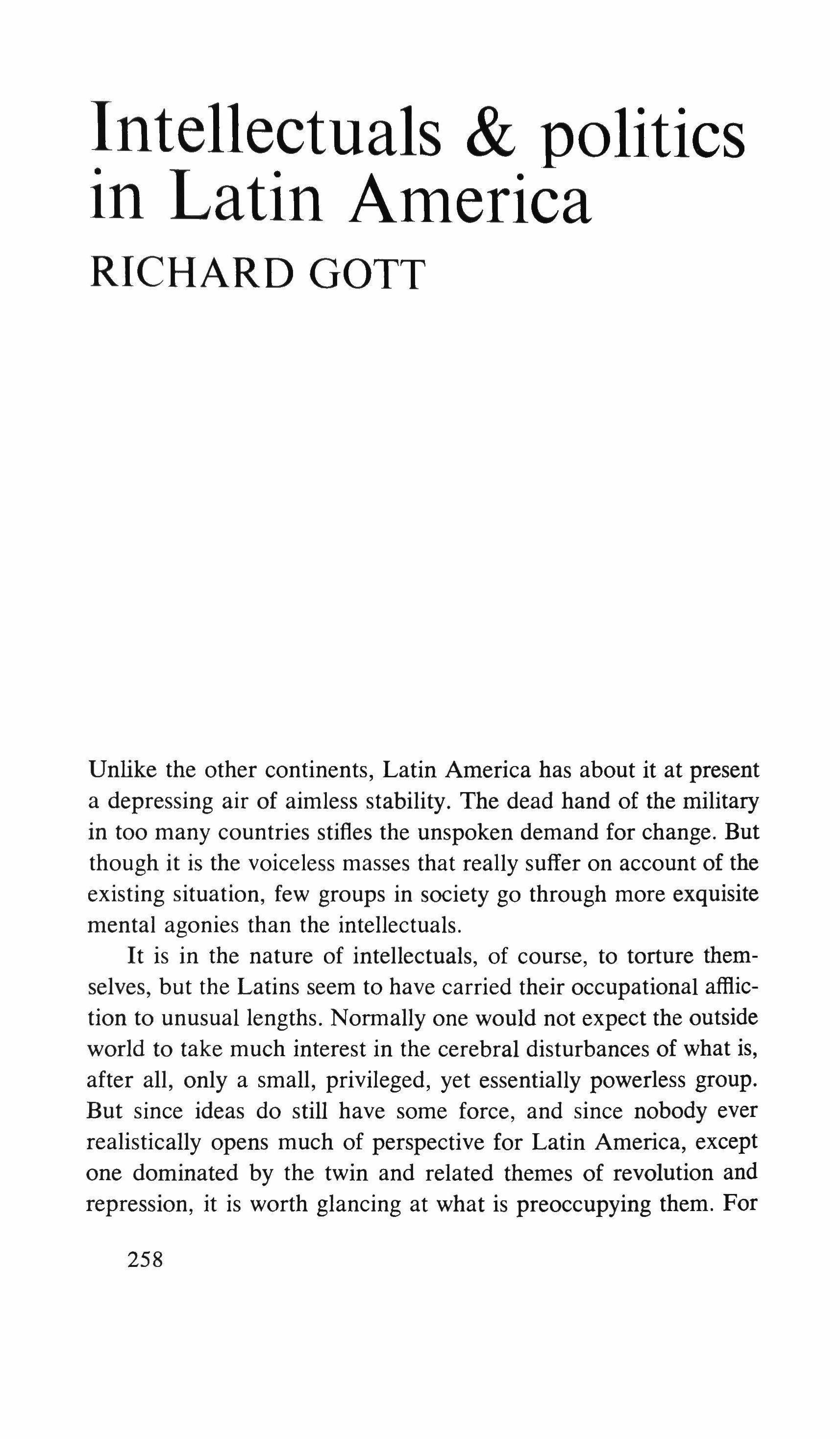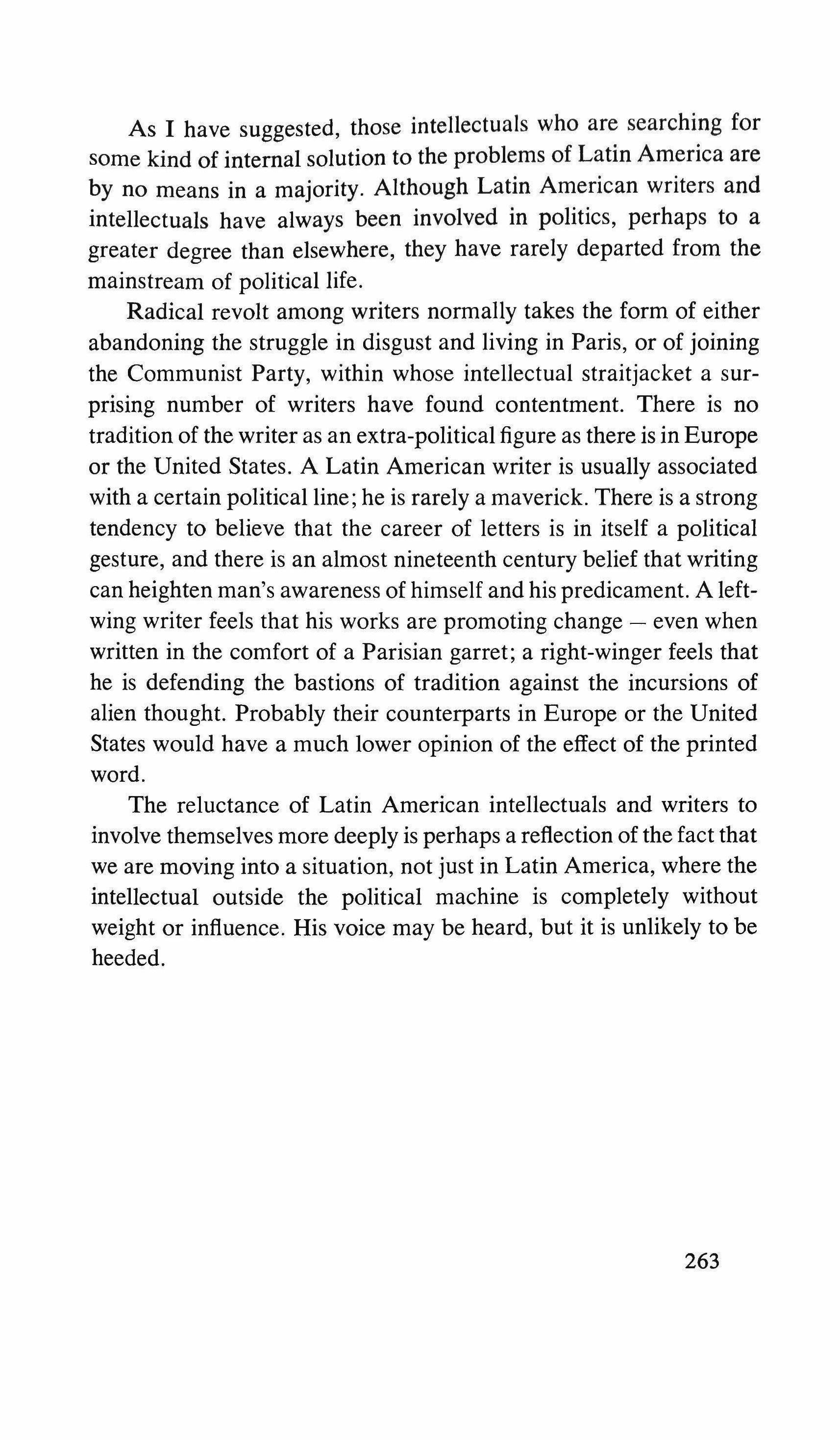 The reluctance of Latin American intellectuals and writers to involve themselves more deeply is perhaps a reflection of the fact that we are moving into a situation, not just in Latin America, where the intellectual outside the political machine is completely without weight or influence. His voice may be heard, but it is unlikely to be heeded.