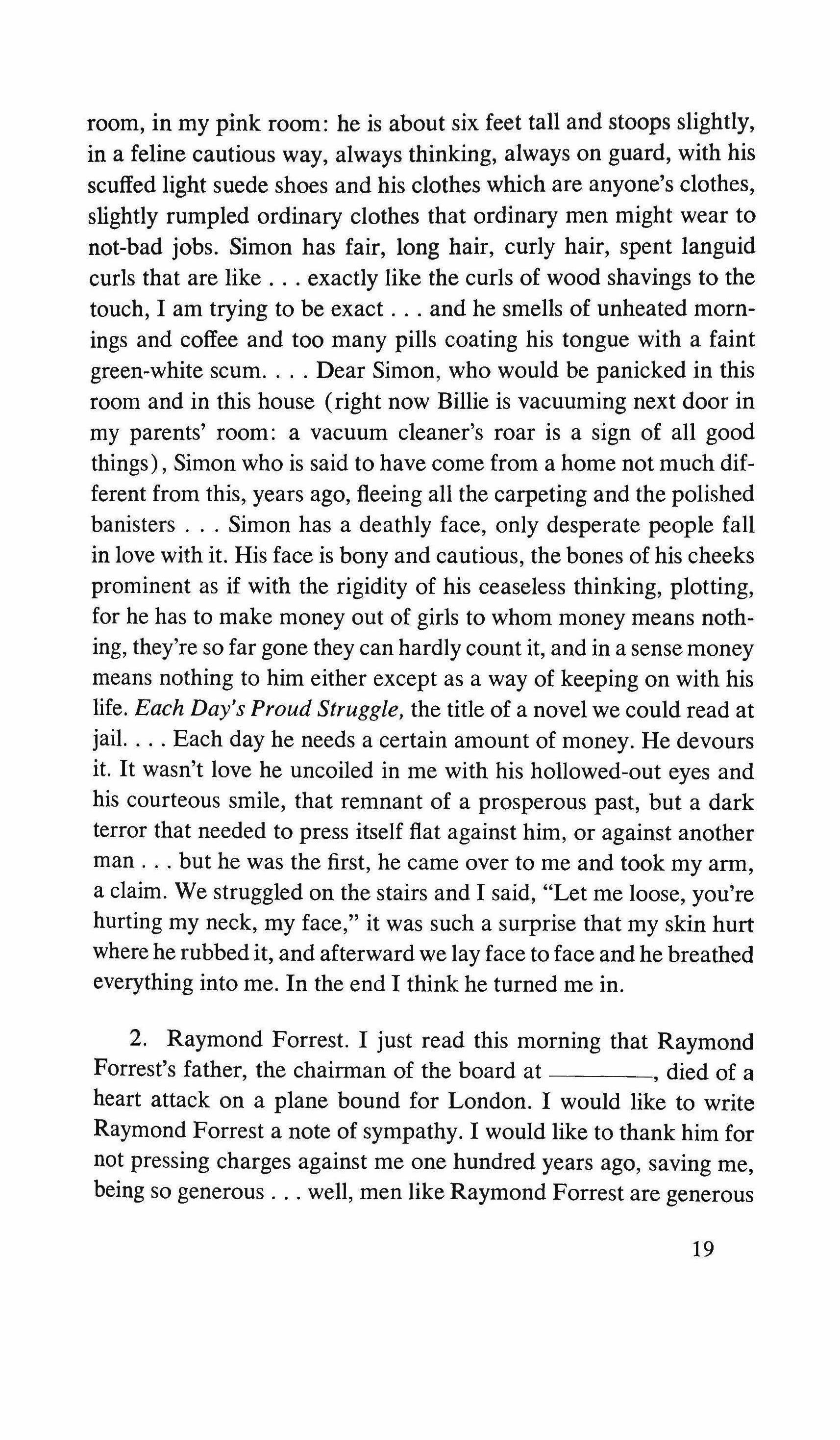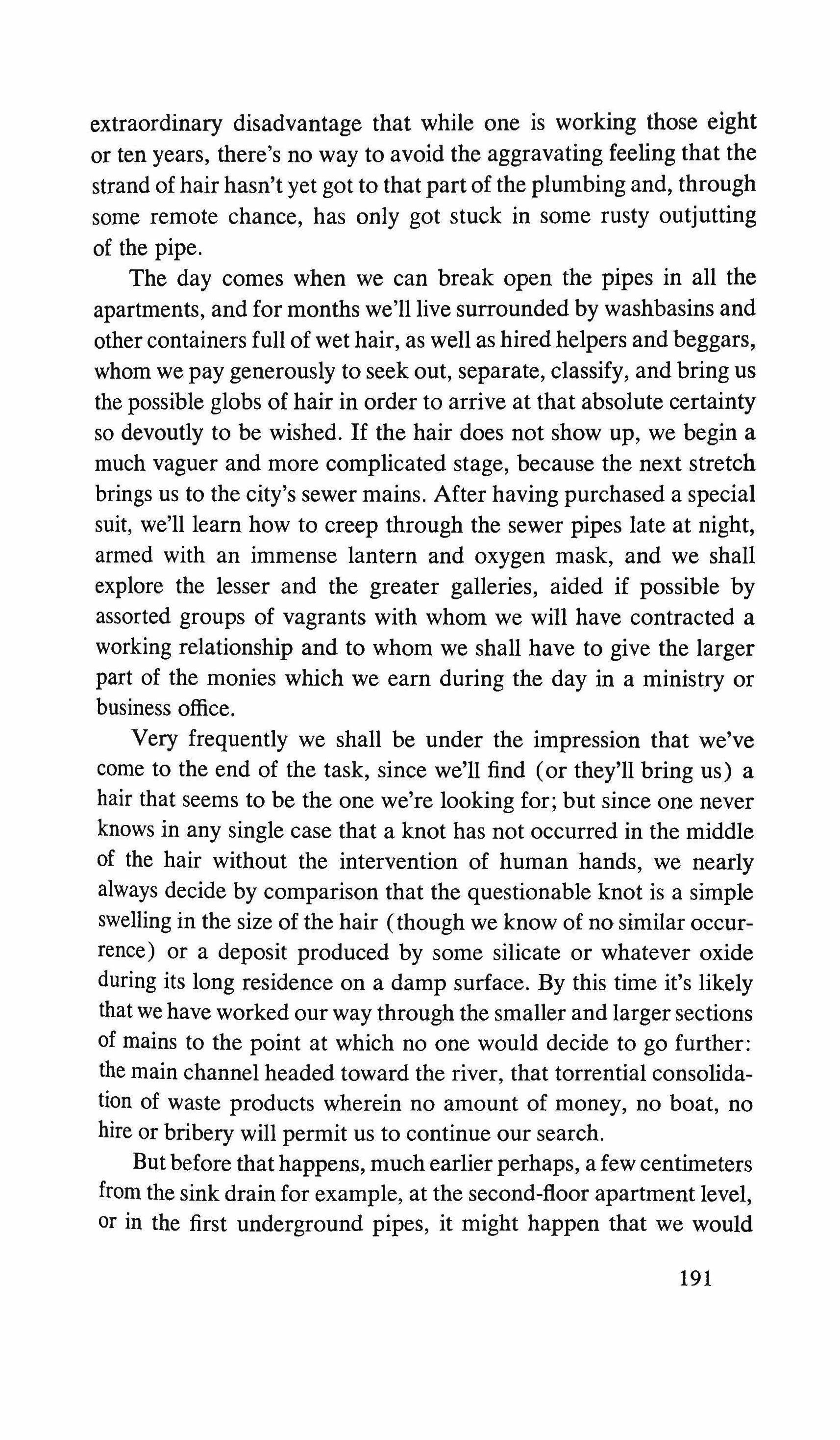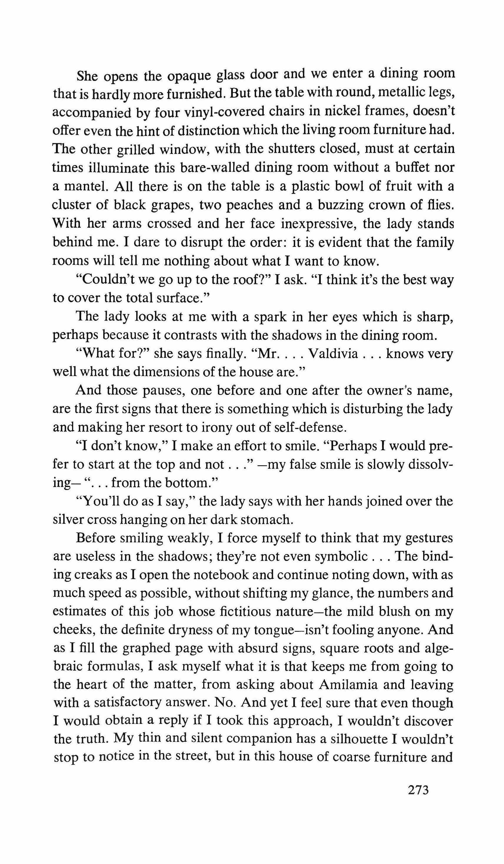 Before smiling weakly, I force myself to think that my gestures are useless in the shadows; they're not even symbolic The binding creaks as I open the notebook and continue noting down, with as much speed as possible, without shifting my glance, the numbers and estimates of this job whose fictitious nature-the mild blush on my cheeks, the definite dryness of my tongue-isn't fooling anyone. And as I fill the graphed page with absurd signs, square roots and algebraic formulas, I ask myself what it is that keeps me from going to the heart of the matter, from asking about Amilamia and leaving with a satisfactory answer. No. And yet I feel sure that even though I would obtain a reply if I took this approach, I wouldn't discover the truth. My thin and silent companion has a silhouette I wouldn't stop to notice in the street, but in this house of coarse furniture and