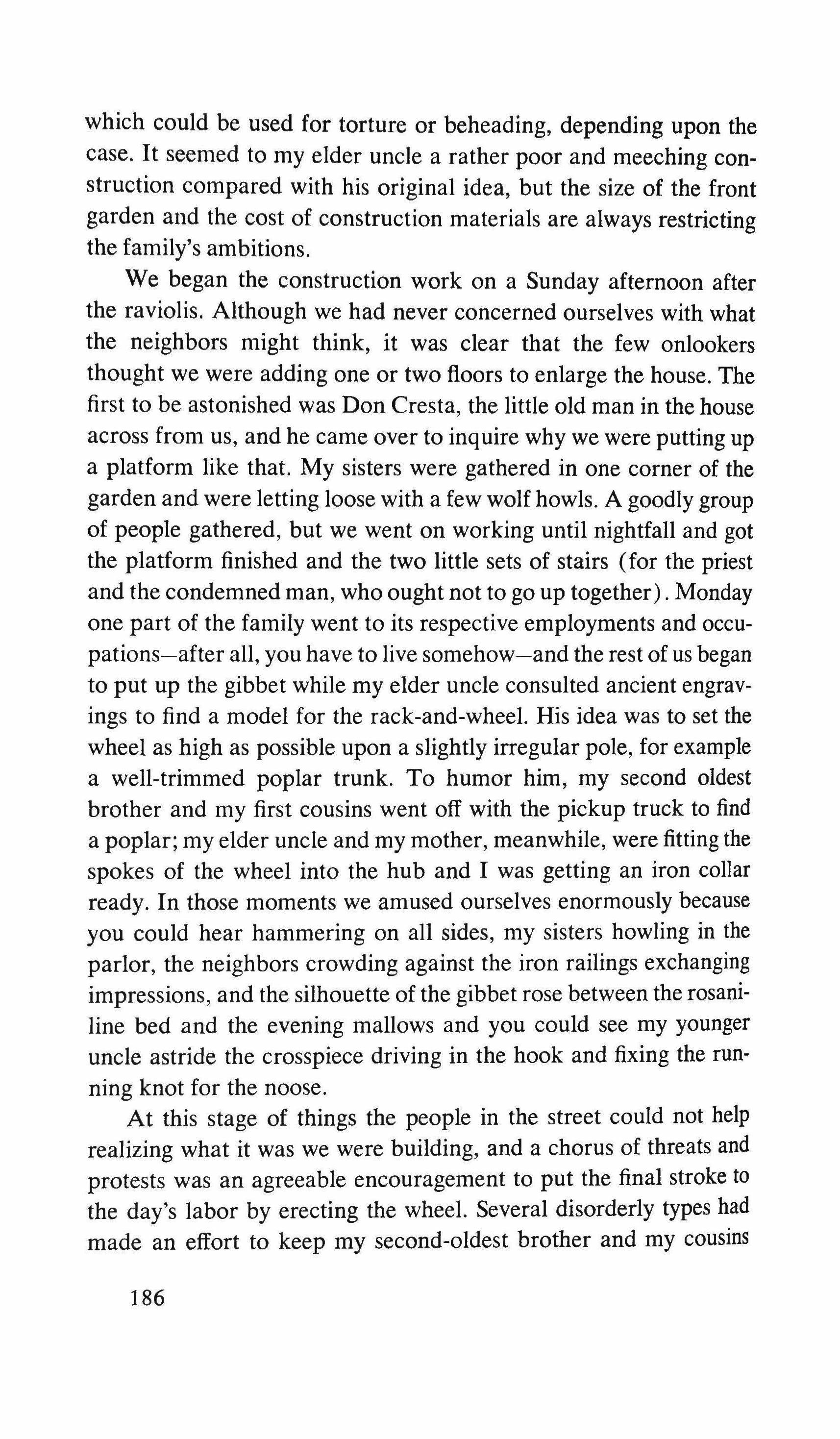 I receive no reply. I keep ringing the bell, but with no results. I withdraw from the door without shifting my eyes from the thin slits in the door, as if distance could give me perspective and even the ability to penetrate. Concentrating fixedly on the cursed door, I keep walking backwards, cross the street; a sharp cry saves me in time, followed by a horn blown hard and long, while I confusedly look for the person whose voice has just saved me; all I see is the car going down the street and r embrace a lamp post, a handhold which, more than security, offers me a place to lean on as my icy blood rushes into my burning skin and I sweat. I look at the house that was, had been, must have been, Amilamia's. Behind the balustrade, just as I had guessed, there are clothes waving. I don't know what the rest is: slips, pajamas, blouses, I don't know; I see that little blue-checked apron, stiff, clothes-pinned onto the long line that is swaying between an iron bar and a nail in the white wall of the rooftop.