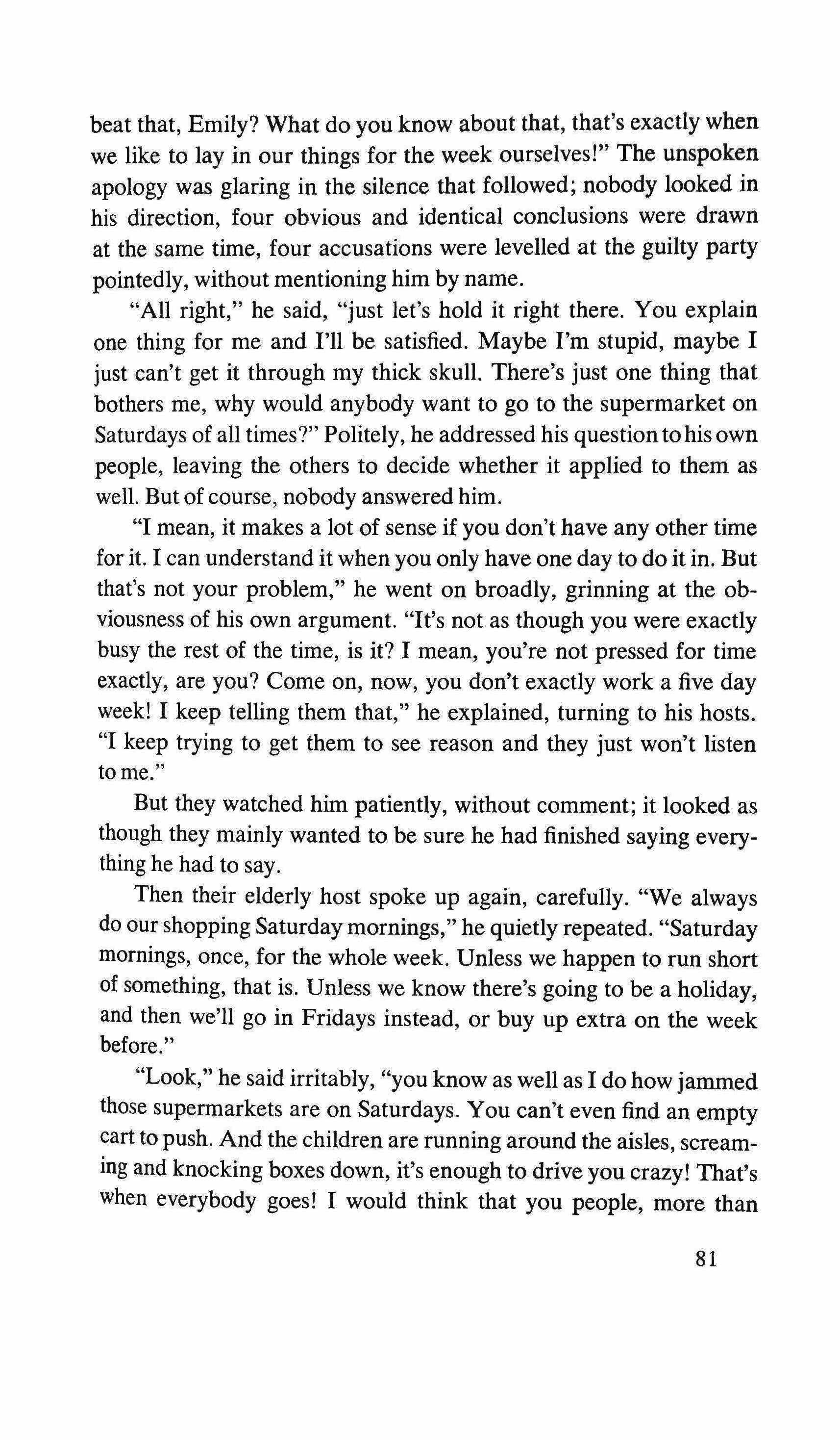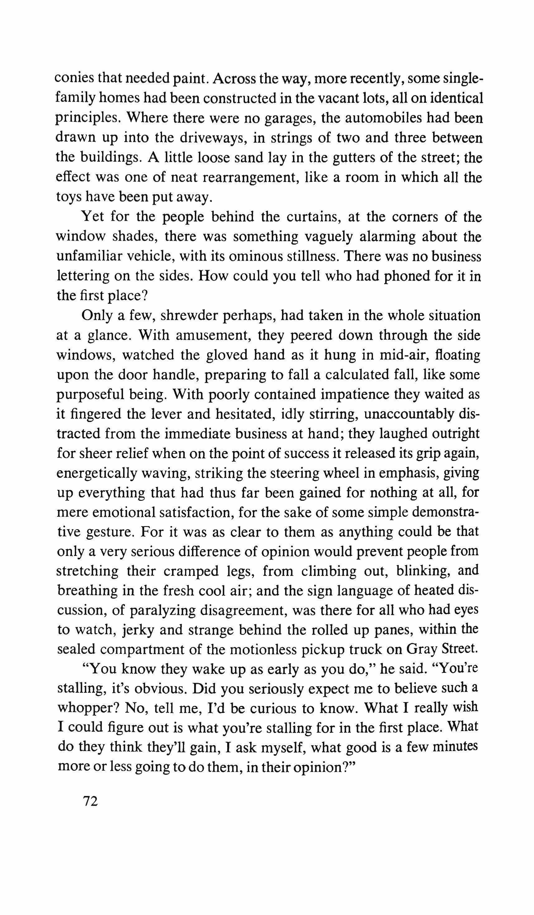 "He sends his greetings and I hesitate, hoping for a reaction from the woman. She keeps rocking. The comic book has been scrawled on with a red crayon. ", and he has asked me to inform you that he will have to disturb you for a few days