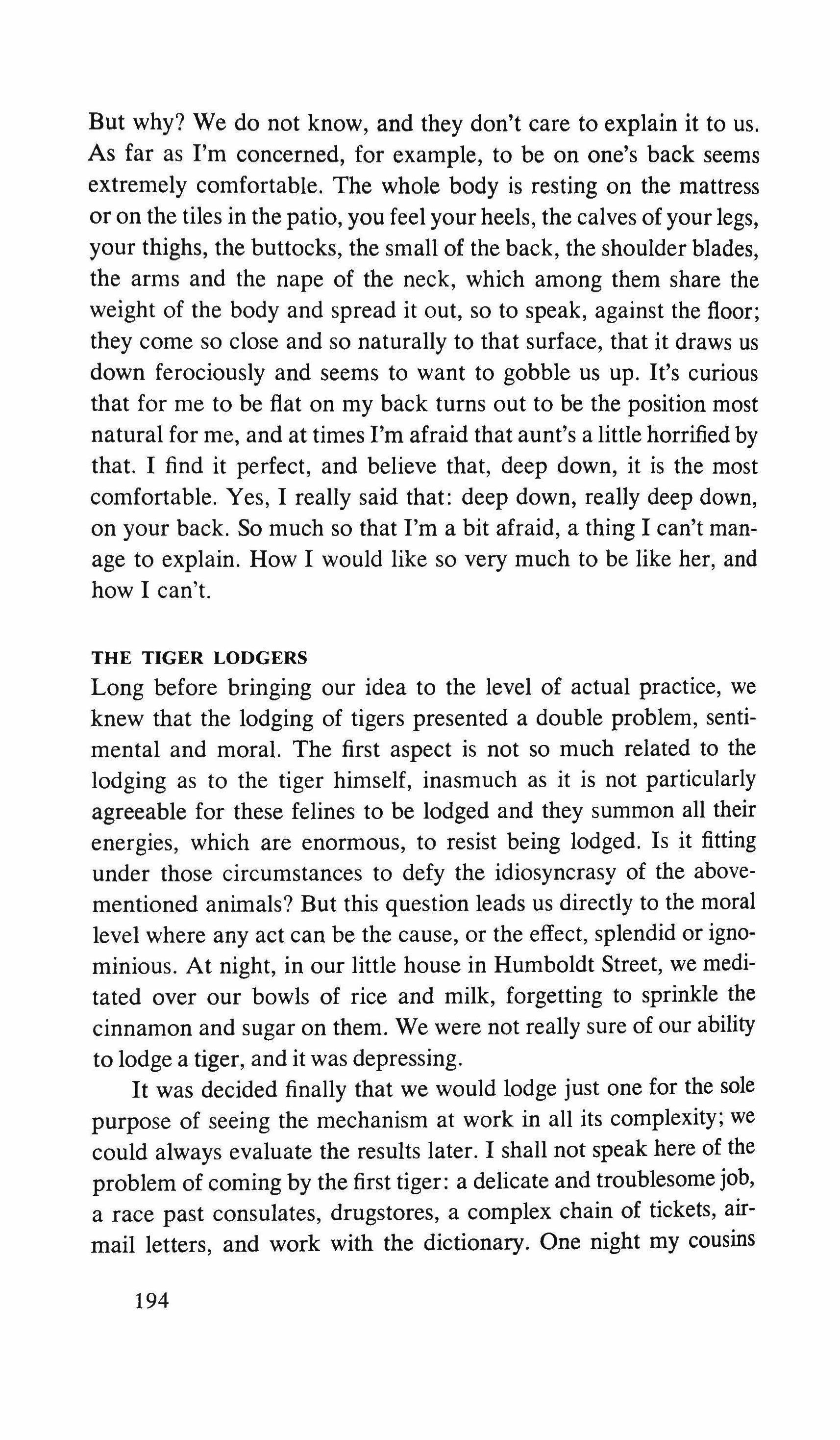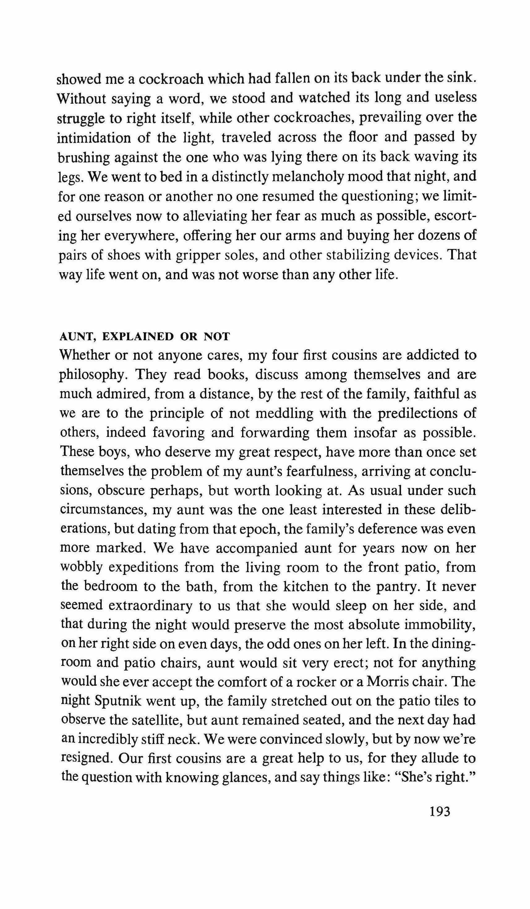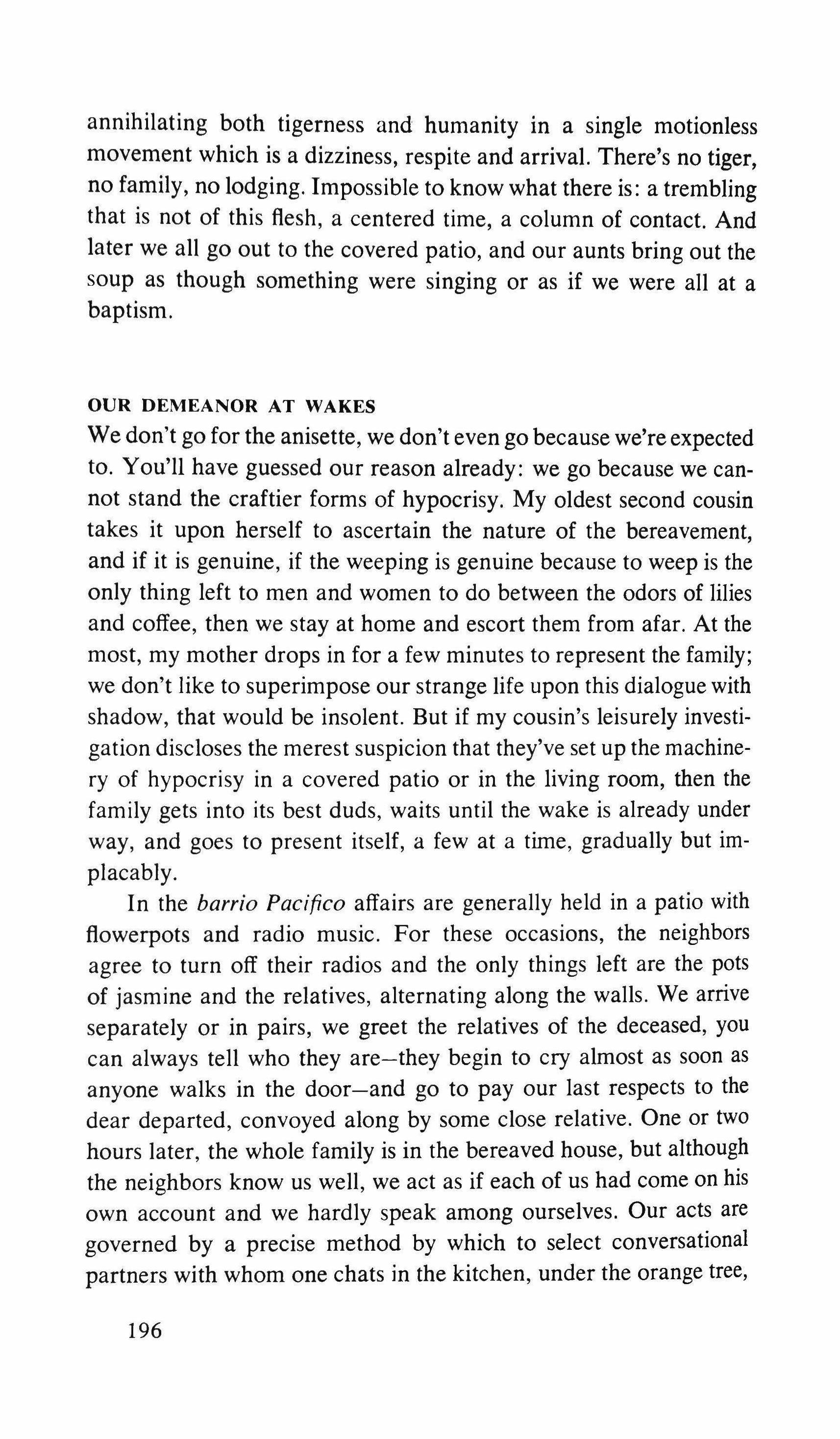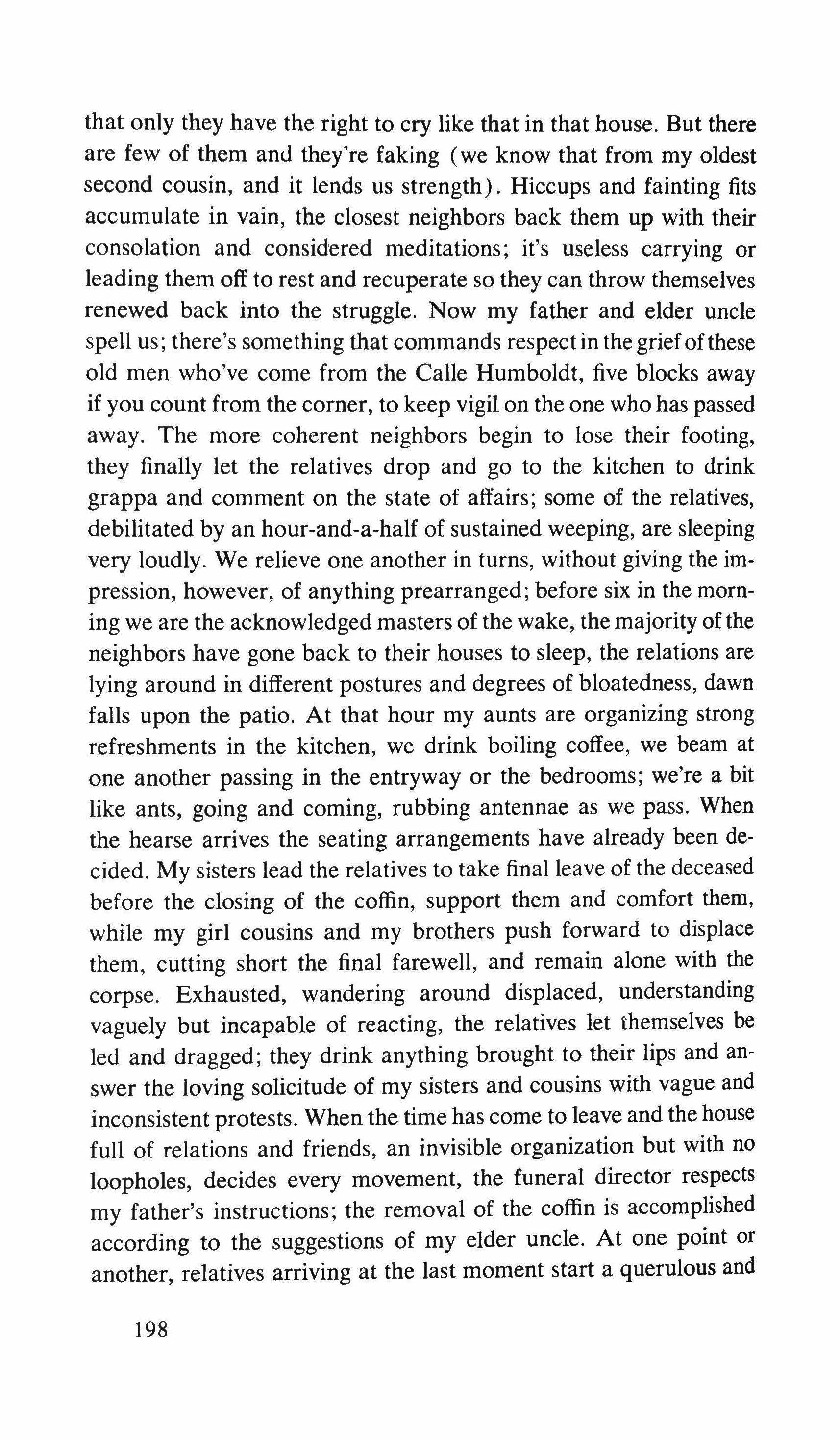 Yes: the pretending is over for all of us. The fist that pressed against my arm affirms its strength only for a moment; then it relaxes and finally it falls, weak and shaky, before he raises it and takes the wax hand that was on his shoulder; perplexed for the first time, the lady looks at me with eyes that seem to be a wounded bird's, and she cries, and it is a dry moan that doesn't alter the rigid disturbance in her features. The ogres of my mind are suddenly two lonely old people, wounded and abandoned, who can hardly comfort themselves by joining their hands with a shiver that fills me with shame. My imagination brought me into this bare dining room to trespass on the intimacy and secret of two beings who had been expelled from life because of something which I had no right to know about. I have never despised myself so much. I have never had such a crude lack of words. Any gesture I might make would be in vain: should I go up to them, touch them, caress the lady's head, ask to be excused for interfering? I put my notebook in the pocket of my jacket. I cast out of my mind all the clues I had for my detective story: the comic book, the lipstick tube, the nibbled fruit, the bicycle tracks, the bluechecked apron I decide to leave this house without a word. The old man, behind the thick eyelids, must have noticed me. He says to me in that wheezy voice: