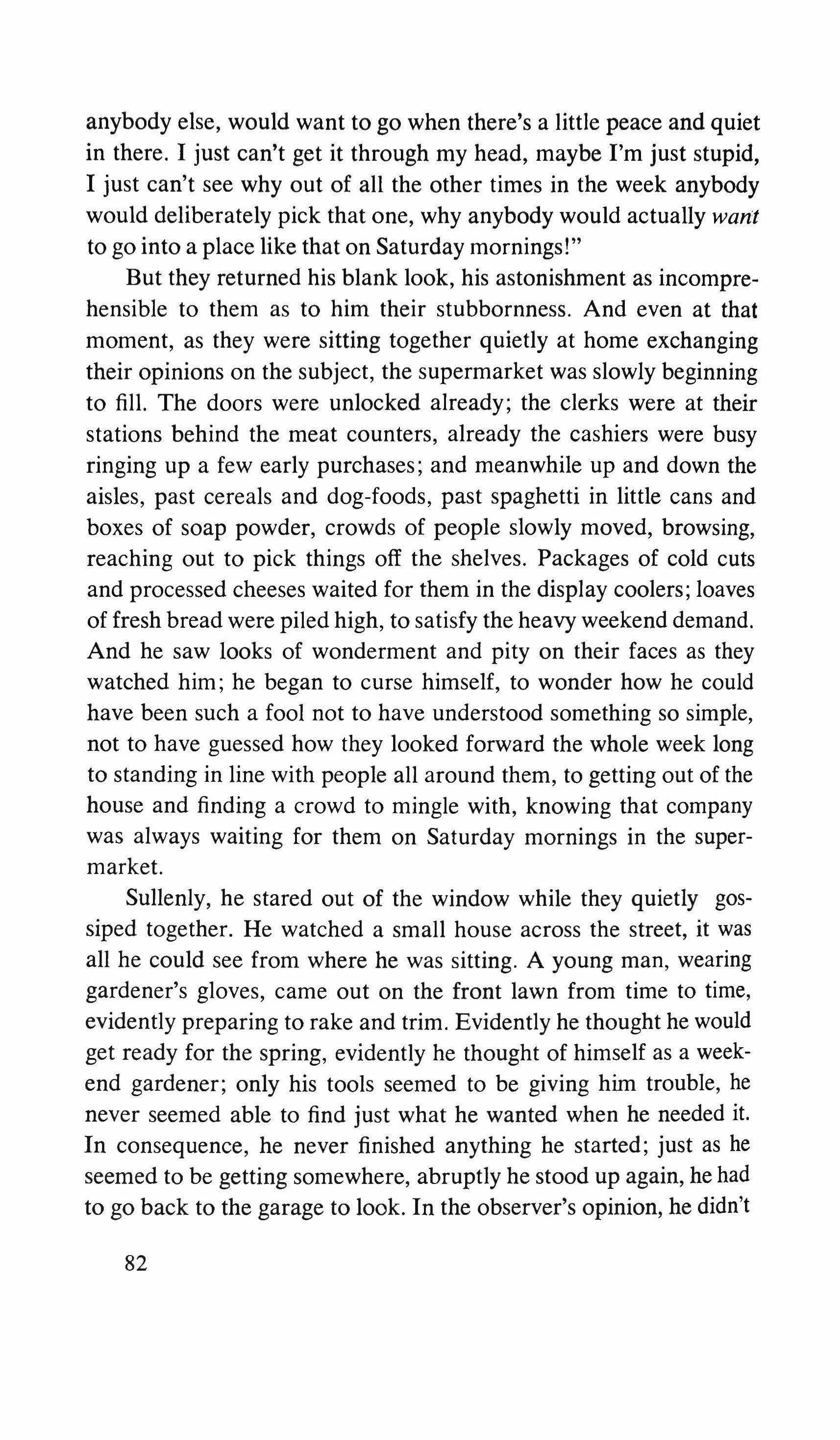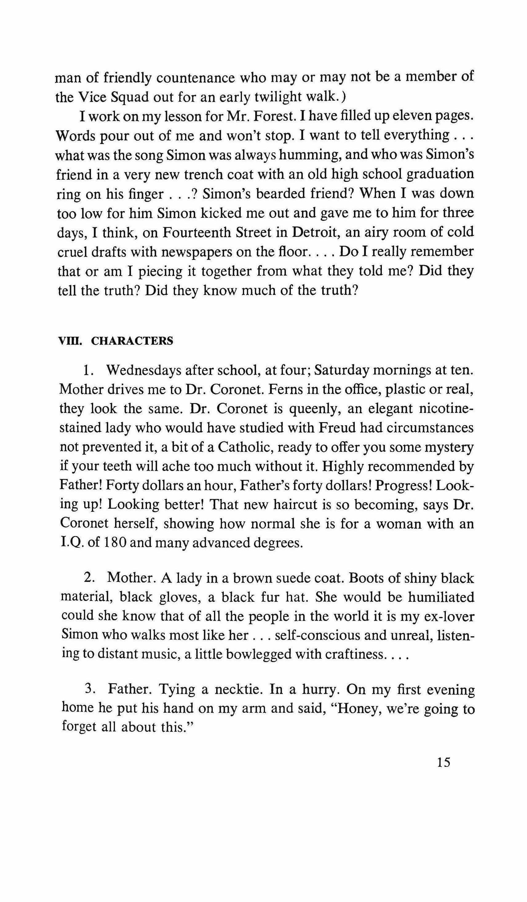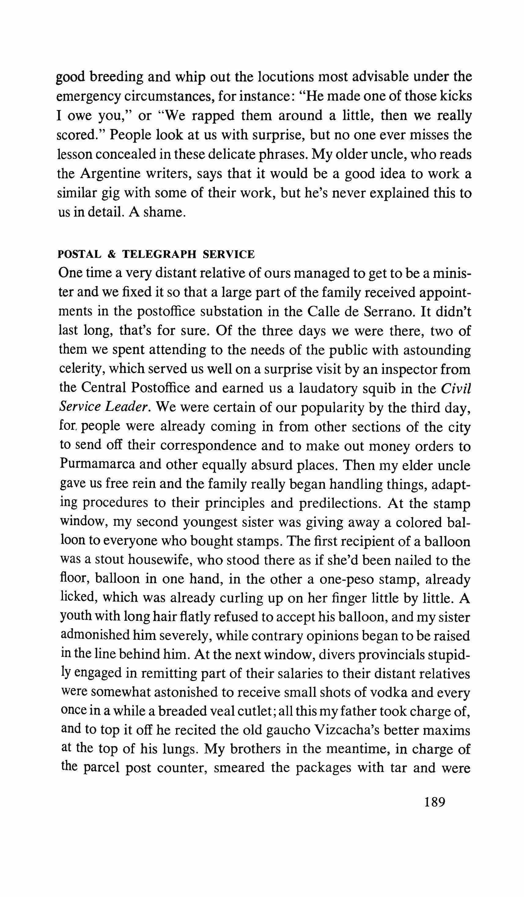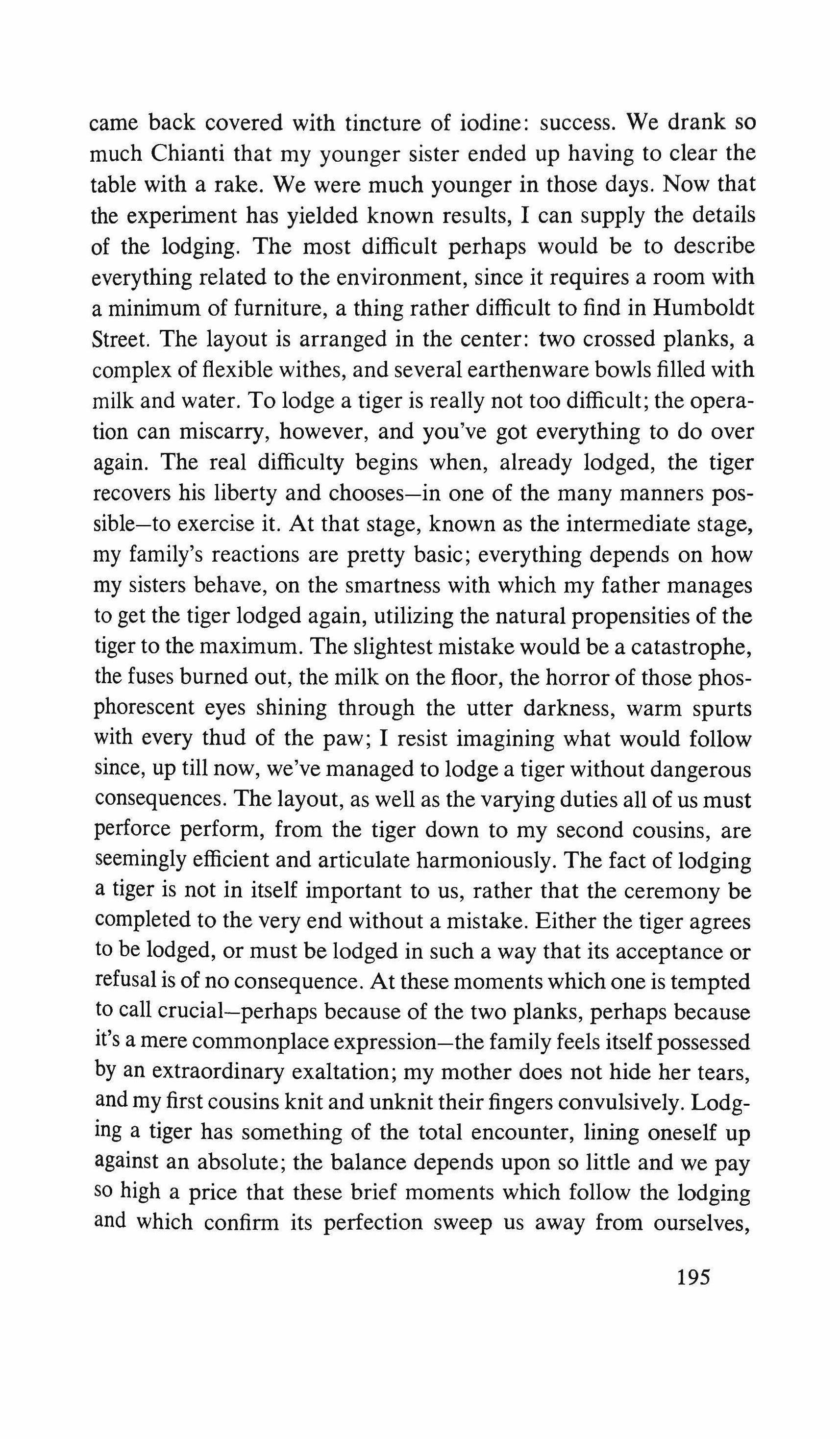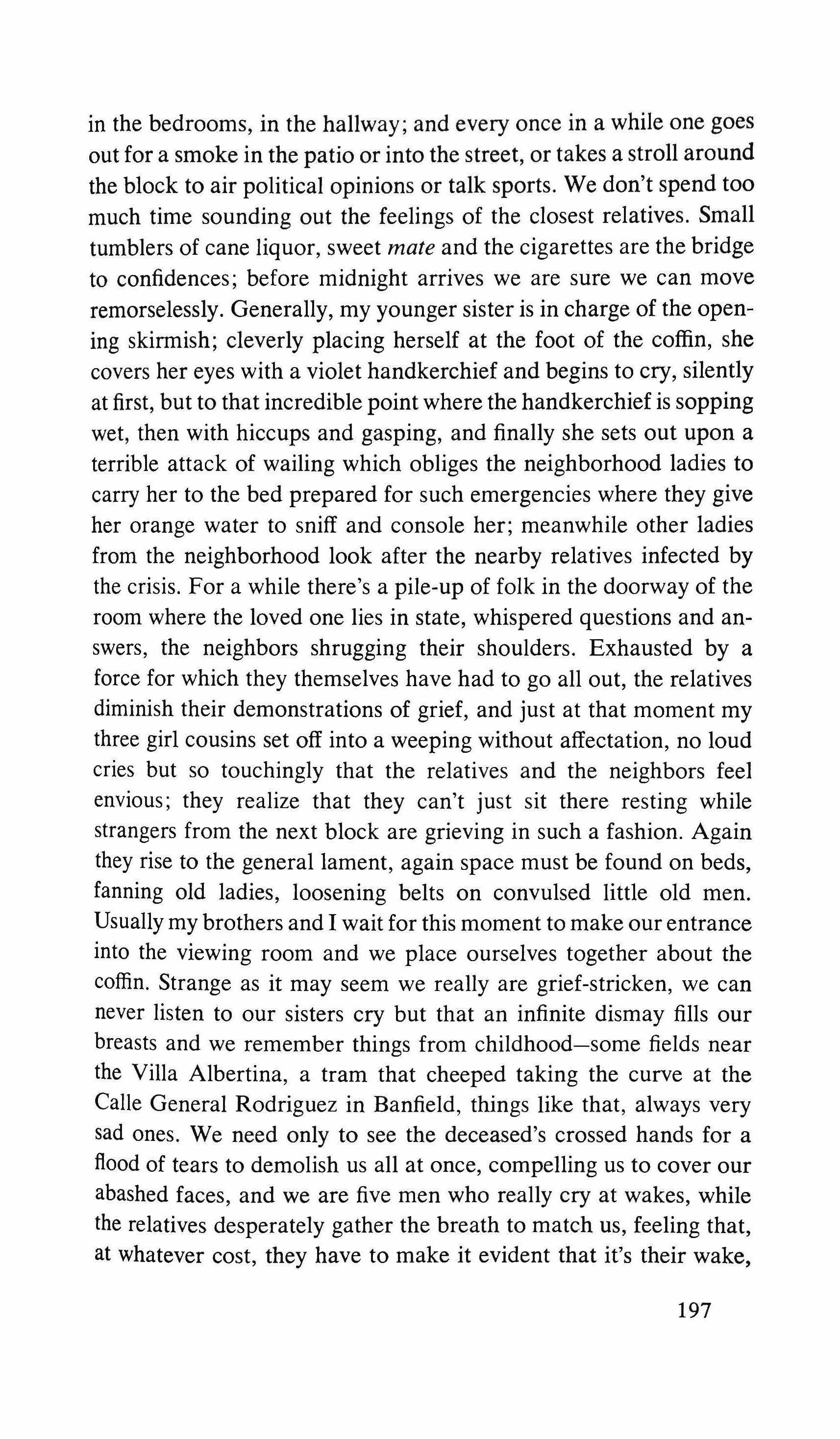 Yes: the pretending is over for all of us. The fist that pressed against my arm affirms its strength only for a moment; then it relaxes and finally it falls, weak and shaky, before he raises it and takes the wax hand that was on his shoulder; perplexed for the first time, the lady looks at me with eyes that seem to be a wounded bird's, and she cries, and it is a dry moan that doesn't alter the rigid disturbance in her features. The ogres of my mind are suddenly two lonely old people, wounded and abandoned, who can hardly comfort themselves by joining their hands with a shiver that fills me with shame. My imagination brought me into this bare dining room to trespass on the intimacy and secret of two beings who had been expelled from life because of something which I had no right to know about. I have never despised myself so much. I have never had such a crude lack of words. Any gesture I might make would be in vain: should I go up to them, touch them, caress the lady's head, ask to be excused for interfering? I put my notebook in the pocket of my jacket. I cast out of my mind all the clues I had for my detective story: the comic book, the lipstick tube, the nibbled fruit, the bicycle tracks, the bluechecked apron I decide to leave this house without a word. The old man, behind the thick eyelids, must have noticed me. He says to me in that wheezy voice: