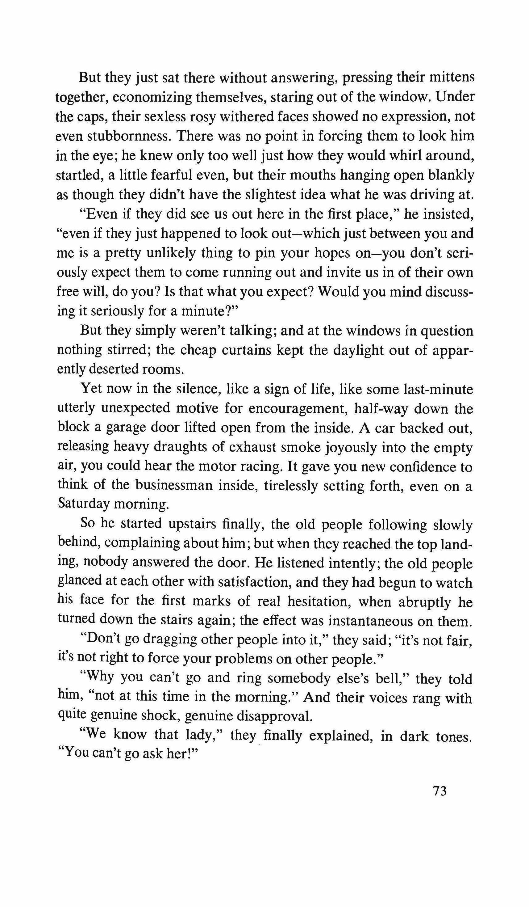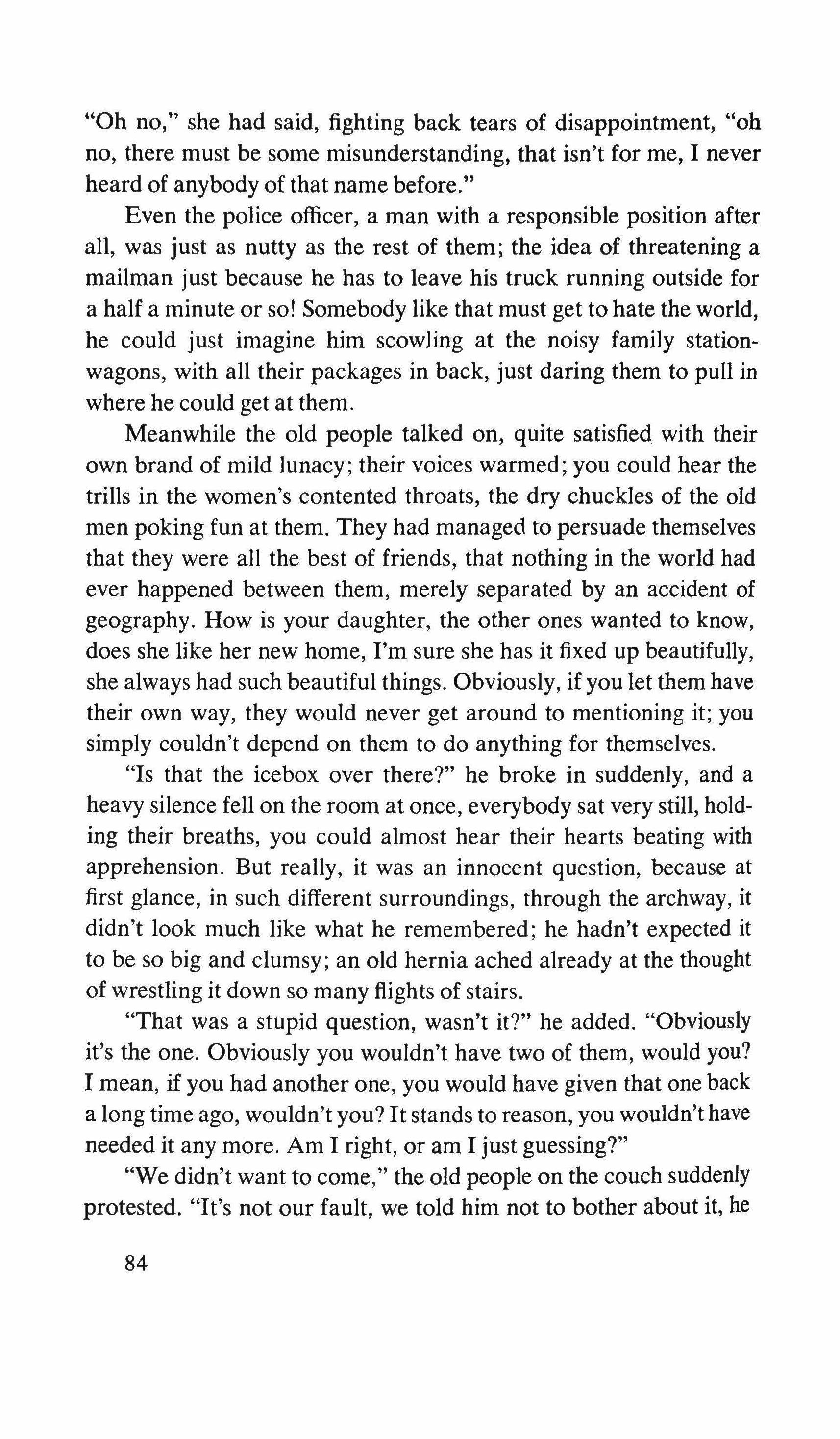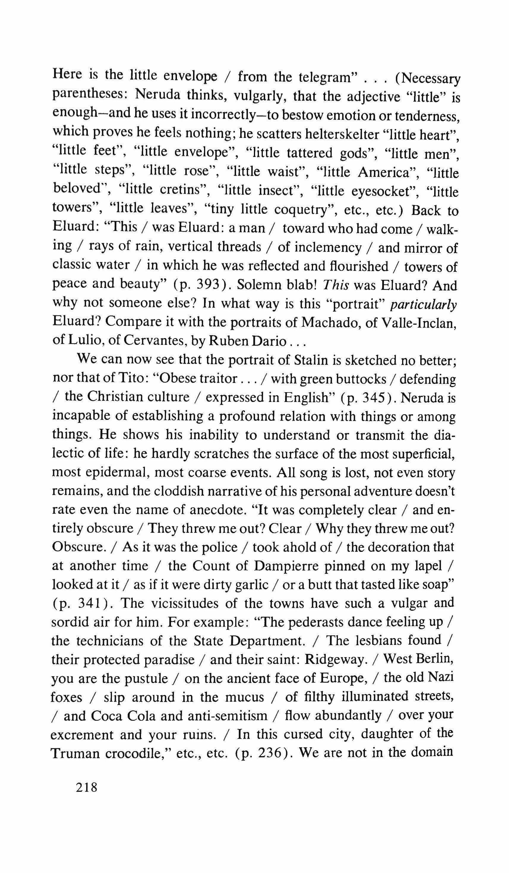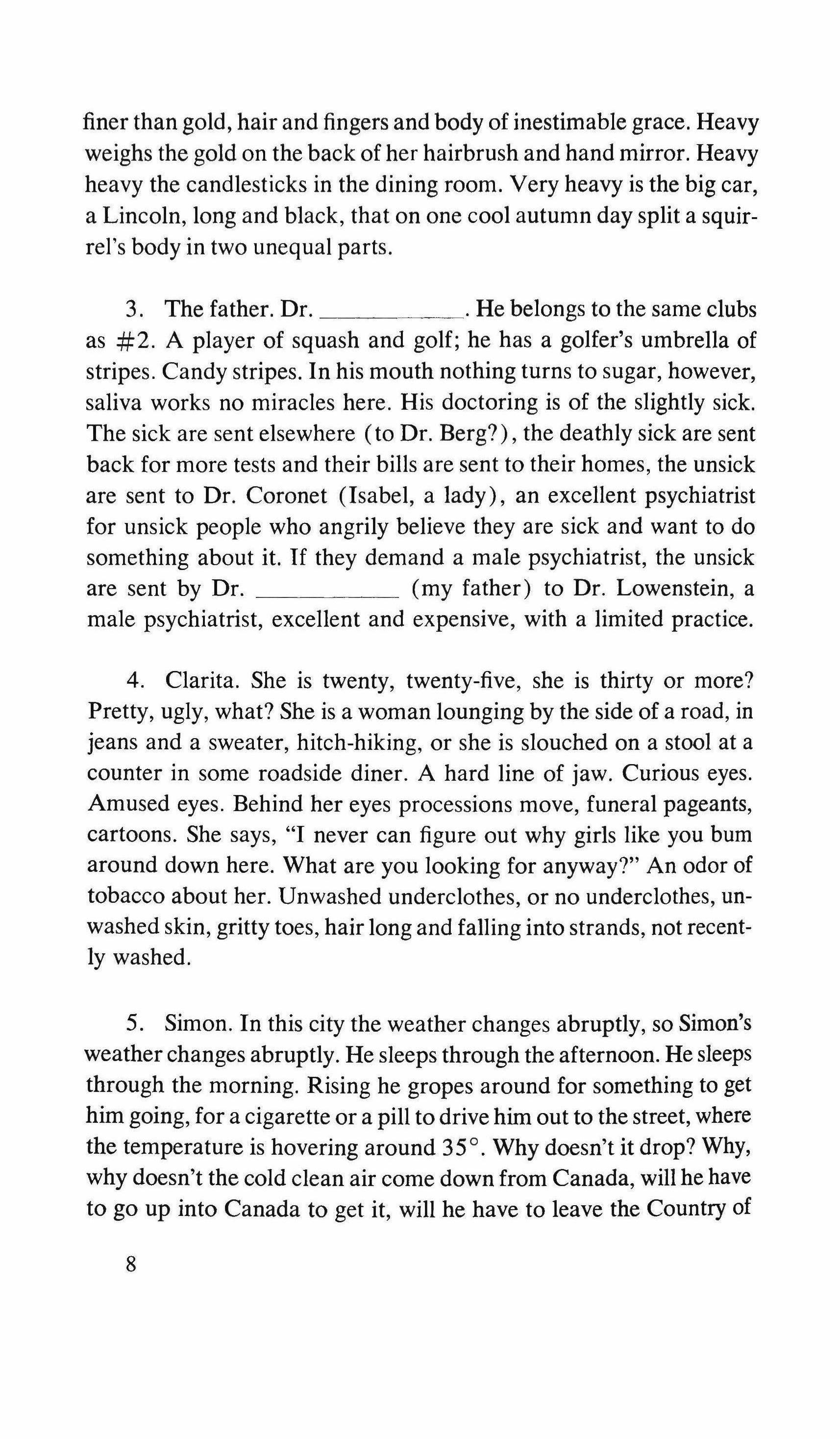 Yes: the pretending is over for all of us. The fist that pressed against my arm affirms its strength only for a moment; then it relaxes and finally it falls, weak and shaky, before he raises it and takes the wax hand that was on his shoulder; perplexed for the first time, the lady looks at me with eyes that seem to be a wounded bird's, and she cries, and it is a dry moan that doesn't alter the rigid disturbance in her features. The ogres of my mind are suddenly two lonely old people, wounded and abandoned, who can hardly comfort themselves by joining their hands with a shiver that fills me with shame. My imagination brought me into this bare dining room to trespass on the intimacy and secret of two beings who had been expelled from life because of something which I had no right to know about. I have never despised myself so much. I have never had such a crude lack of words. Any gesture I might make would be in vain: should I go up to them, touch them, caress the lady's head, ask to be excused for interfering? I put my notebook in the pocket of my jacket. I cast out of my mind all the clues I had for my detective story: the comic book, the lipstick tube, the nibbled fruit, the bicycle tracks, the bluechecked apron I decide to leave this house without a word. The old man, behind the thick eyelids, must have noticed me. He says to me in that wheezy voice: