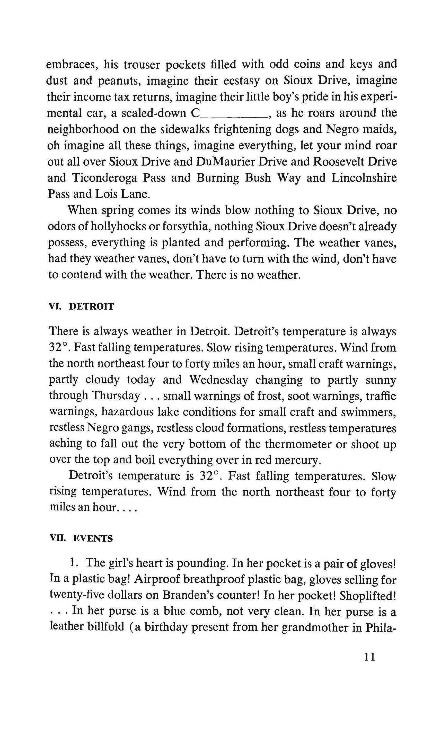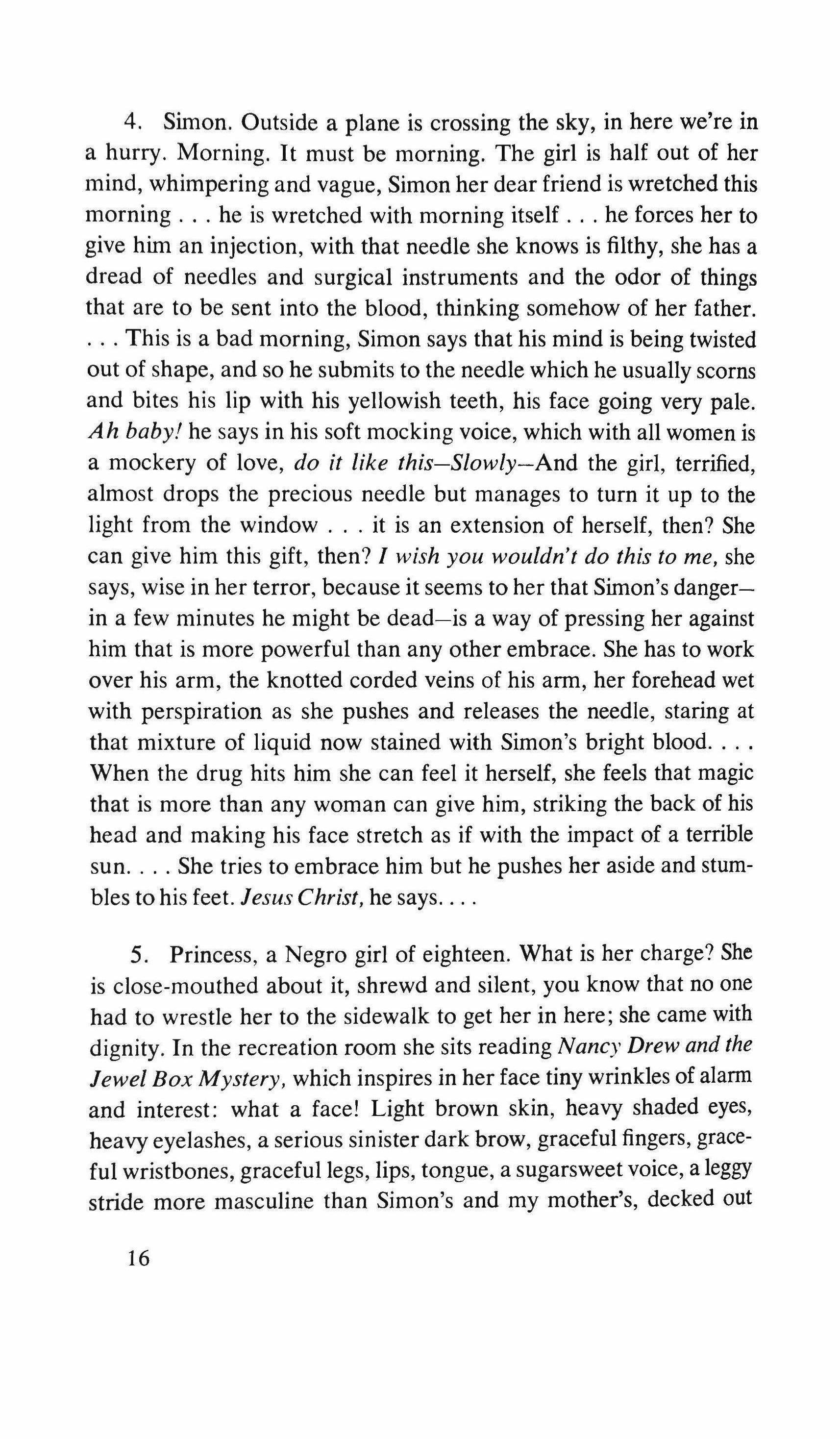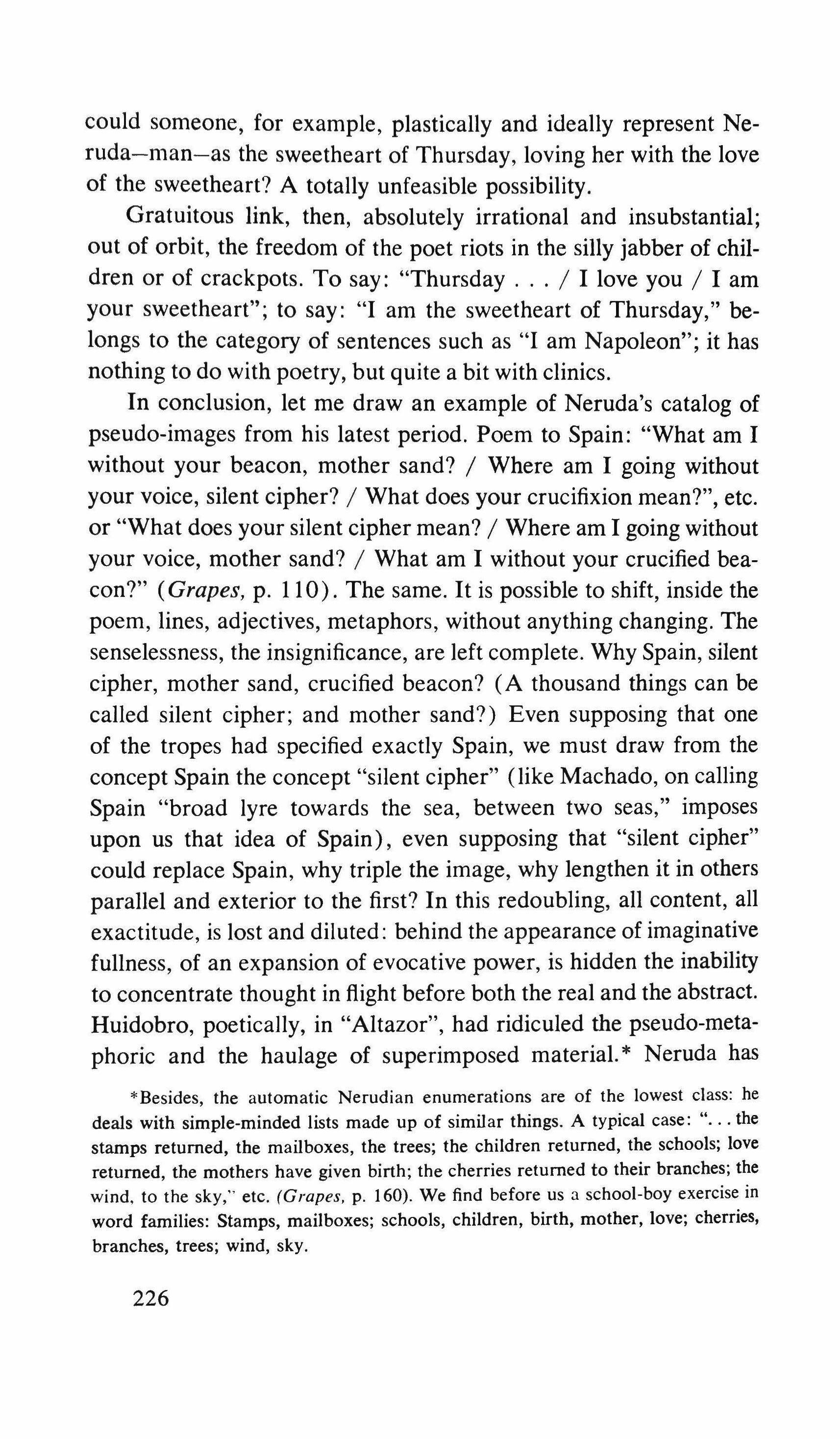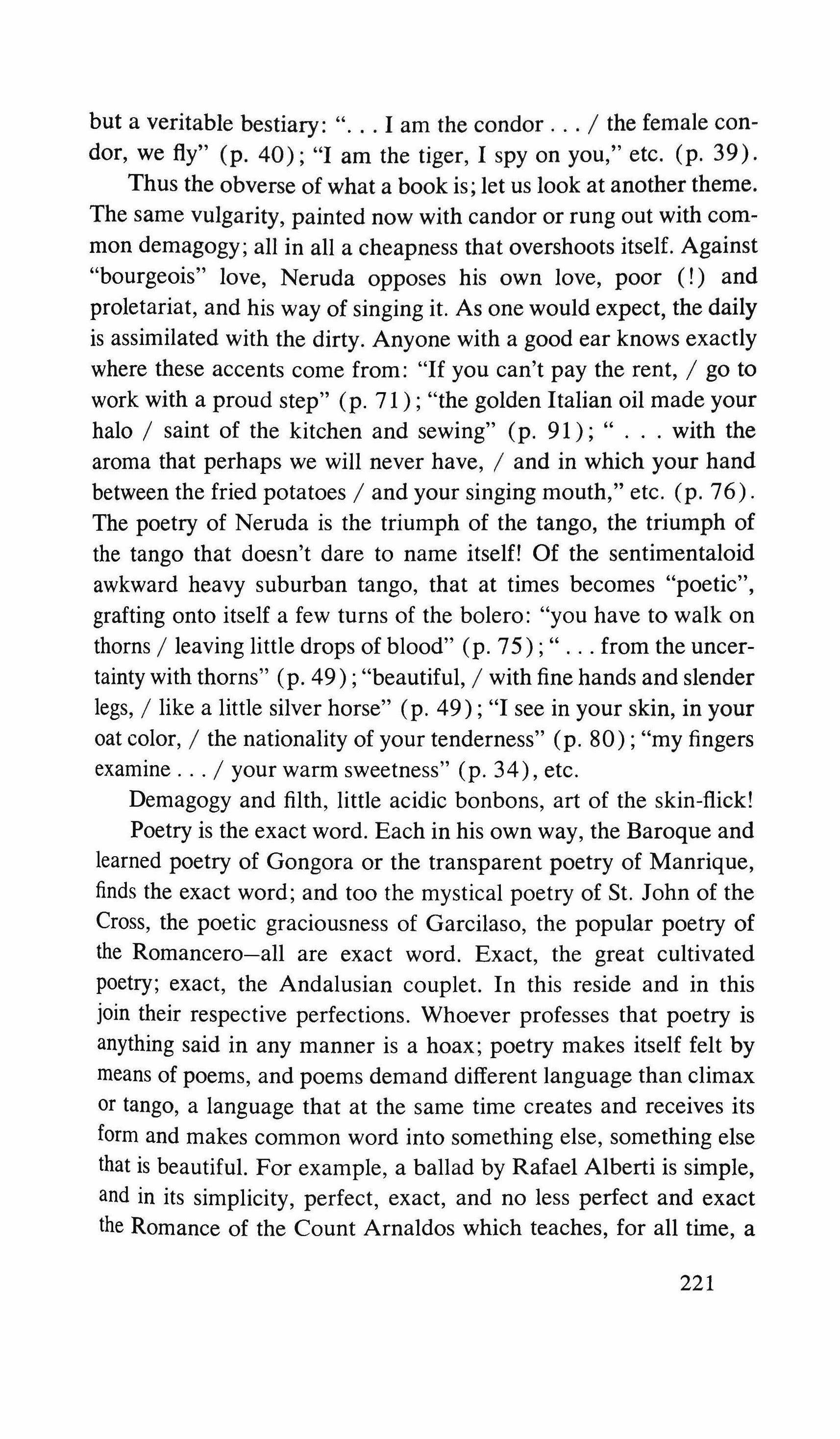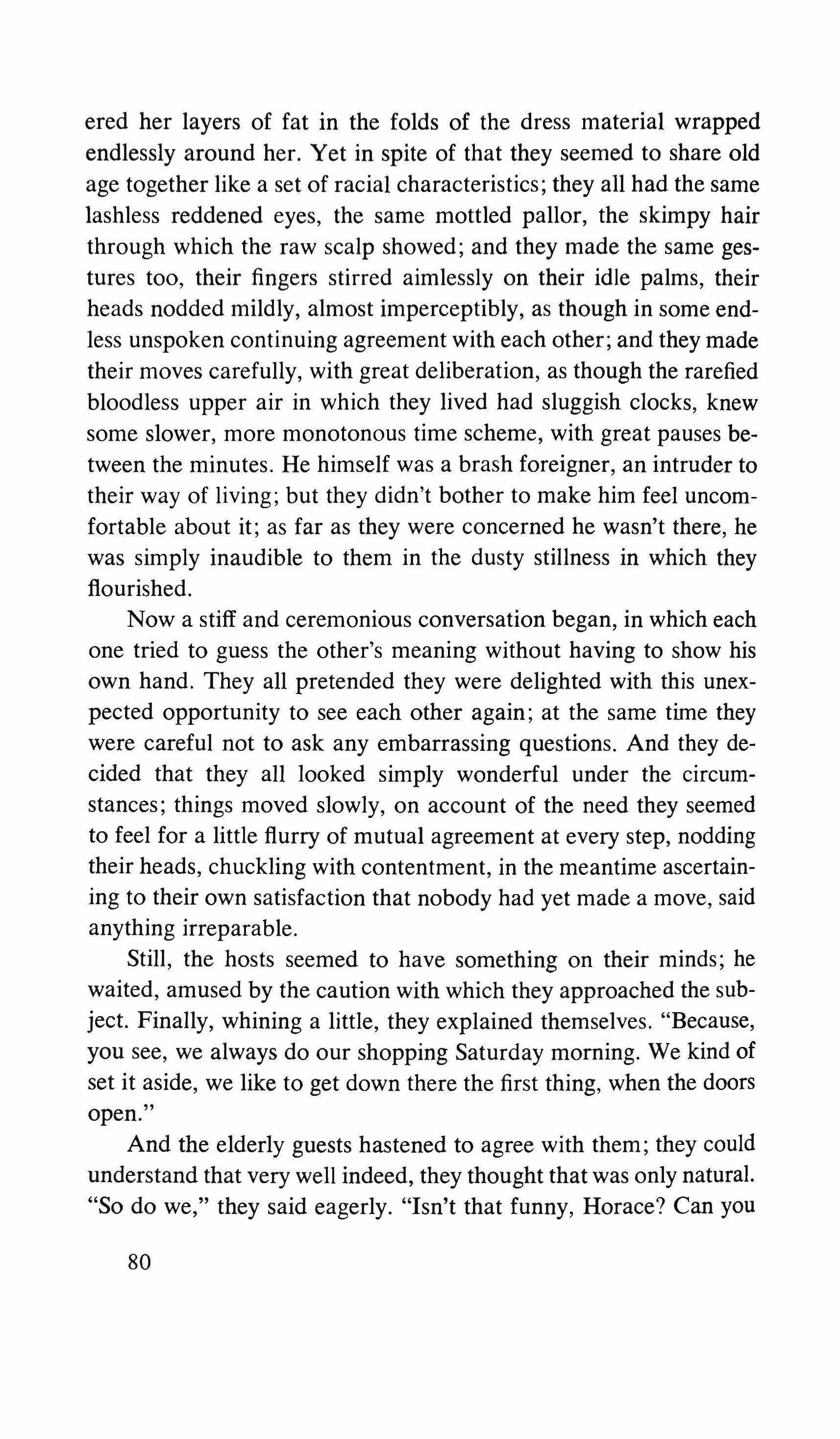 Yes: the pretending is over for all of us. The fist that pressed against my arm affirms its strength only for a moment; then it relaxes and finally it falls, weak and shaky, before he raises it and takes the wax hand that was on his shoulder; perplexed for the first time, the lady looks at me with eyes that seem to be a wounded bird's, and she cries, and it is a dry moan that doesn't alter the rigid disturbance in her features. The ogres of my mind are suddenly two lonely old people, wounded and abandoned, who can hardly comfort themselves by joining their hands with a shiver that fills me with shame. My imagination brought me into this bare dining room to trespass on the intimacy and secret of two beings who had been expelled from life because of something which I had no right to know about. I have never despised myself so much. I have never had such a crude lack of words. Any gesture I might make would be in vain: should I go up to them, touch them, caress the lady's head, ask to be excused for interfering? I put my notebook in the pocket of my jacket. I cast out of my mind all the clues I had for my detective story: the comic book, the lipstick tube, the nibbled fruit, the bicycle tracks, the bluechecked apron I decide to leave this house without a word. The old man, behind the thick eyelids, must have noticed me. He says to me in that wheezy voice: