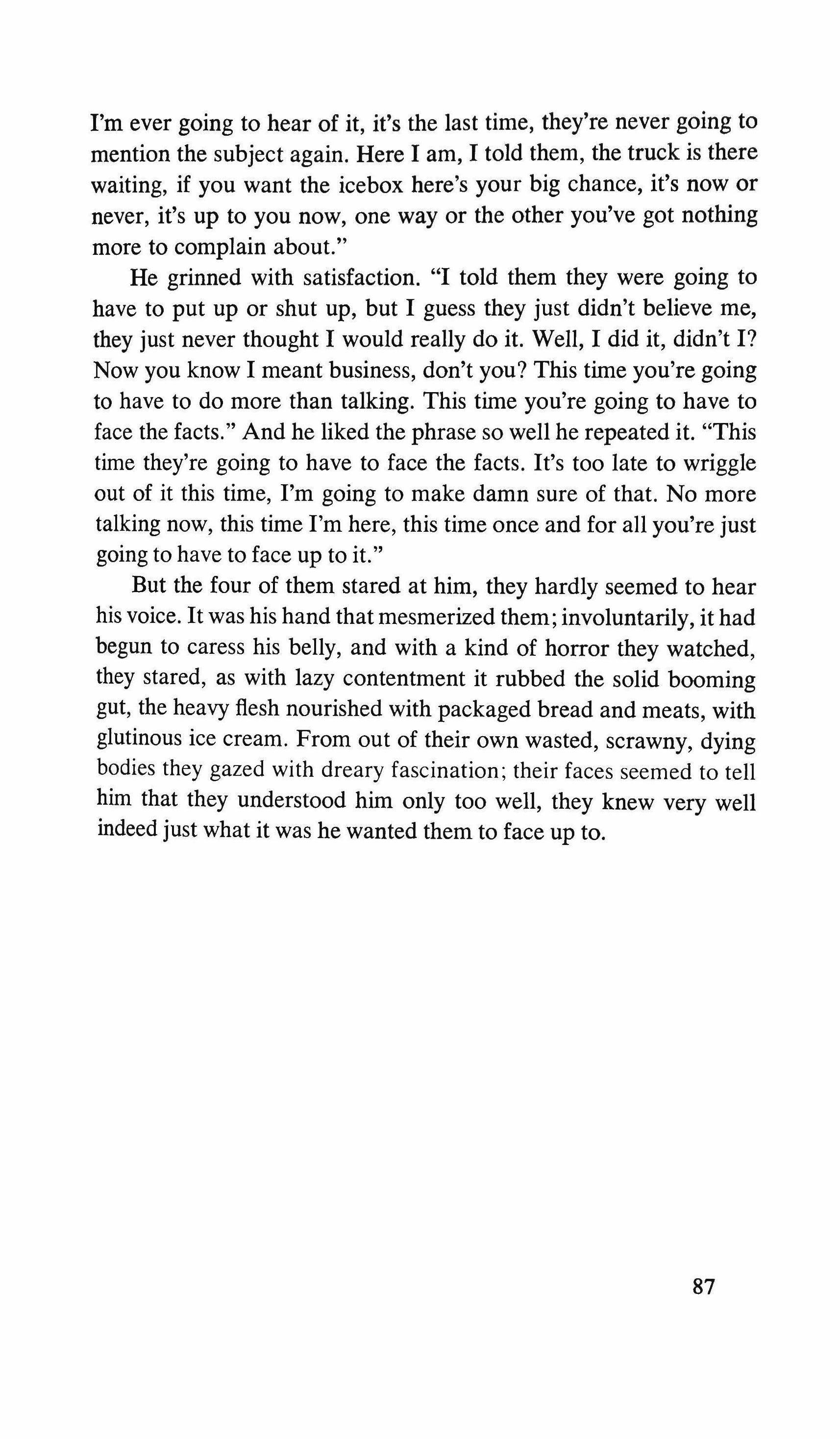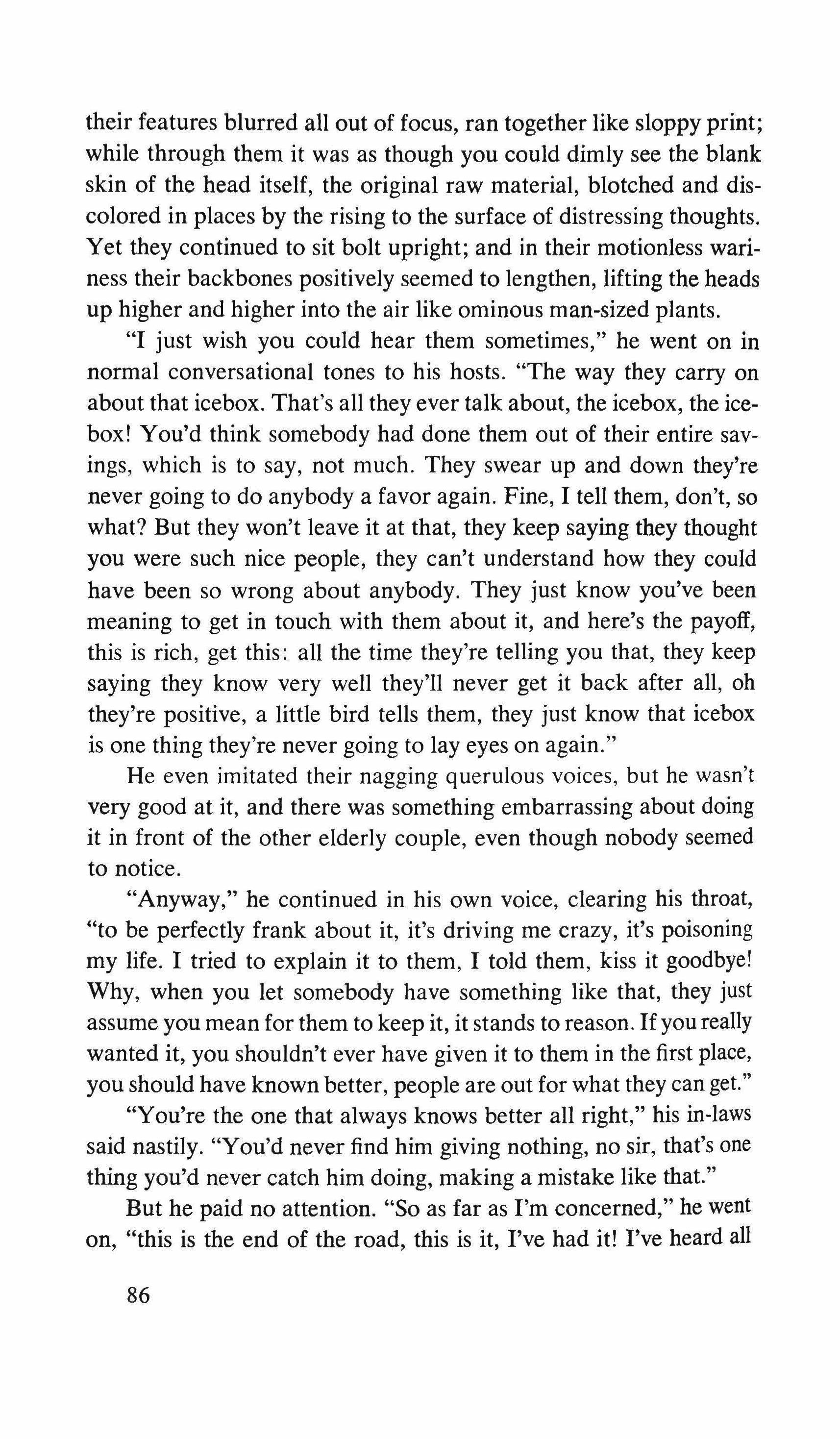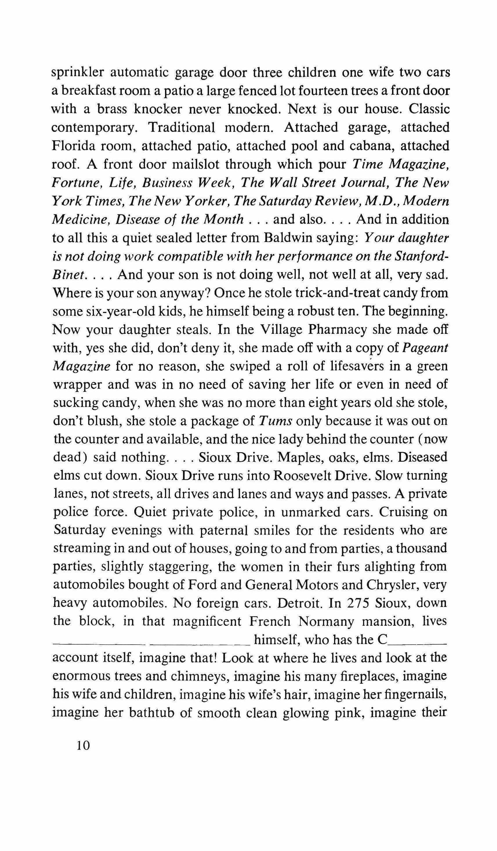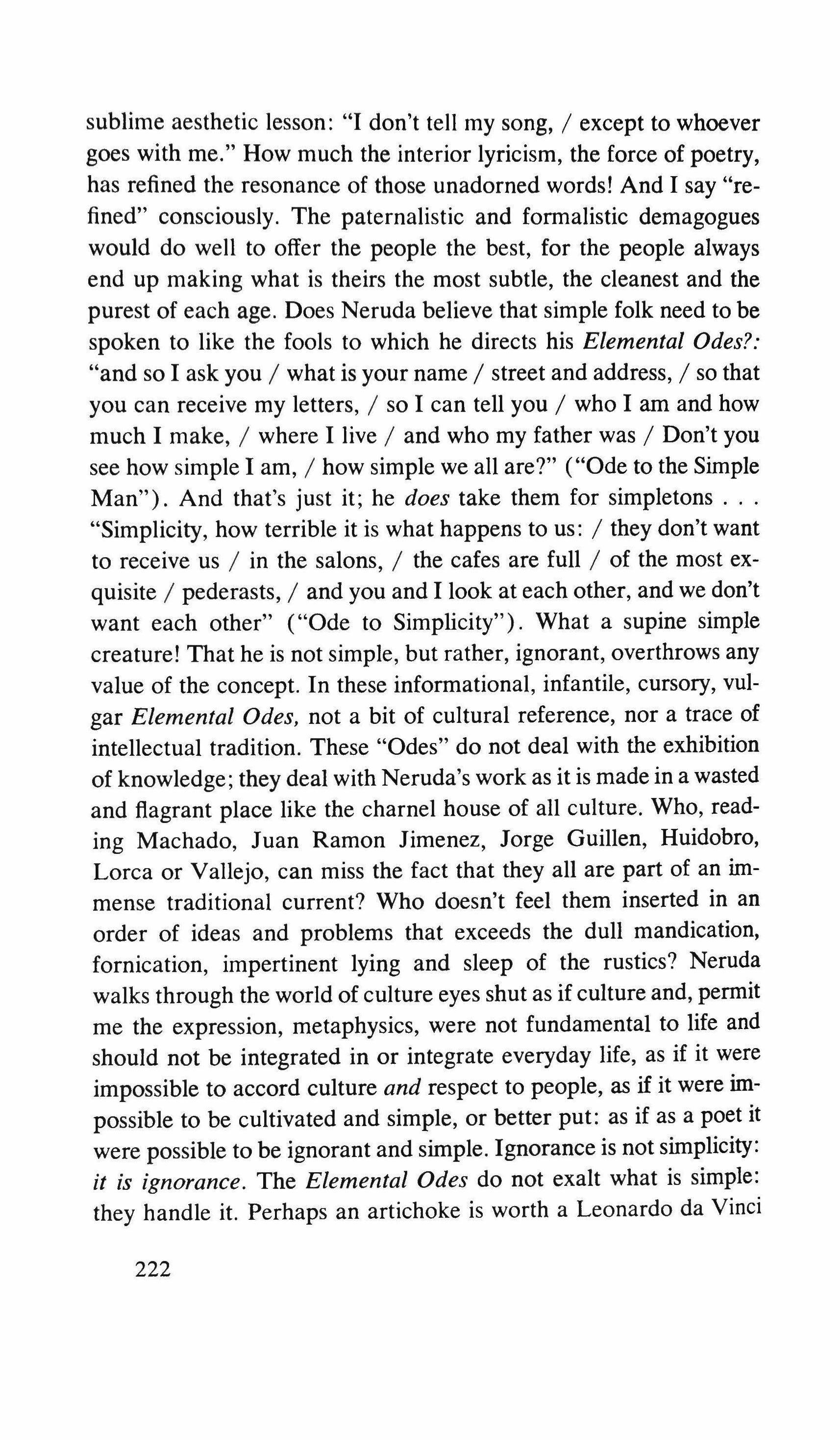 Yes: the pretending is over for all of us. The fist that pressed against my arm affirms its strength only for a moment; then it relaxes and finally it falls, weak and shaky, before he raises it and takes the wax hand that was on his shoulder; perplexed for the first time, the lady looks at me with eyes that seem to be a wounded bird's, and she cries, and it is a dry moan that doesn't alter the rigid disturbance in her features. The ogres of my mind are suddenly two lonely old people, wounded and abandoned, who can hardly comfort themselves by joining their hands with a shiver that fills me with shame. My imagination brought me into this bare dining room to trespass on the intimacy and secret of two beings who had been expelled from life because of something which I had no right to know about. I have never despised myself so much. I have never had such a crude lack of words. Any gesture I might make would be in vain: should I go up to them, touch them, caress the lady's head, ask to be excused for interfering? I put my notebook in the pocket of my jacket. I cast out of my mind all the clues I had for my detective story: the comic book, the lipstick tube, the nibbled fruit, the bicycle tracks, the bluechecked apron I decide to leave this house without a word. The old man, behind the thick eyelids, must have noticed me. He says to me in that wheezy voice: