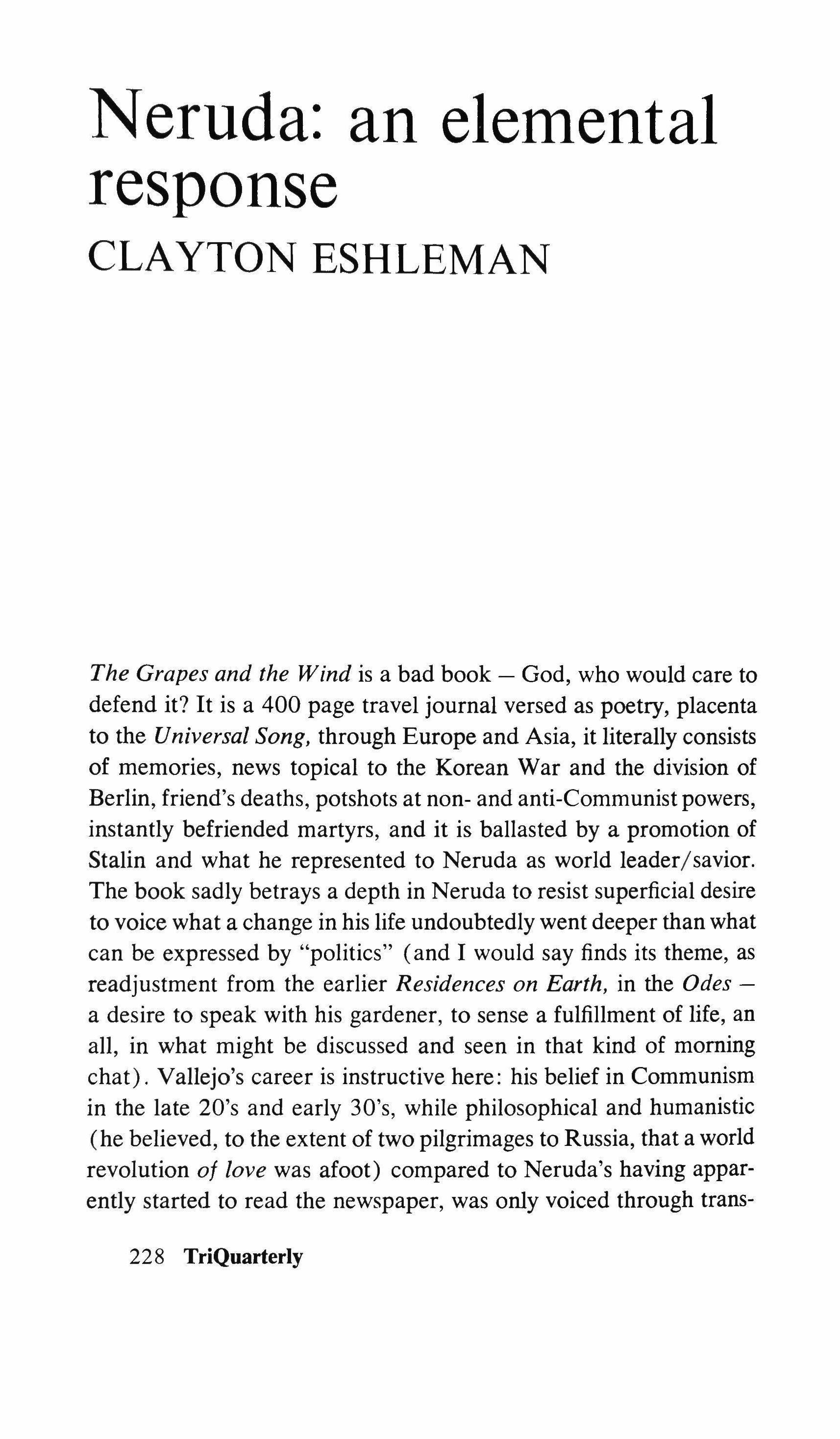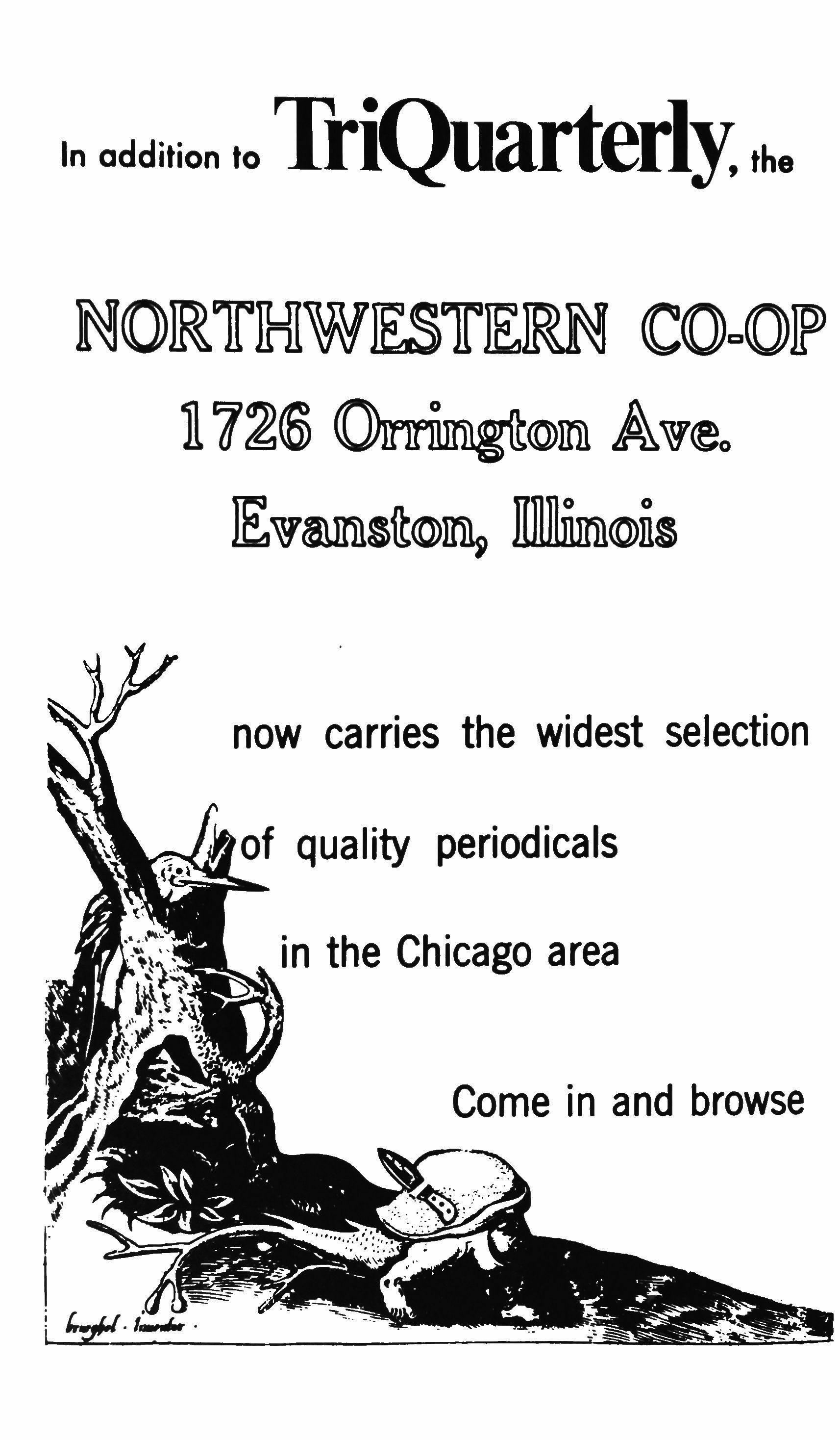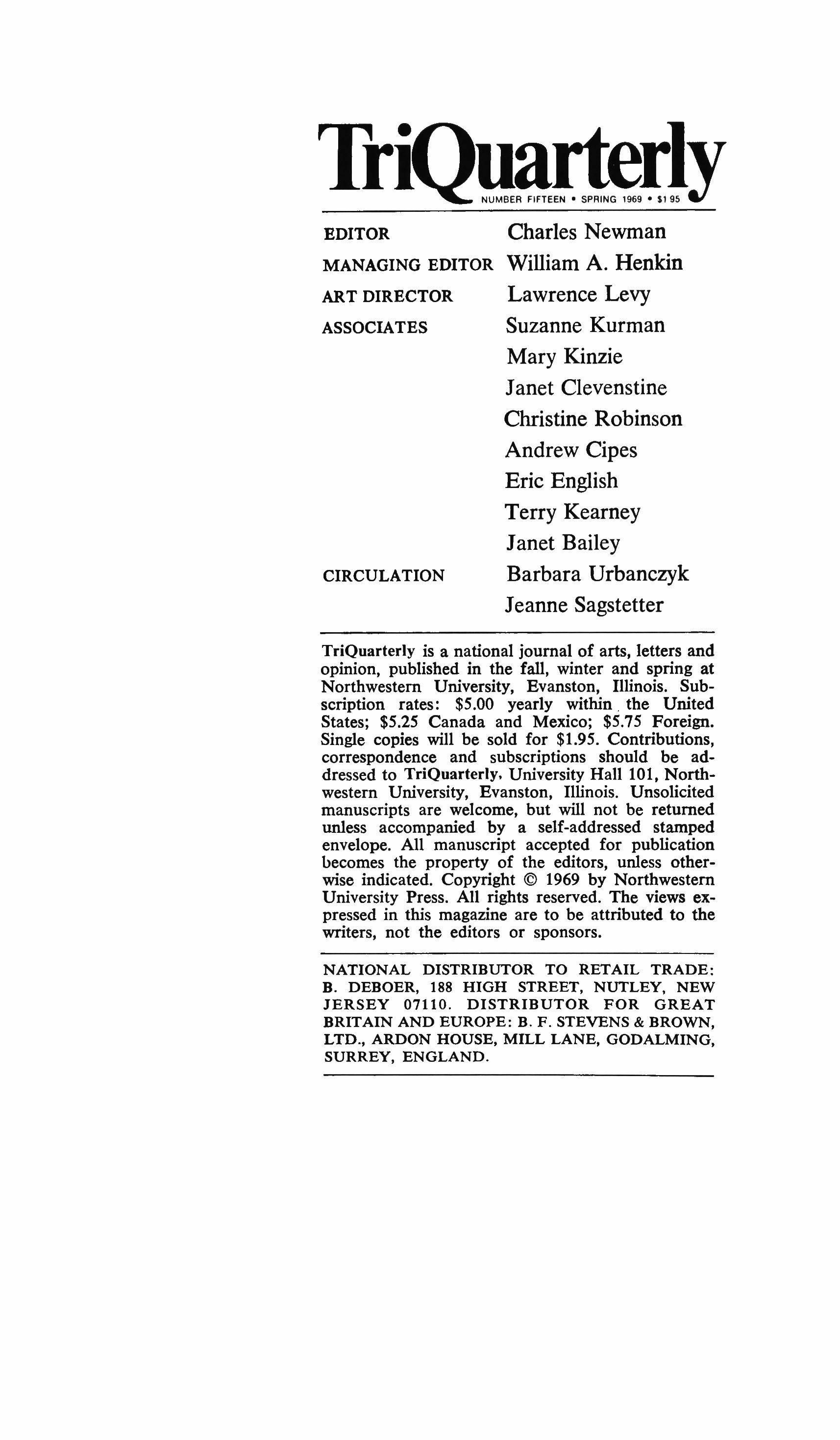 TriQuarterly is a national journal of arts, letters and opinion, published in the fall, winter and spring at Northwestern University, Evanston, Illinois. Subscription rates: $5.00 yearly within. the United States; $5.25 Canada and Mexico; $5.75 Foreign. Single copies will be sold for $1.95. Contributions, correspondence and SUbscriptions should be addressed to TriQuarterly, University Hall 101, Northwestern University, Evanston, Illinois. Unsolicited manuscripts are welcome, but will not be returned unless accompanied by a self-addressed stamped envelope. All manuscript accepted for publication becomes the property of the editors, unless otherwise indicated. Copyright © 1969 by Northwestern University Press. All rights reserved. The views expressed in this magazine are to be attributed to the writers, not the editors or sponsors.