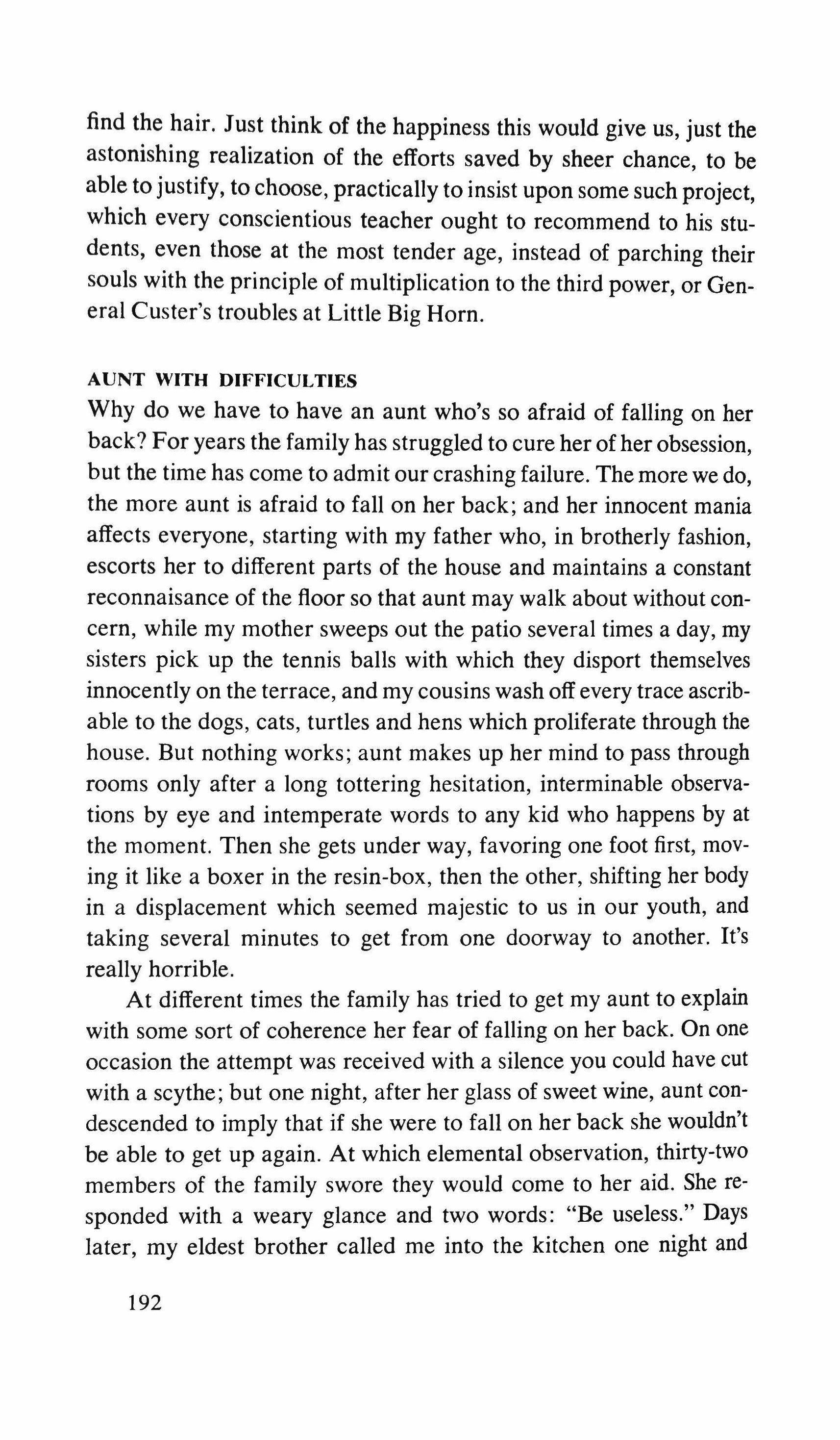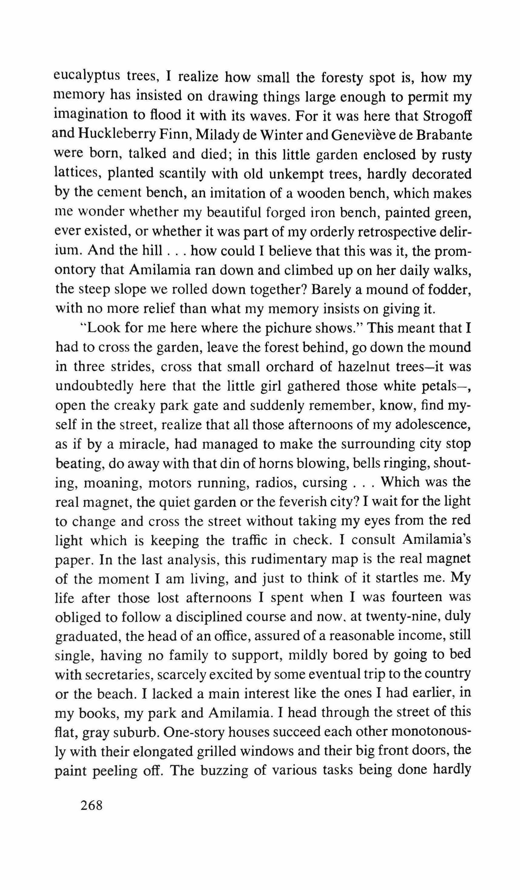 eucalyptus trees, I realize how small the foresty spot is, how my memory has insisted on drawing things large enough to permit my imagination to flood it with its waves. For it was here that Strogoff and Huckleberry Finn, Milady de Winter and Genevieve de Brabante were born, talked and died; in this little garden enclosed by rusty lattices, planted scantily with old unkempt trees, hardly decorated by the cement bench, an imitation of a wooden bench, which makes me wonder whether my beautiful forged iron bench, painted green, ever existed, or whether it was part of my orderly retrospective delirium. And the hill how could I believe that this was it, the promontory that Amilamia ran down and climbed up on her daily walks, the steep slope we rolled down together? Barely a mound of fodder, with no more relief than what my memory insists on giving it.