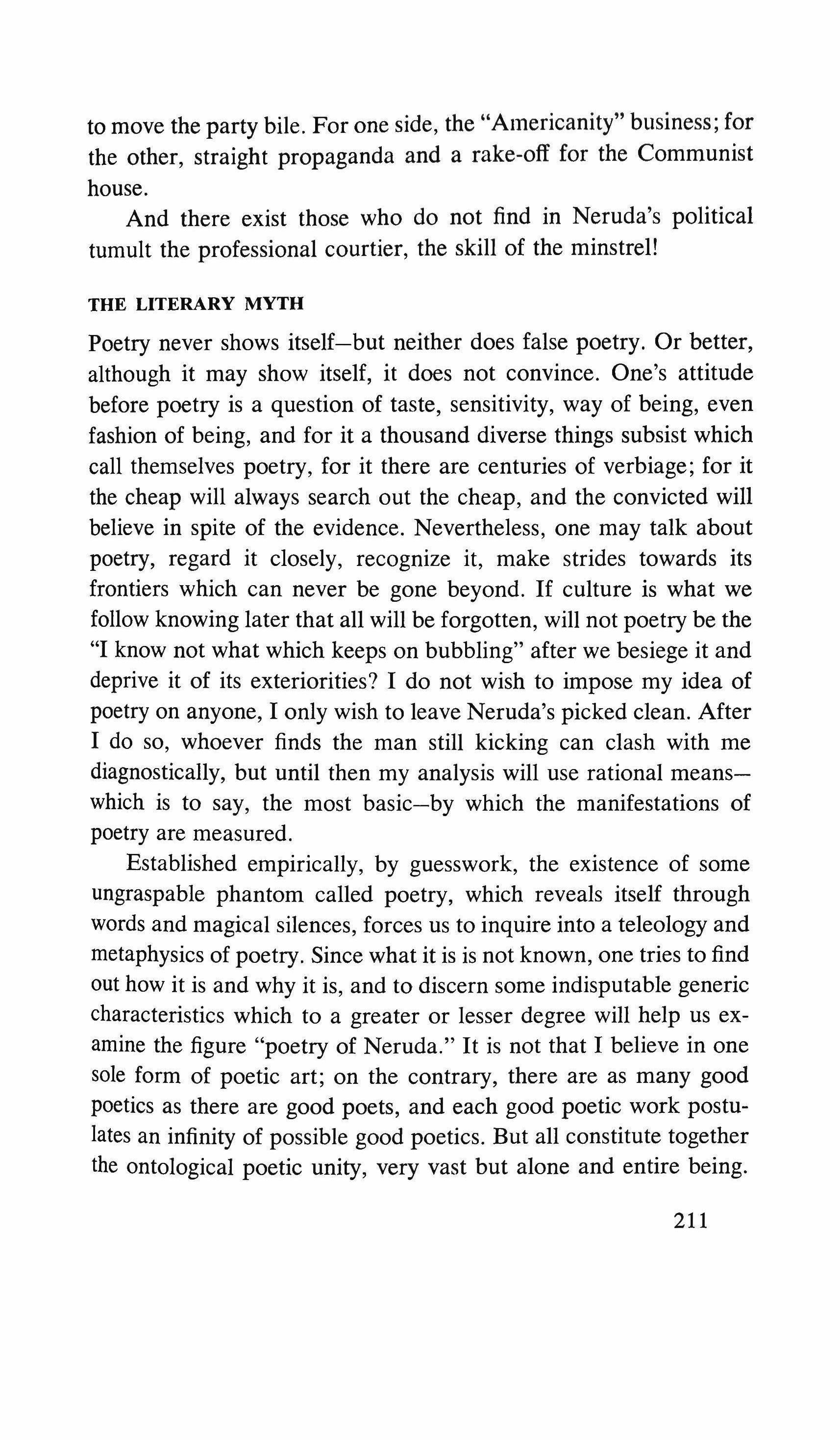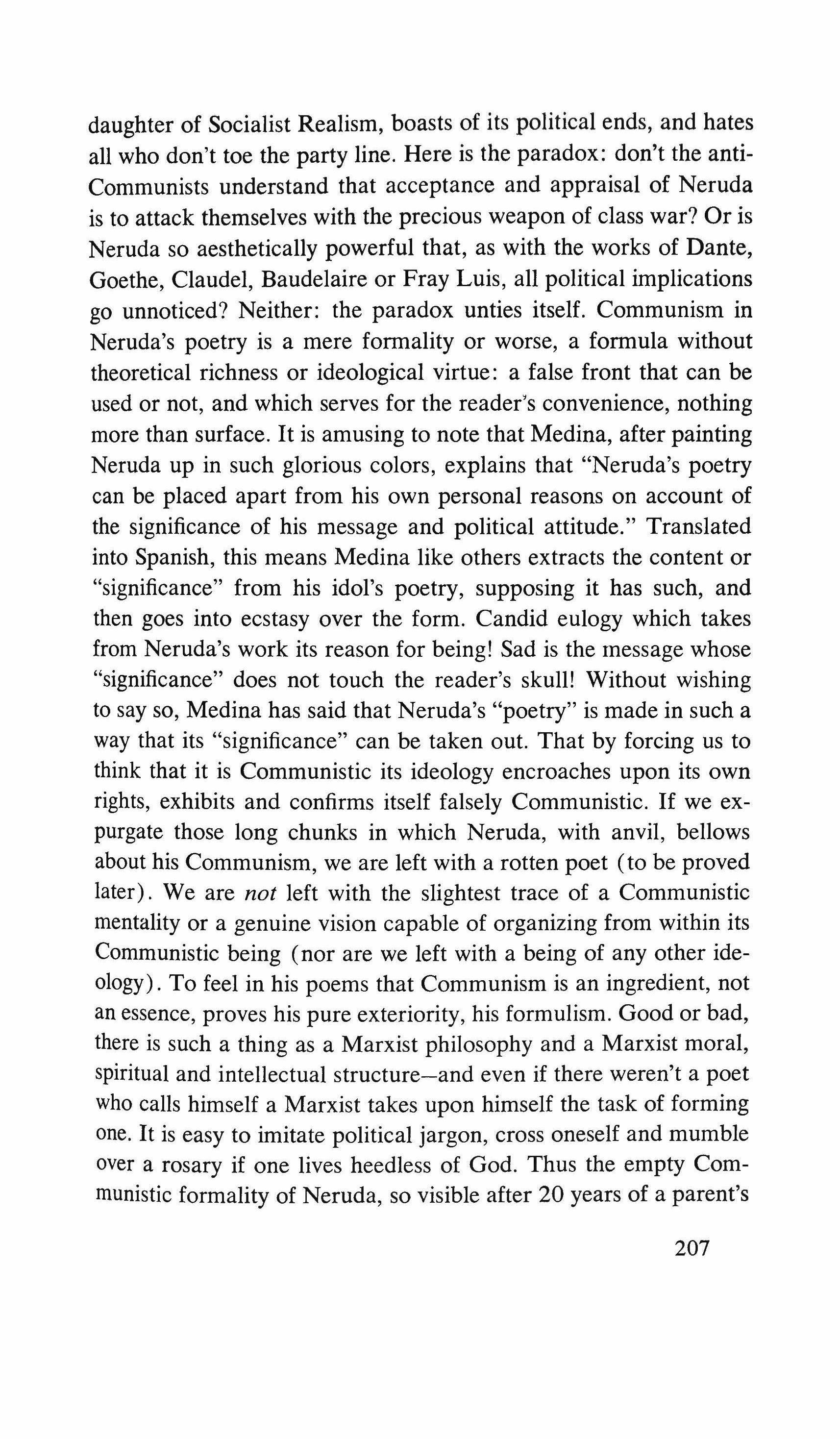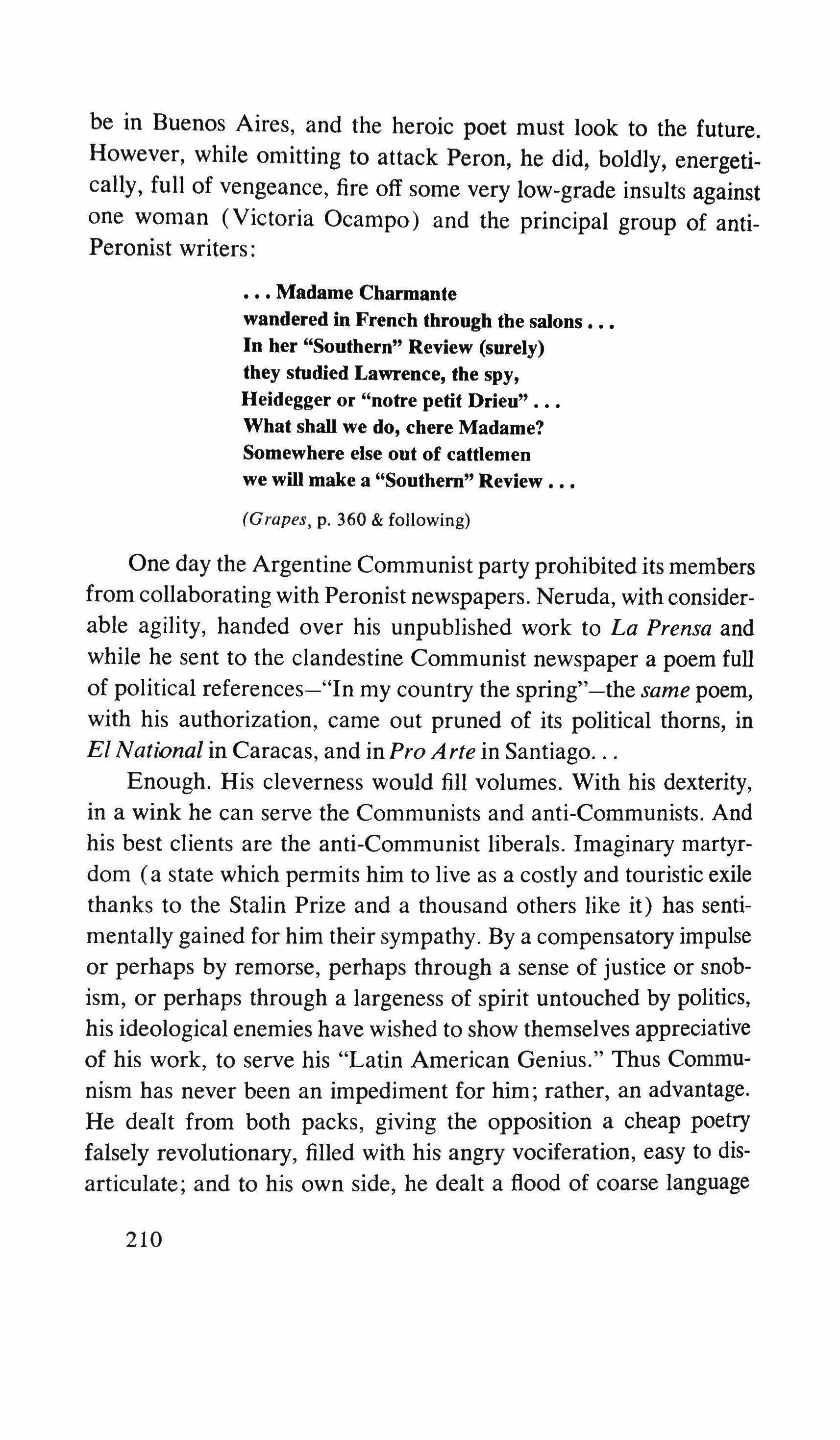 Radical revolt among writers normally takes the form of either abandoning the struggle in disgust and living in Paris, or of joining the Communist Party, within whose intellectual straitjacket a surprising number of writers have found contentment. There is no tradition of the writer as an extra-politicalfigure as there is in Europe or the United States. A Latin American writer is usually associated with a certain political line; he is rarely a maverick. There is a strong tendency to believe that the career of letters is in itself a political gesture, and there is an almost nineteenth century belief that writing can heighten man's awareness of himself and his predicament. A leftwing writer feels that his works are promoting change - even when written in the comfort of a Parisian garret; a right-winger feels that he is defending the bastions of tradition against the incursions of alien thought. Probably their counterparts in Europe or the United States would have a much lower opinion of the effect of the printed word.