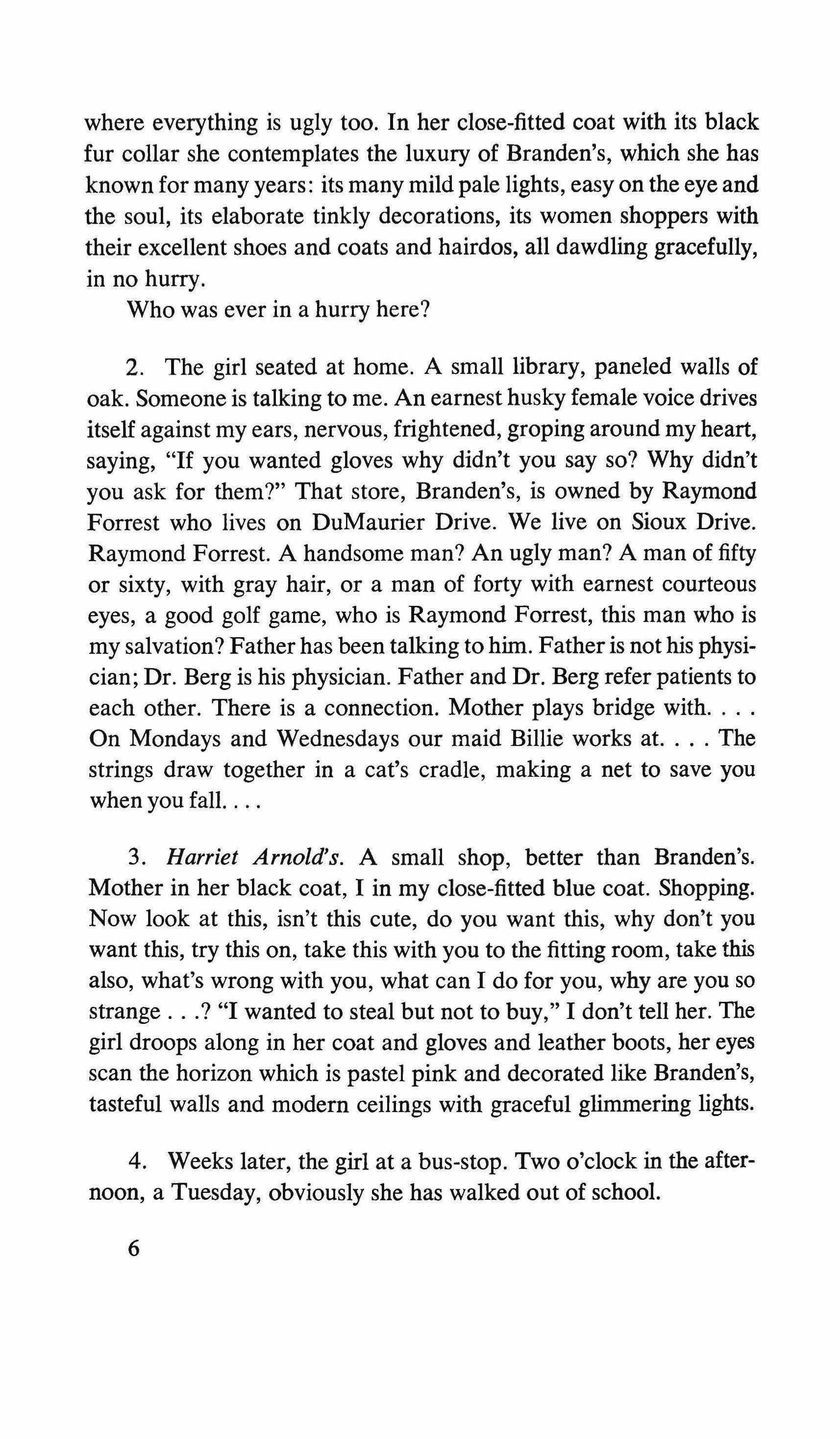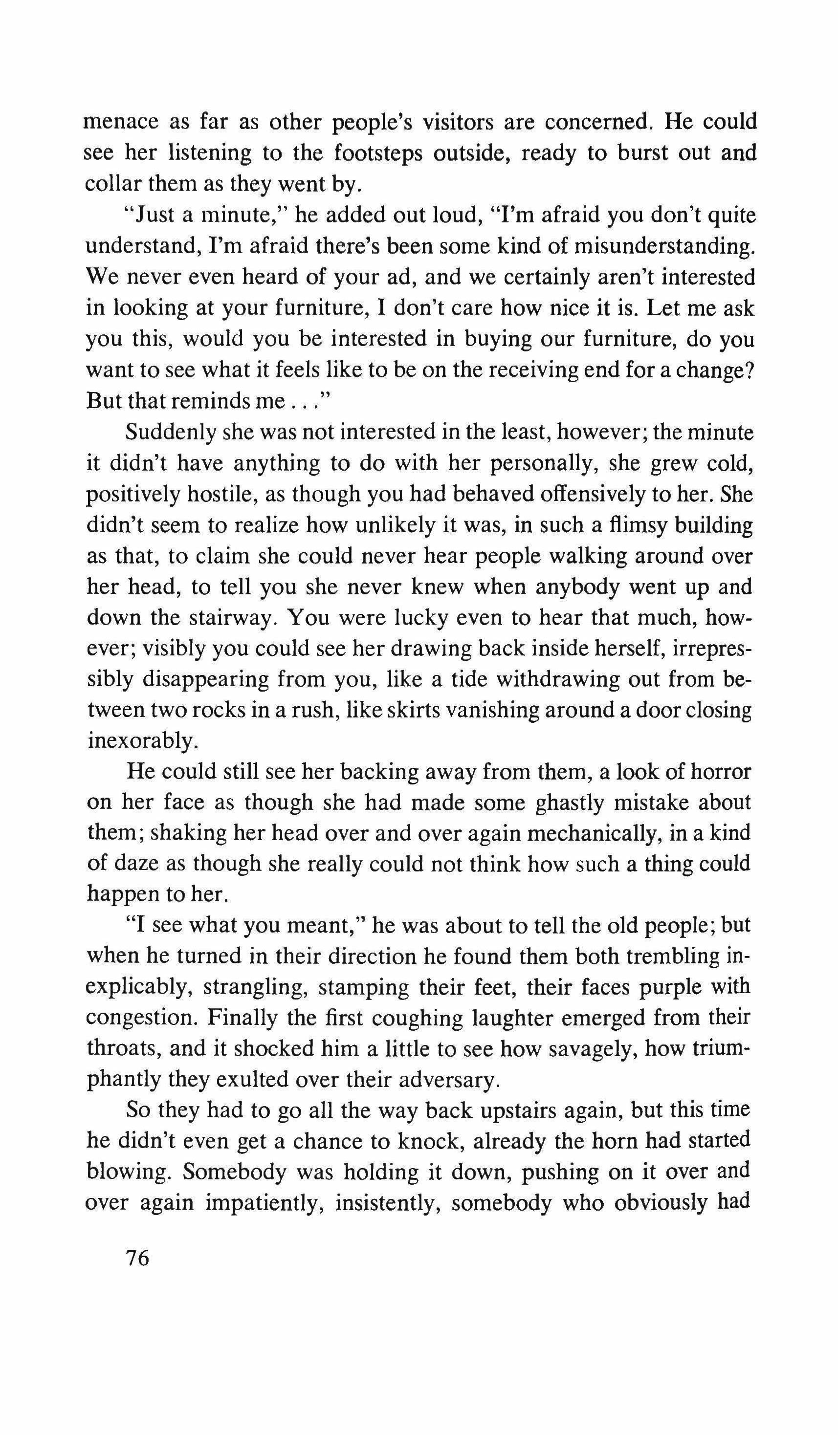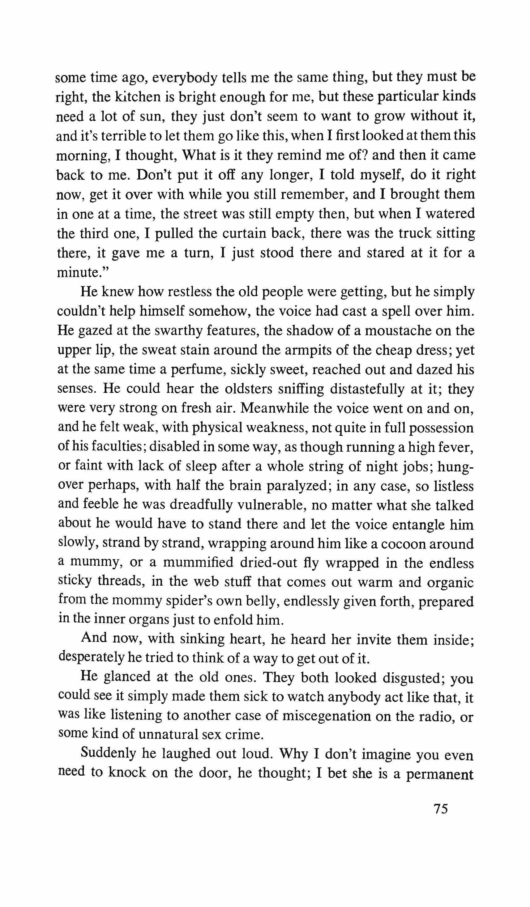 the bell and wait for the hard breathing from the other side of the door. I was wrong. The door is opened by a woman who must not be over fifty. But wrapped in a shawl, dressed in black, and in lowheeled shoes, no make-up, her hair pulled back to the nape of her neck, graying, she seems to have given up any illusion or pretext of youth and she observes me with eyes that are almost cruel, they're so indifferent.