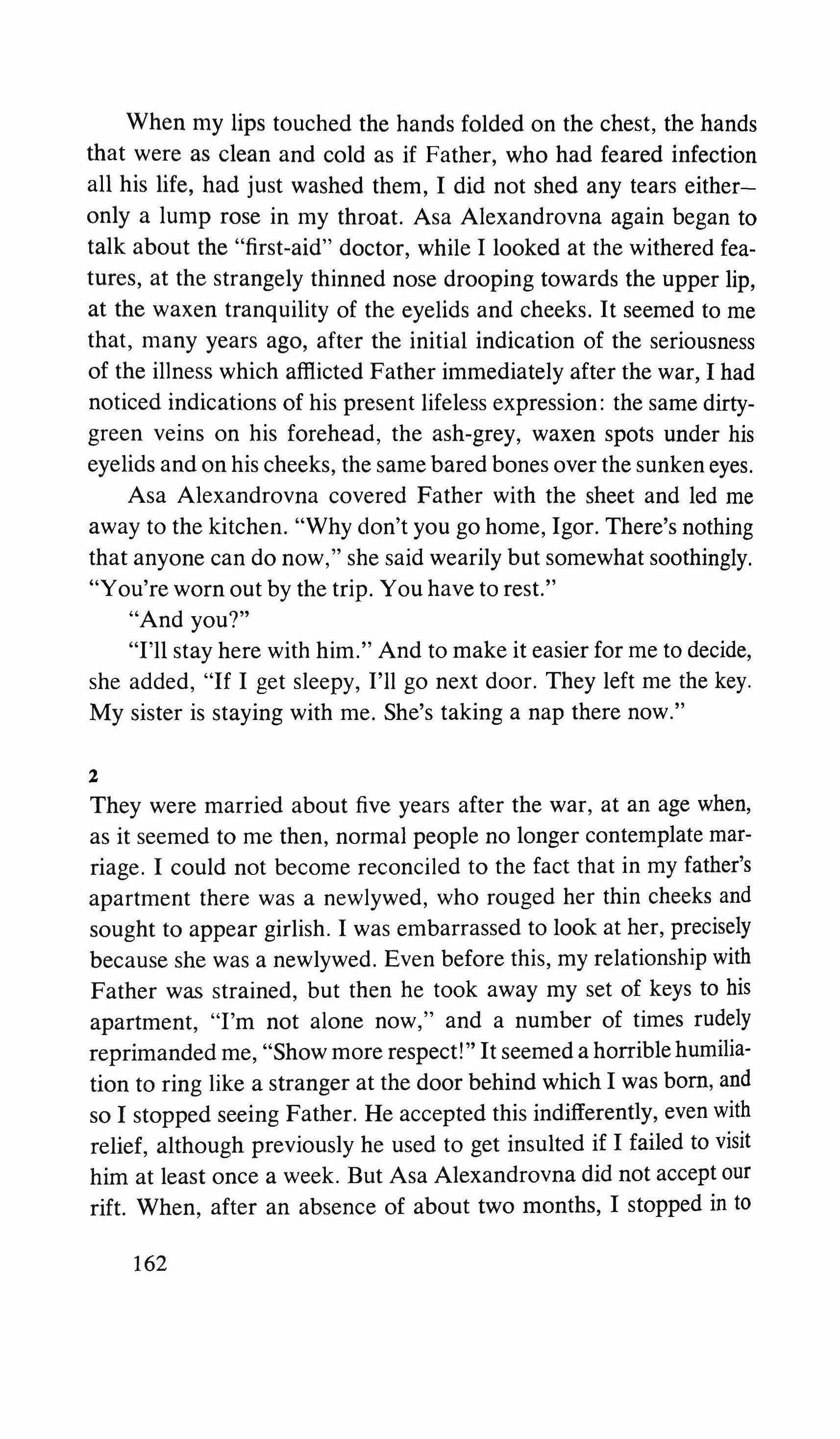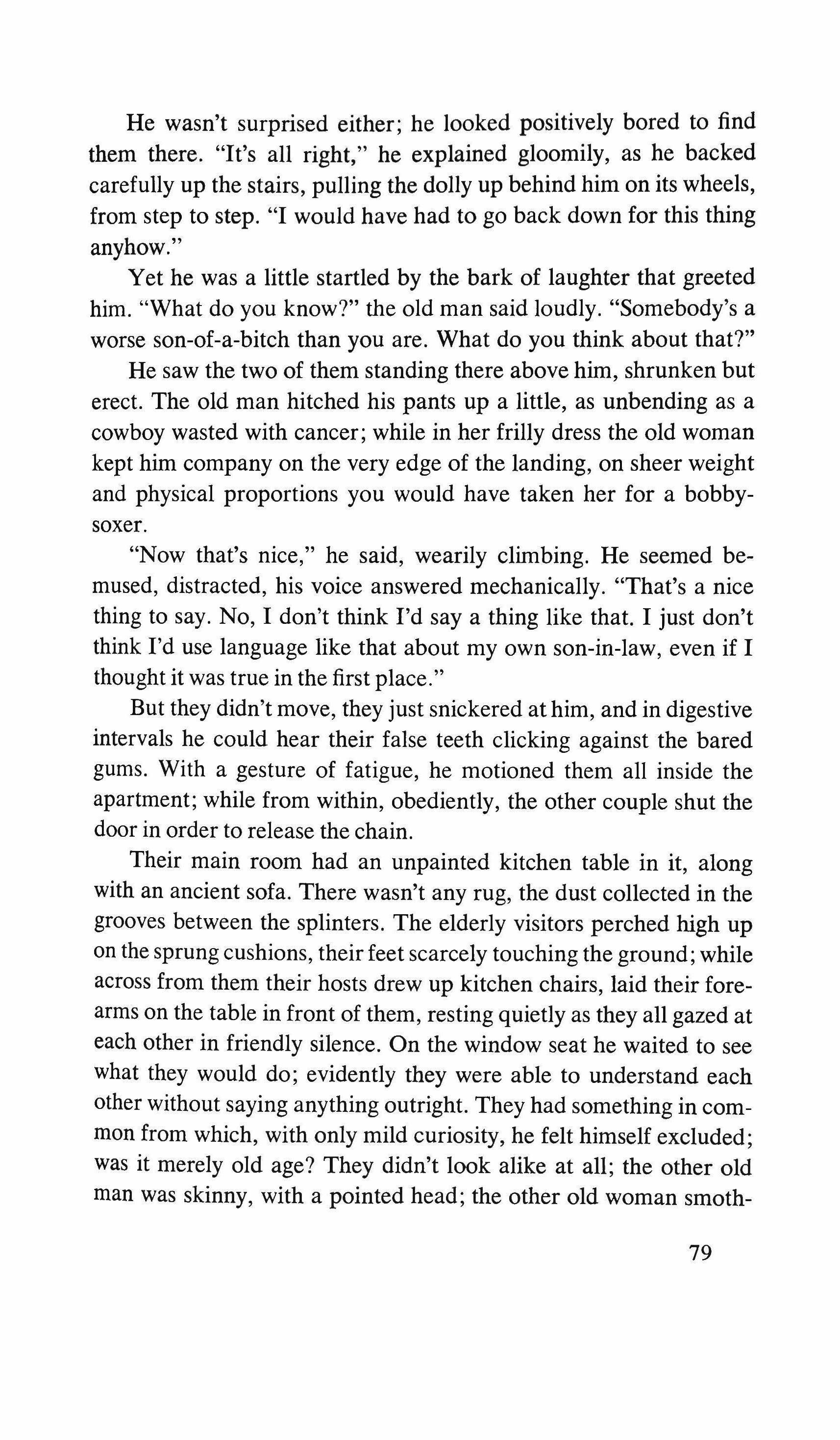 When I turn toward her I find her standing with her hands on the back of a chair. Seated, in front of her, is a heavy-shouldered man with an invisible expression in his eyes, coughing from the smoke of his cigarette: his eyes are hidden by his wrinkled, swollen, thick eyelids, similar to the neck of an old turtle, yet nevertheless they seem to follow my movements. The badly shaved cheeks, cracked by hundreds of gray lines, hang from his prominent cheekbones, and his greenish hands are hidden under his armpits. He is wearing a coarse blue shirt, and his curly hair, mussed up, looks like the bottom of a boat covered with barnacles. He doesn't move and the real sign that he's alive is that hard breathing (as if his breathing had to get through a series of locks made of phlegm, irritation, worn out organs) which I had already heard between the cracks of the front door.