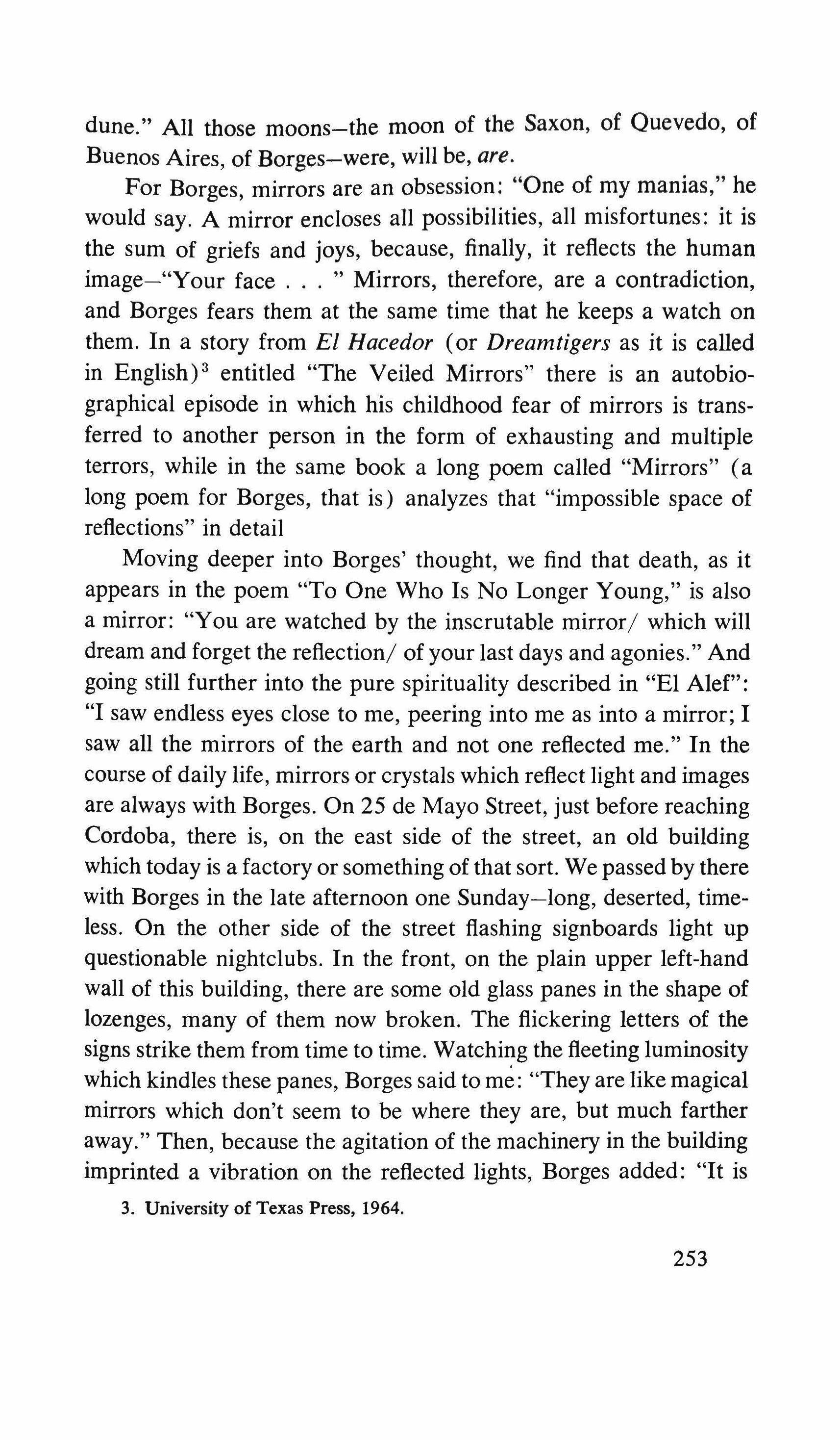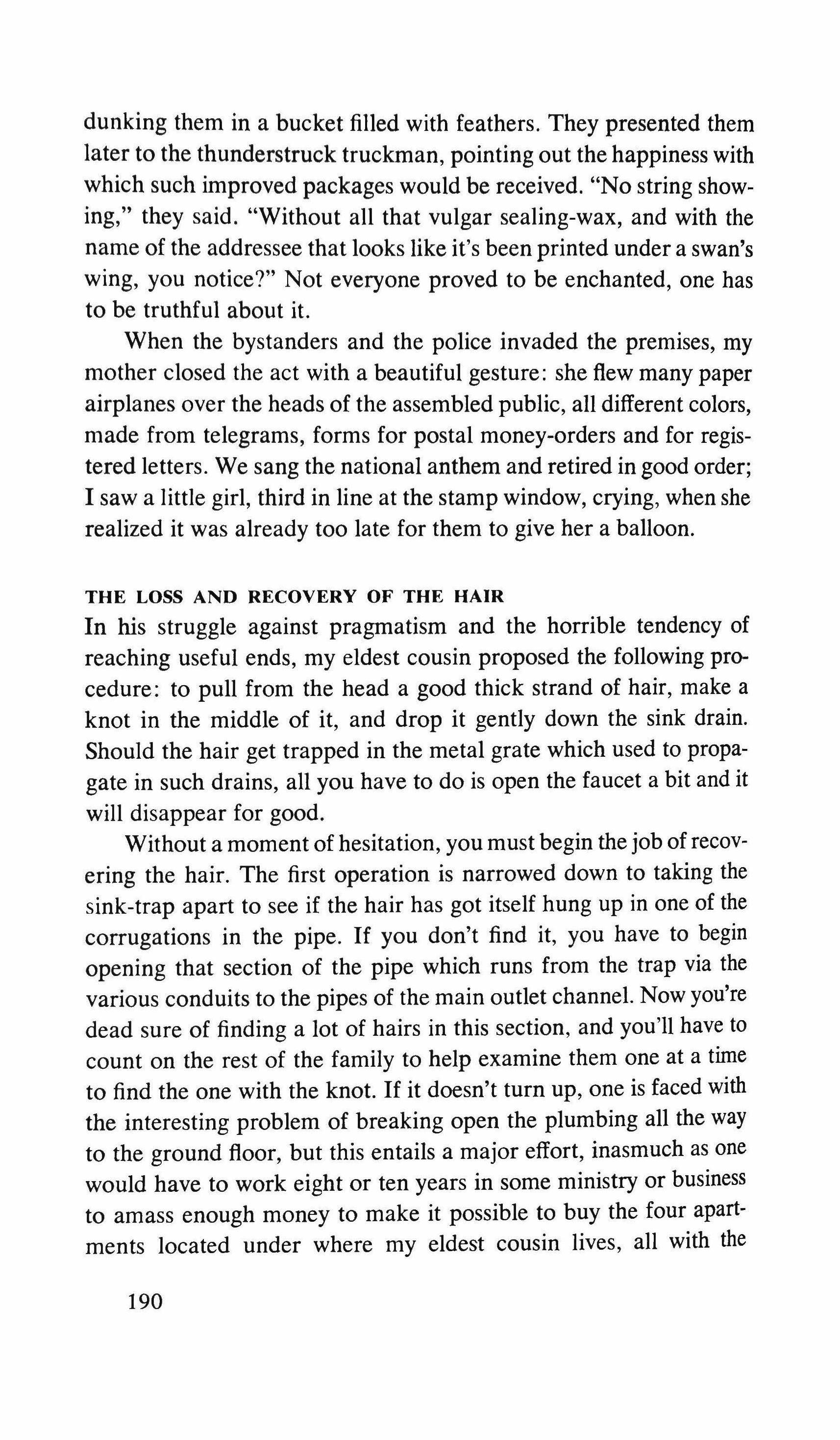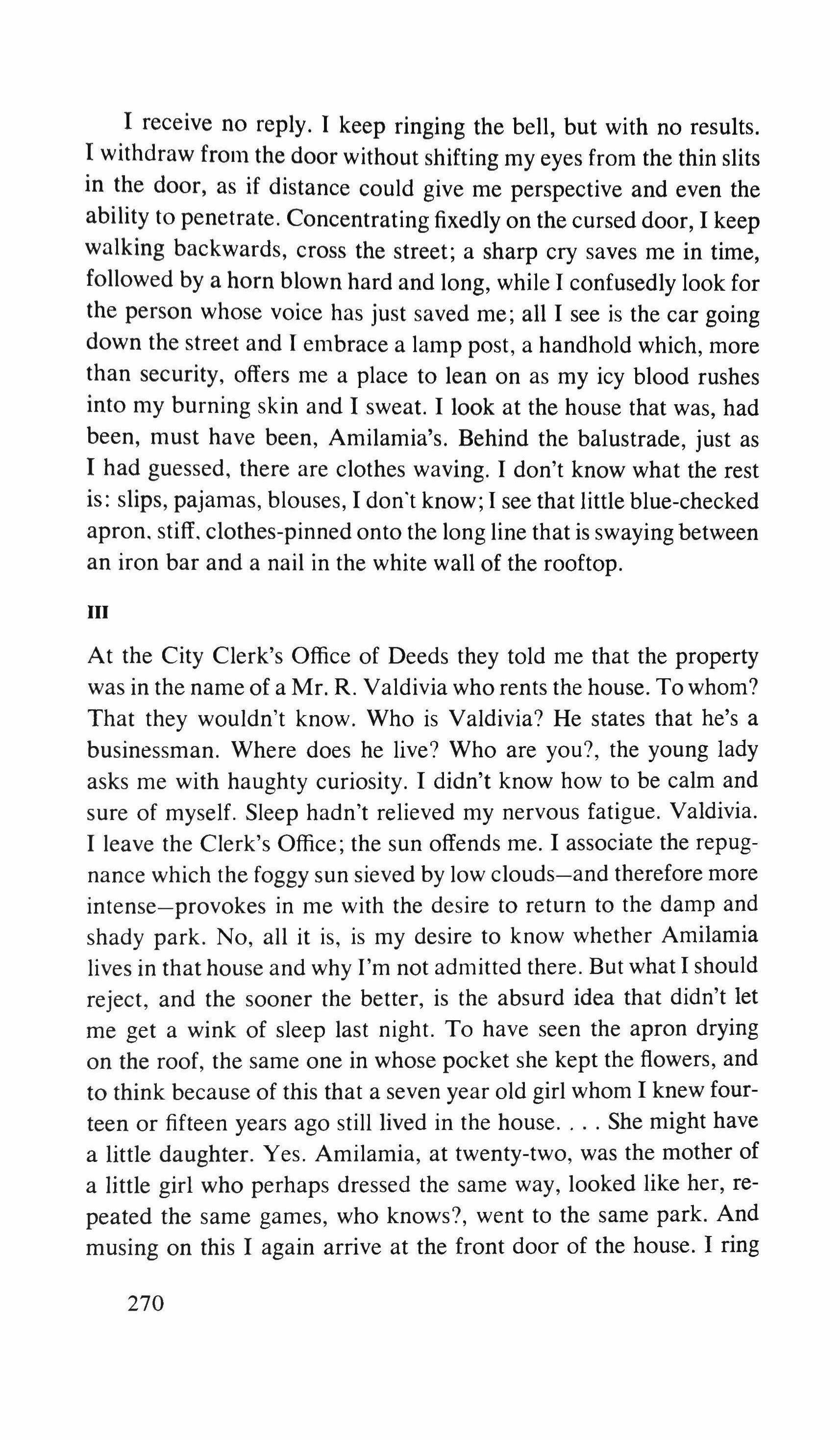 At the City Clerk's Office of Deeds they told me that the property was in the name of a Mr. R. Valdivia who rents the house. To whom? That they wouldn't know. Who is Valdivia? He states that he's a businessman. Where does he live? Who are you?, the young lady asks me with haughty curiosity. I didn't know how to be calm and sure of myself. Sleep hadn't relieved my nervous fatigue. Valdivia. I leave the Clerk's Office; the sun offends me. I associate the repugnance which the foggy sun sieved by low clouds-and therefore more intense-provokes in me with the desire to return to the damp and shady park. No, all it is, is my desire to know whether Amilamia lives in that house and why I'm not admitted there. But what I should reject, and the sooner the better, is the absurd idea that didn't let me get a wink of sleep last night. To have seen the apron drying on the roof, the same one in whose pocket she kept the flowers, and to think because of this that a seven year old girl whom I knew fourteen or fifteen years ago still lived in the house She might have a little daughter. Yes. Amilamia, at twenty-two, was the mother of a little girl who perhaps dressed the same way, looked like her, repeated the same games, who knows?, went to the same park. And musing on this I again arrive at the front door of the house. I ring
