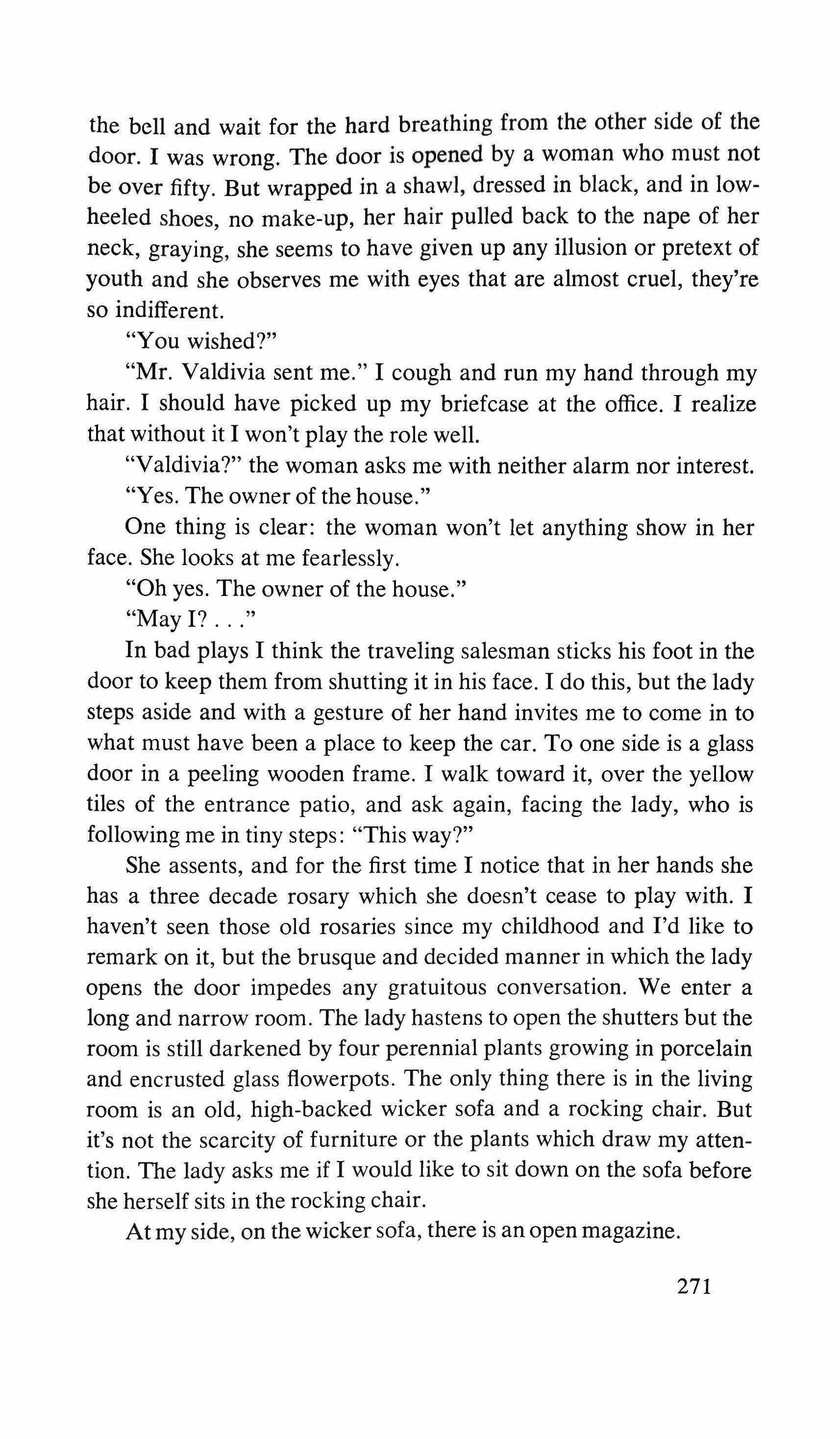 In bad plays I think the traveling salesman sticks his foot in the door to keep them from shutting it in his face. I do this, but the lady steps aside and with a gesture of her hand invites me to come in to what must have been a place to keep the car. To one side is a glass door in a peeling wooden frame. I walk toward it, over the yellow tiles of the entrance patio, and ask again, facing the lady, who is following me in tiny steps: "This way?"