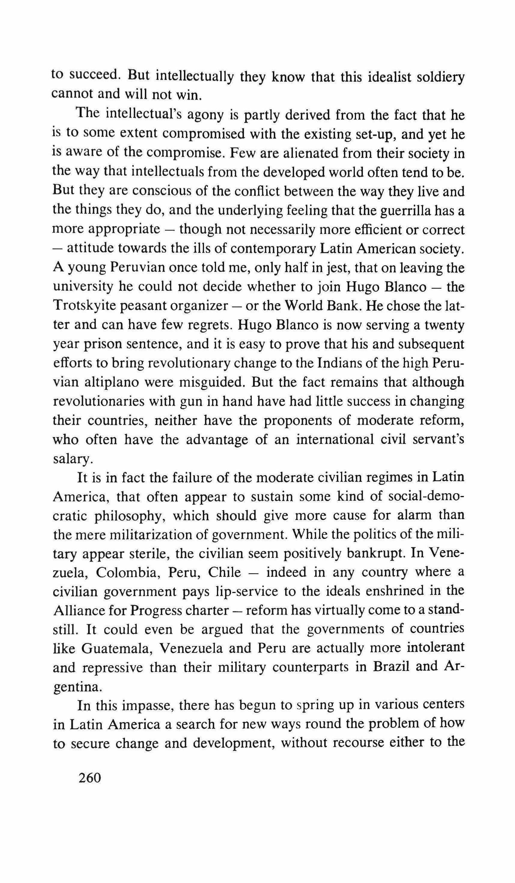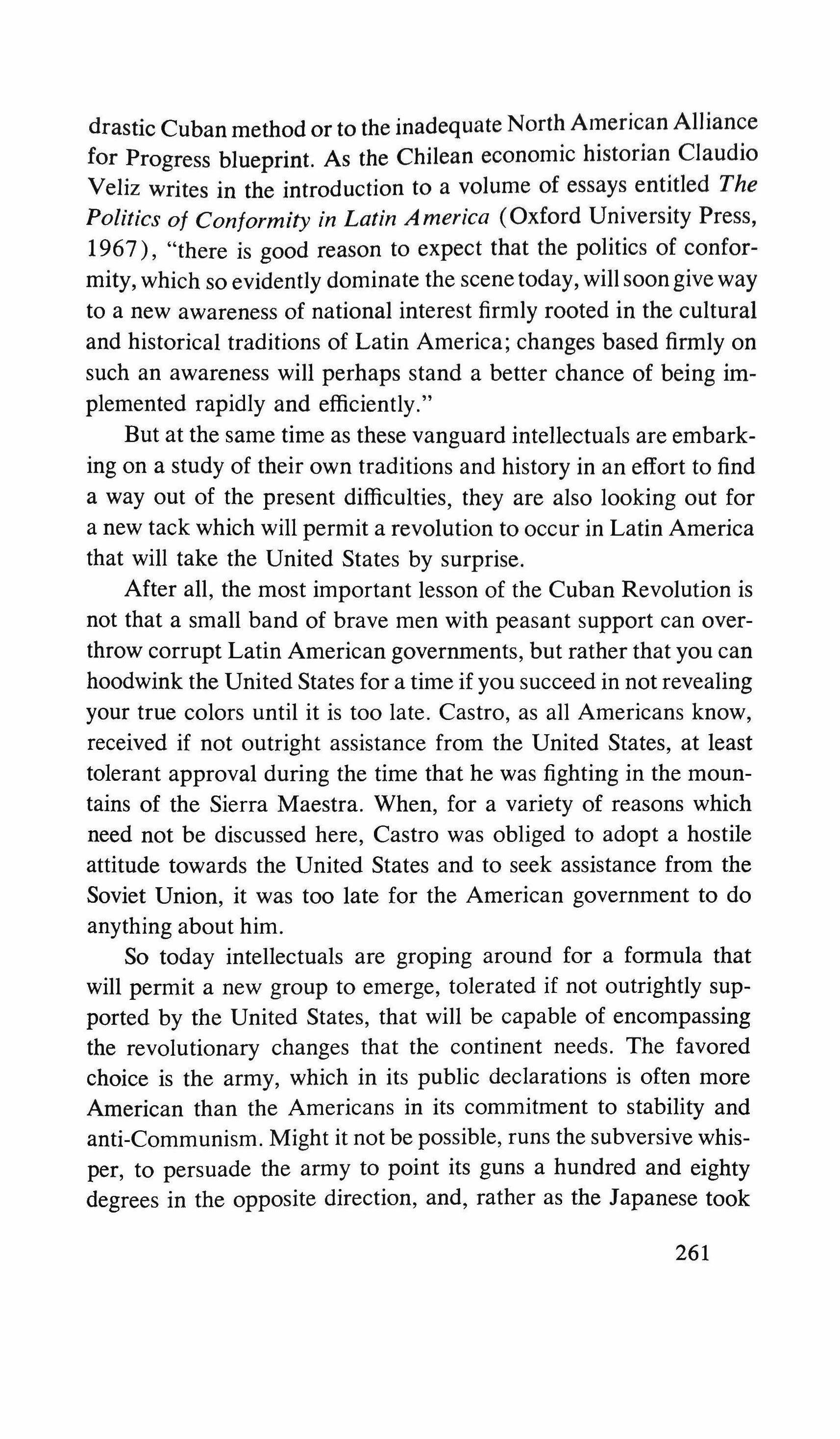 So today intellectuals are groping around for a formula that will permit a new group to emerge, tolerated if not outrightly supported by the United States, that will be capable of encompassing the revolutionary changes that the continent needs. The favored choice is the army, which in its public declarations is often more American than the Americans in its commitment to stability and anti-Communism. Might it not be possible, runs the subversive whisper, to persuade the army to point its guns a hundred and eighty degrees in the opposite direction, and, rather as the Japanese took 261