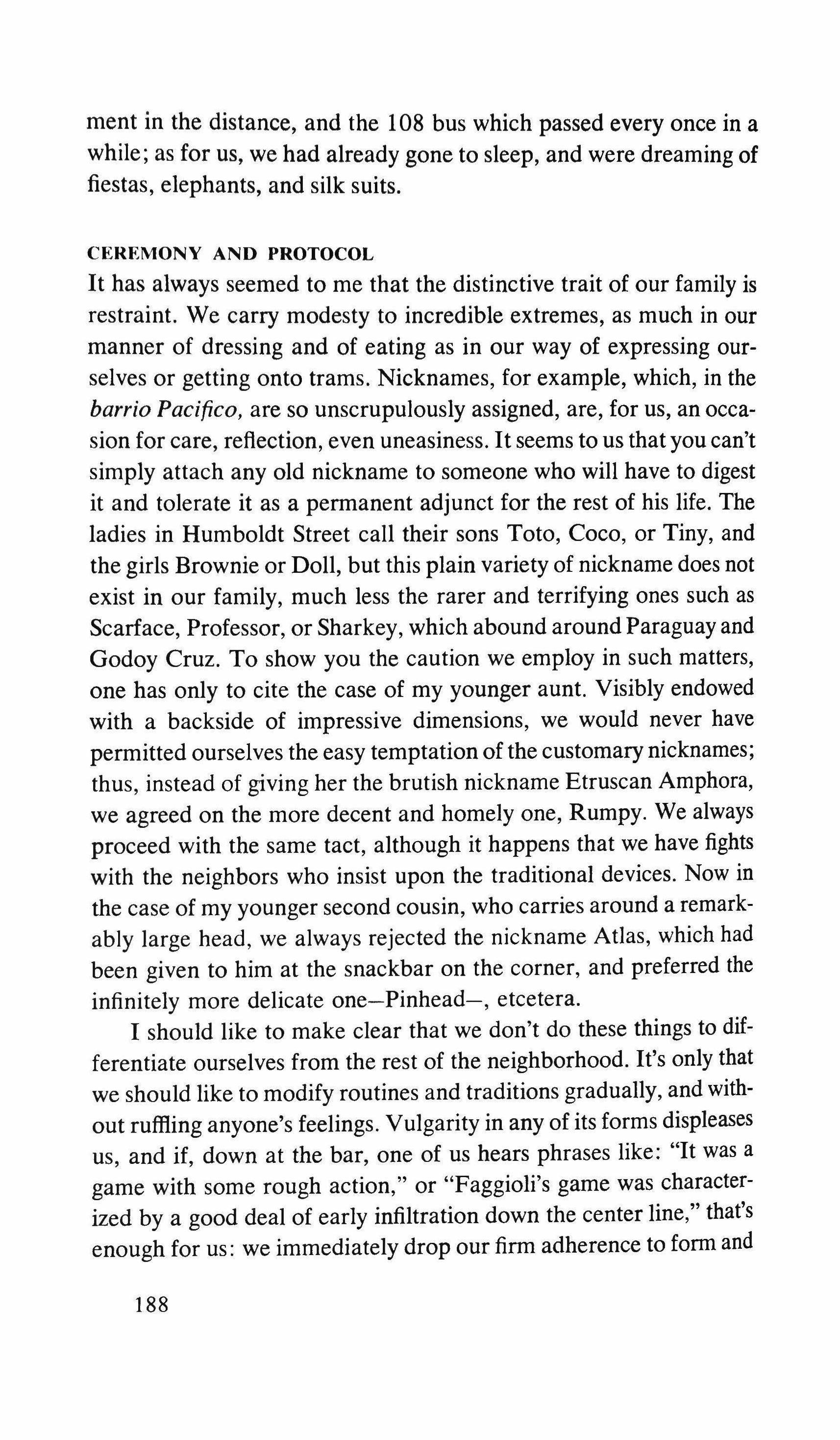 She asked what my name was, and after considering it with a very serious face, she told me hers with a smile which, if it wasn't candid, neither was it overly rehearsed. I soon realized that Amilamia had found a midway point, as it were, between the ingenuousness of her years and the formulas of adult mimicry which well brought up children should know, especially for such solemn occasions as introductions and farewells. Amilamia's seriousness was more of a natural trait, so much so that her moments of spontaneity seemed cultivated by contrast. I would like to recall her as she was on different afternoons, with a succession of fixed images which, taken together, render Amilamia in her entirety. It doesn't cease to surprise me that I can't think of her as she really was, or as she really moved, lightly and curiously, looking this way and that way constantly. I should try to recall her glued to a certain spot forever, as if in an album. Amilamia in the distance, a dot where the hill used