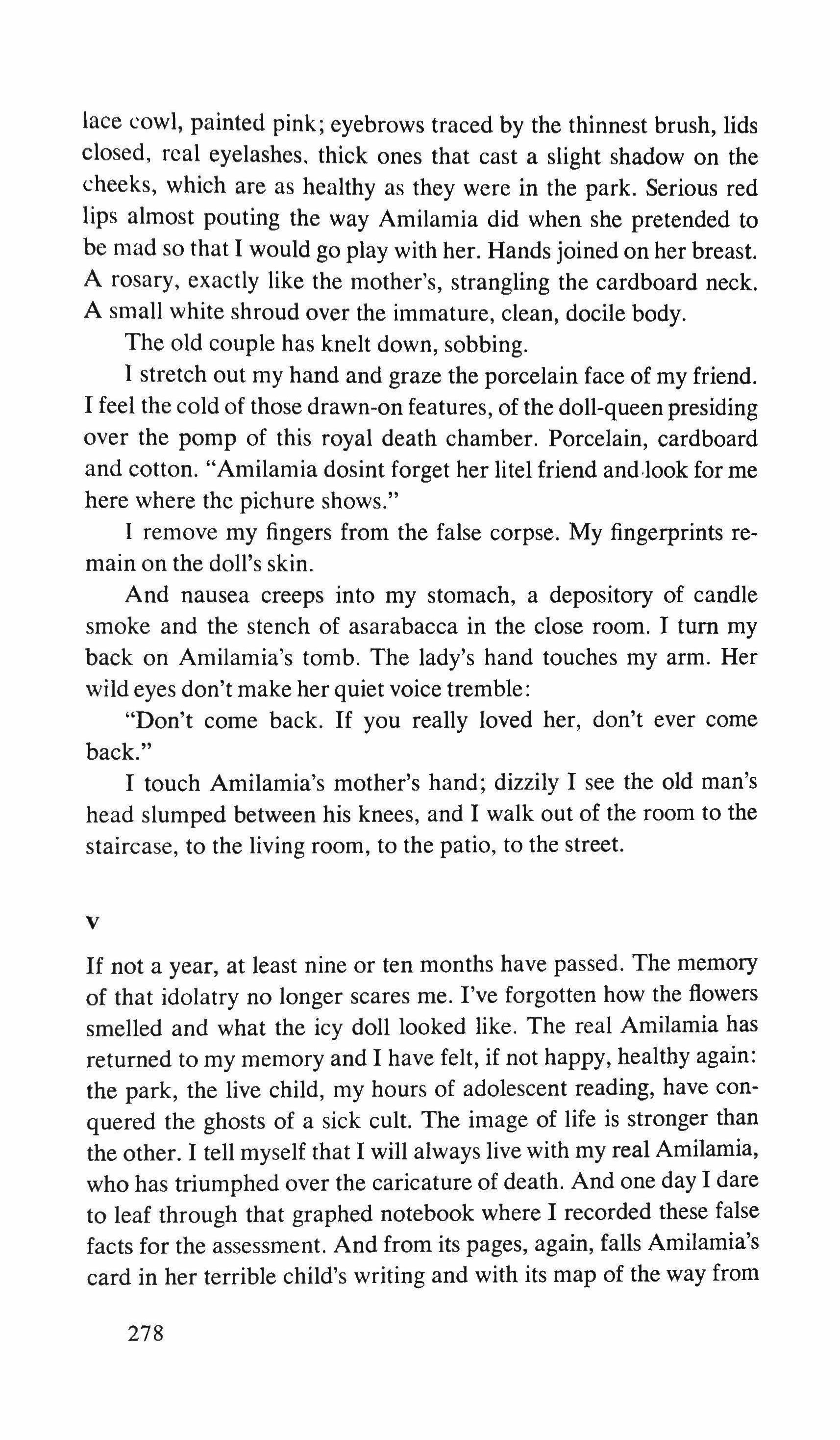 lace cowl, painted pink; eyebrows traced by the thinnest brush, lids closed, real eyelashes, thick ones that cast a slight shadow on the cheeks, which are as healthy as they were in the park. Serious red lips almost pouting the way Amilamia did when she pretended to be mad so that I would go play with her. Hands joined on her breast. A rosary, exactly like the mother's, strangling the cardboard neck. A small white shroud over the immature, clean, docile body. The old couple has knelt down, sobbing.