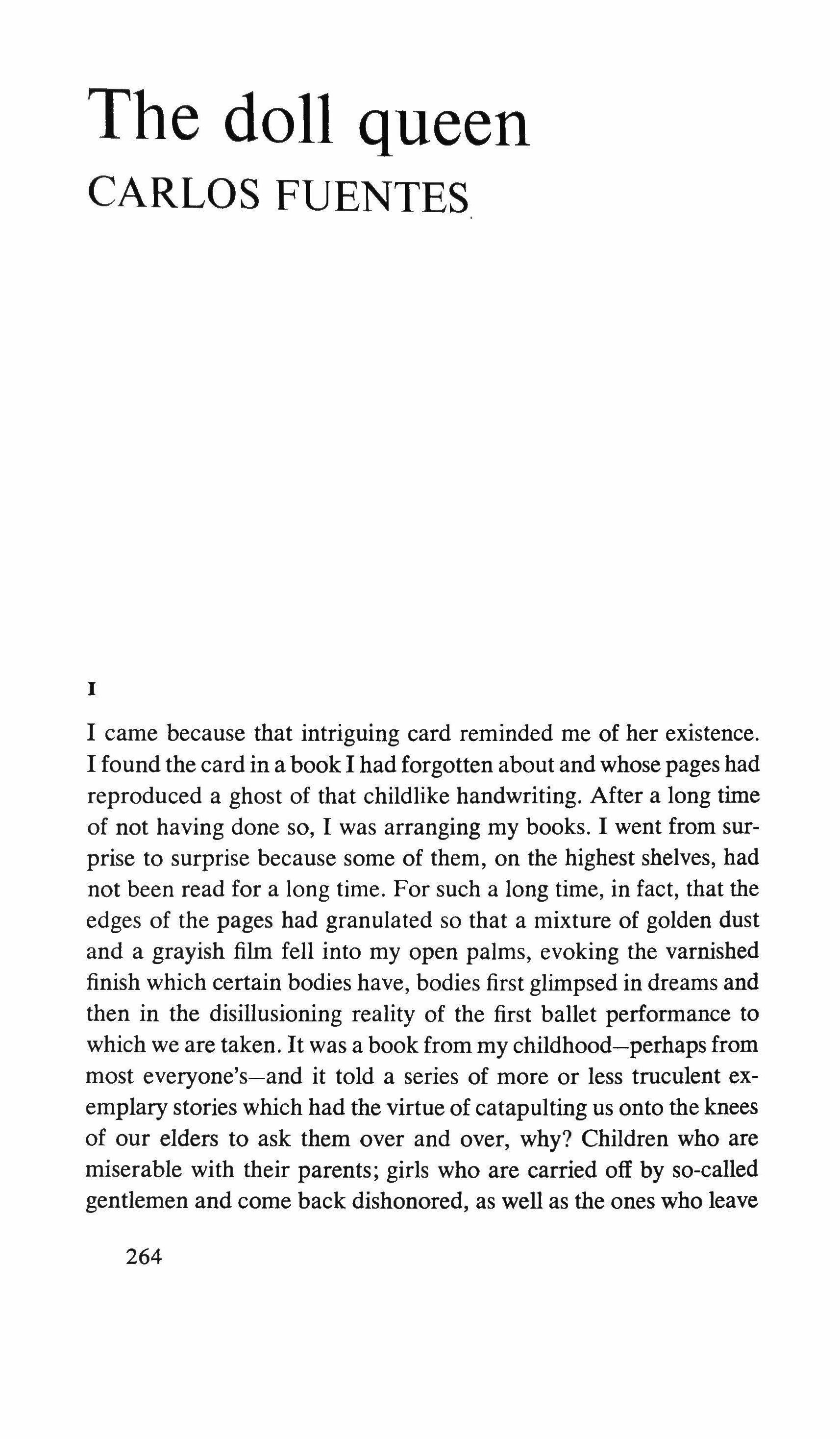 I came because that intriguing card reminded me of her existence. I found the card in a book I had forgotten about and whose pages had reproduced a ghost of that childlike handwriting. After a long time of not having done so, I was arranging my books. I went from surprise to surprise because some of them, on the highest shelves, had not been read for a long time. For such a long time, in fact, that the edges of the pages had granulated so that a mixture of golden dust and a grayish film fell into my open palms, evoking the varnished finish which certain bodies have, bodies first glimpsed in dreams and then in the disillusioning reality of the first ballet performance to which we are taken. It was a book from my childhood-perhaps from most everyone's-and it told a series of more or less truculent exemplary stories which had the virtue of catapulting us onto the knees of our elders to ask them over and over, why? Children who are miserable with their parents; girls who are carried off by so-called gentlemen and come back dishonored, as well as the ones who leave