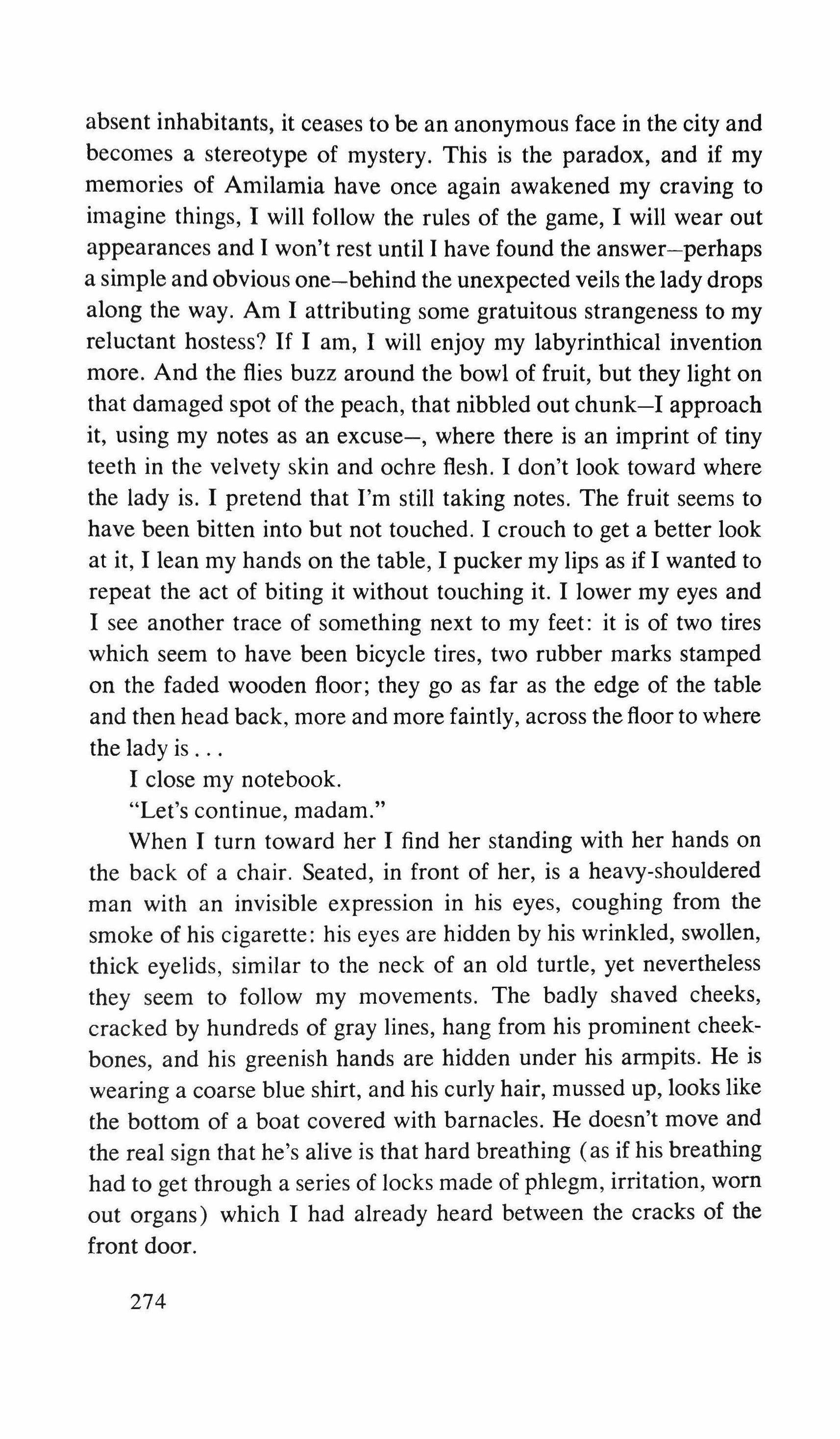 absent inhabitants, it ceases to be an anonymous face in the city and becomes a stereotype of mystery. This is the paradox, and if my memories of Amilamia have once again awakened my craving to imagine things, I will follow the rules of the game, I will wear out appearances and I won't rest until I have found the answer-perhaps a simple and obvious one-behind the unexpected veils the lady drops along the way. Am I attributing some gratuitous strangeness to my reluctant hostess? If I am, I will enjoy my labyrinthical invention more. And the flies buzz around the bowl of fruit, but they light on that damaged spot of the peach, that nibbled out chunk-I approach it, using my notes as an excuse-, where there is an imprint of tiny teeth in the velvety skin and ochre flesh. I don't look toward where the lady is. I pretend that I'm still taking notes. The fruit seems to have been bitten into but not touched. I crouch to get a better look at it, I lean my hands on the table, I pucker my lips as if I wanted to repeat the act of biting it without touching it. I lower my eyes and I see another trace of something next to my feet: it is of two tires which seem to have been bicycle tires, two rubber marks stamped on the faded wooden floor; they go as far as the edge of the table and then head back, more and more faintly, across the floor to where the lady is