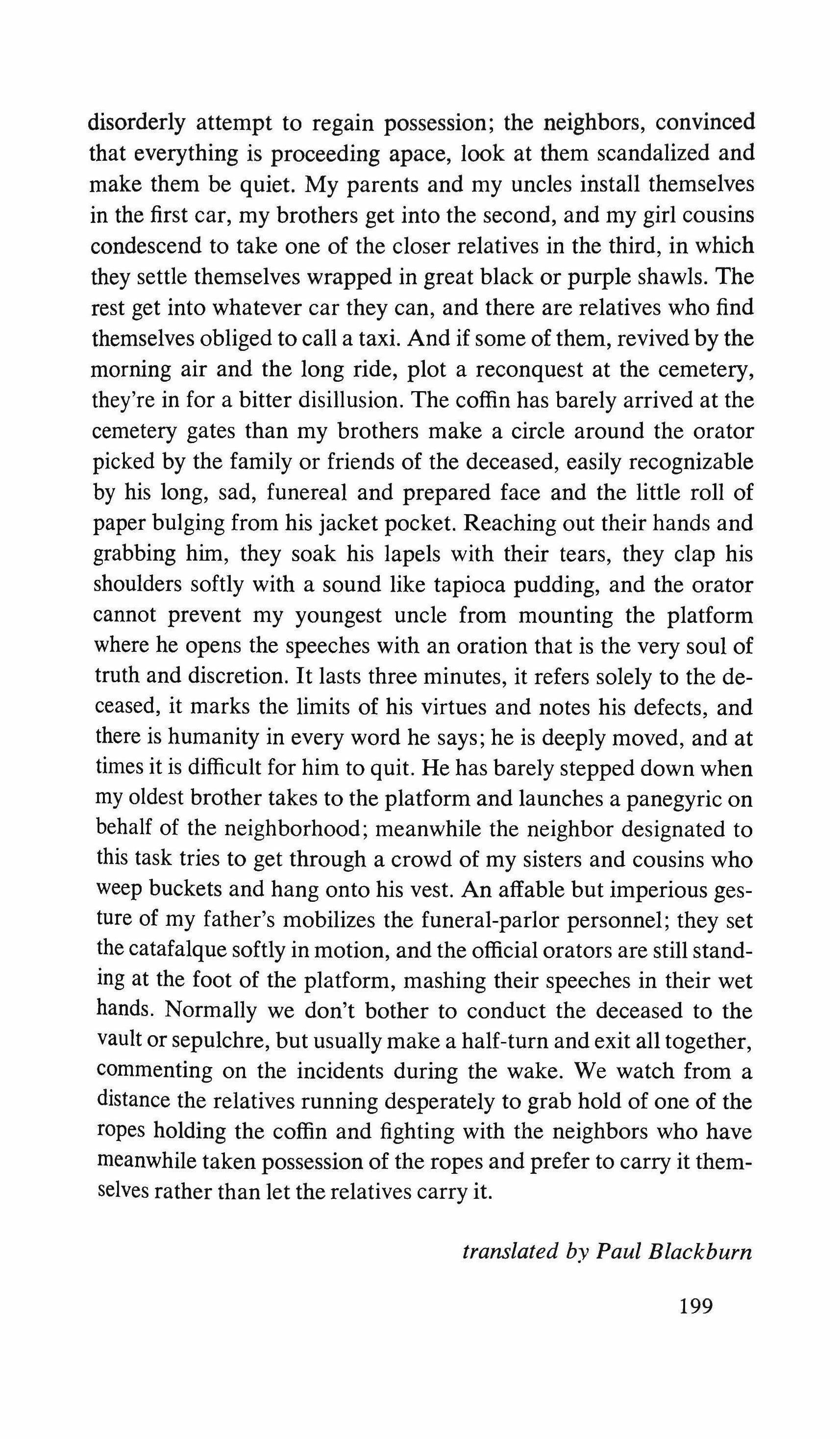 The hinges creak. The smell kills everything: it disperses the rest of my senses, installs itself like a yellow Mongol on the throne of my hallucination, heavy as a chest, insinuating as the rustle of draped silk, ornamented as a Turkish scepter, opaque as a deep lost vein, brilliant as a dead star. The hands release me. More than the crying, it is the old couple's trembling which surrounds me. I open my eyes slowly: I let the liquid dizziness of my cornea and then the net of my eyelashes discover the room suffocated by that huge battle of perfumes, vapors and dew from almost red petals. The presence of flowers here is such that they undoubtedly have living skin: sweetness of hedge mustard, nausea of aserabacca, tomb of tuberose, temple of the gardenia; the tiny windowless room lit up by the incandescent flame-nails of heavy sputtering candles projects its dry wax and damp flowers into the heart of the plexus and only from there, from the sun of life, is it possible to revive and contemplate behind the candles and among the dispersed flowers, the accumulation of old toys, colored hoops and wrinkled deflated balloons, old transparent plums, wooden horses with ruined manes, old skates, blind dolls with their wigs torn off, teddy bears emptied of their sawdust, oilcloth ducks riddled with holes, moth-bitten dogs, rotting jump ropes, glass jars full of dried sweets, worn out childish shoes, the tricycle-three wheels?; no, two; and not a bicycle's; two parallel wheels, underneath-, the worsted leather shoes; and in front of me, within hand's reach, the little coffin resting on blue boxes decorated with paper flowers, life flowers this time, carnations and sunflowers, poppies and tulips, but like the others, the death flowers, part of the same brew made by all the elements of this wintery funeral in which, inside the silver plated coffin and between the black silk sheets and on the white satin mattress, lies that still, serene face framed by a