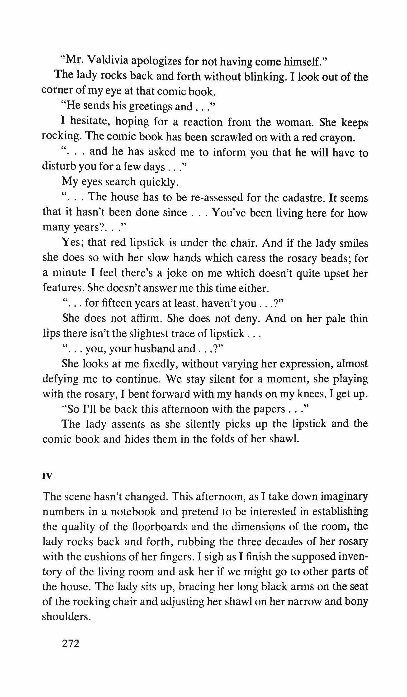 "Mr. Valdivia apologizes for not having come himself." The lady rocks back and forth without blinking. I look out of the corner of my eye at that comic book.