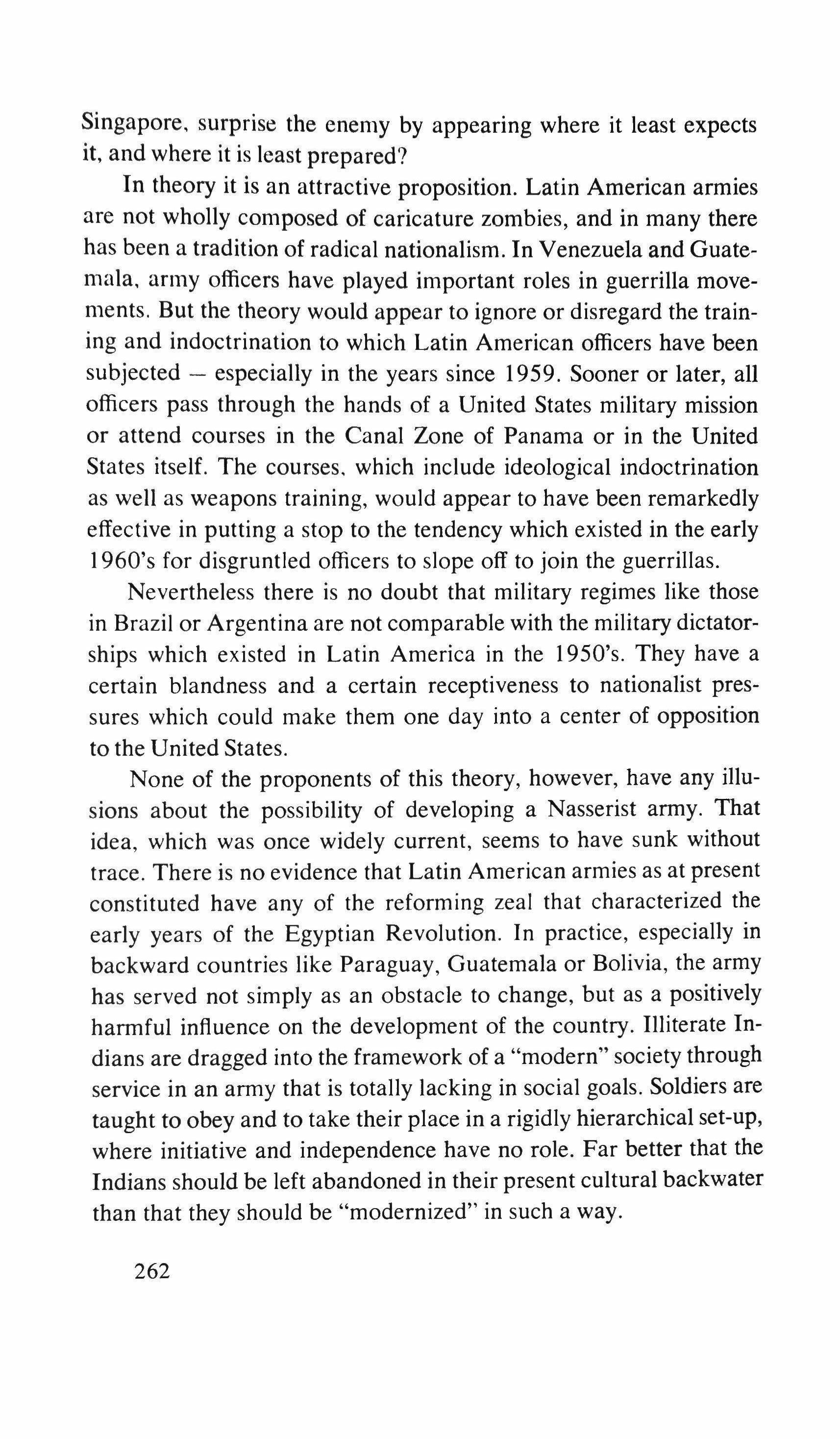 None of the proponents of this theory, however, have any illusions about the possibility of developing a Nasserist army. That idea, which was once widely current, seems to have sunk without trace. There is no evidence that Latin American armies as at present constituted have any of the reforming zeal that characterized the early years of the Egyptian Revolution. In practice, especially in backward countries like Paraguay. Guatemala or Bolivia, the army has served not simply as an obstacle to change, but as a positively harmful influence on the development of the country. Illiterate Indians are dragged into the framework of a "modern" society through service in an army that is totally lacking in social goals. Soldiers are taught to obey and to take their place in a rigidly hierarchical set-up, where initiative and independence have no role. Far better that the Indians should be left abandoned in their present cultural backwater than that they should be "modernized" in such a way.