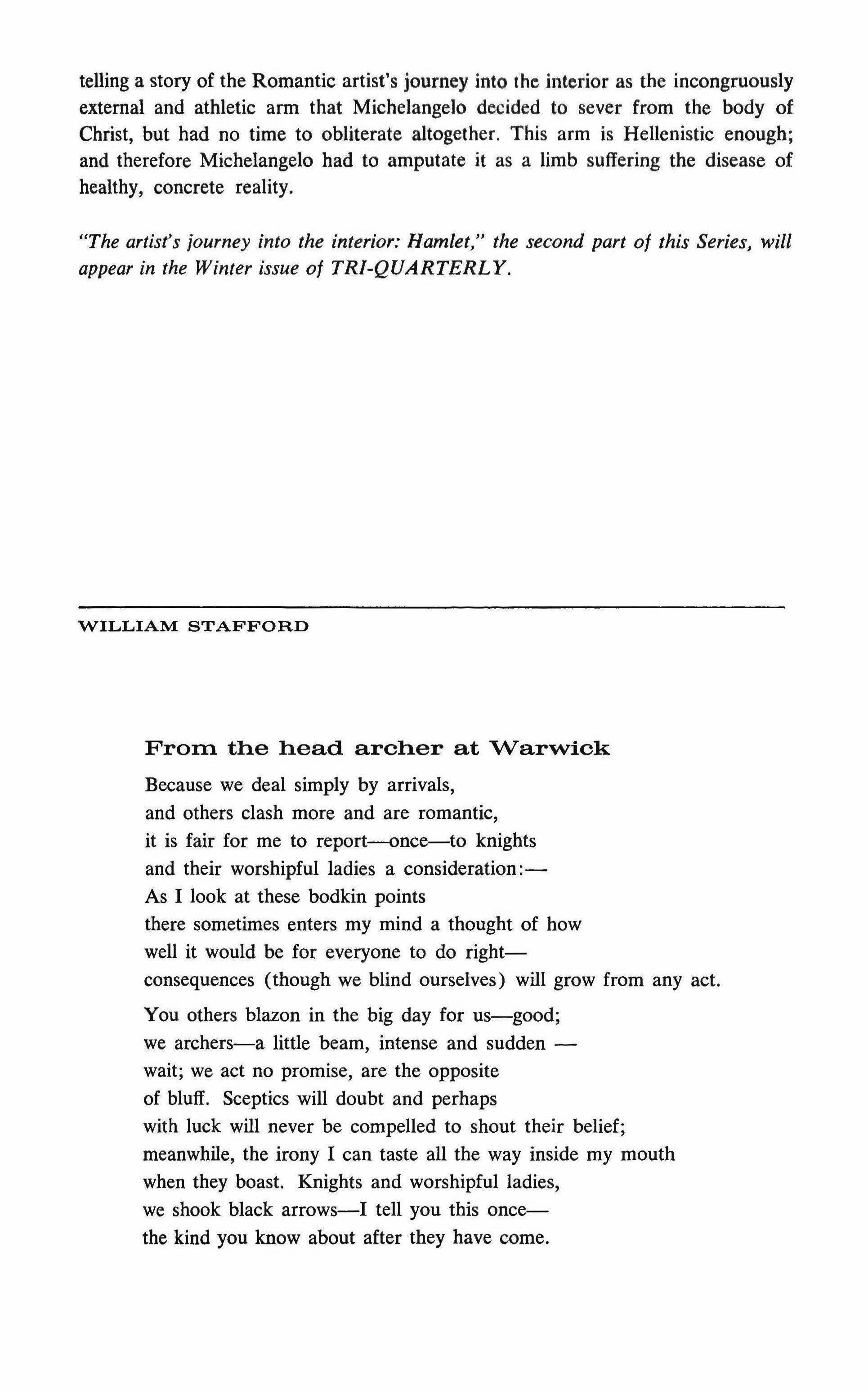 WILLIAM STAFFORD 47 From the head archer at Warwick / Chronicler and historian / Isolationists / Extended Haiku / Exorcism