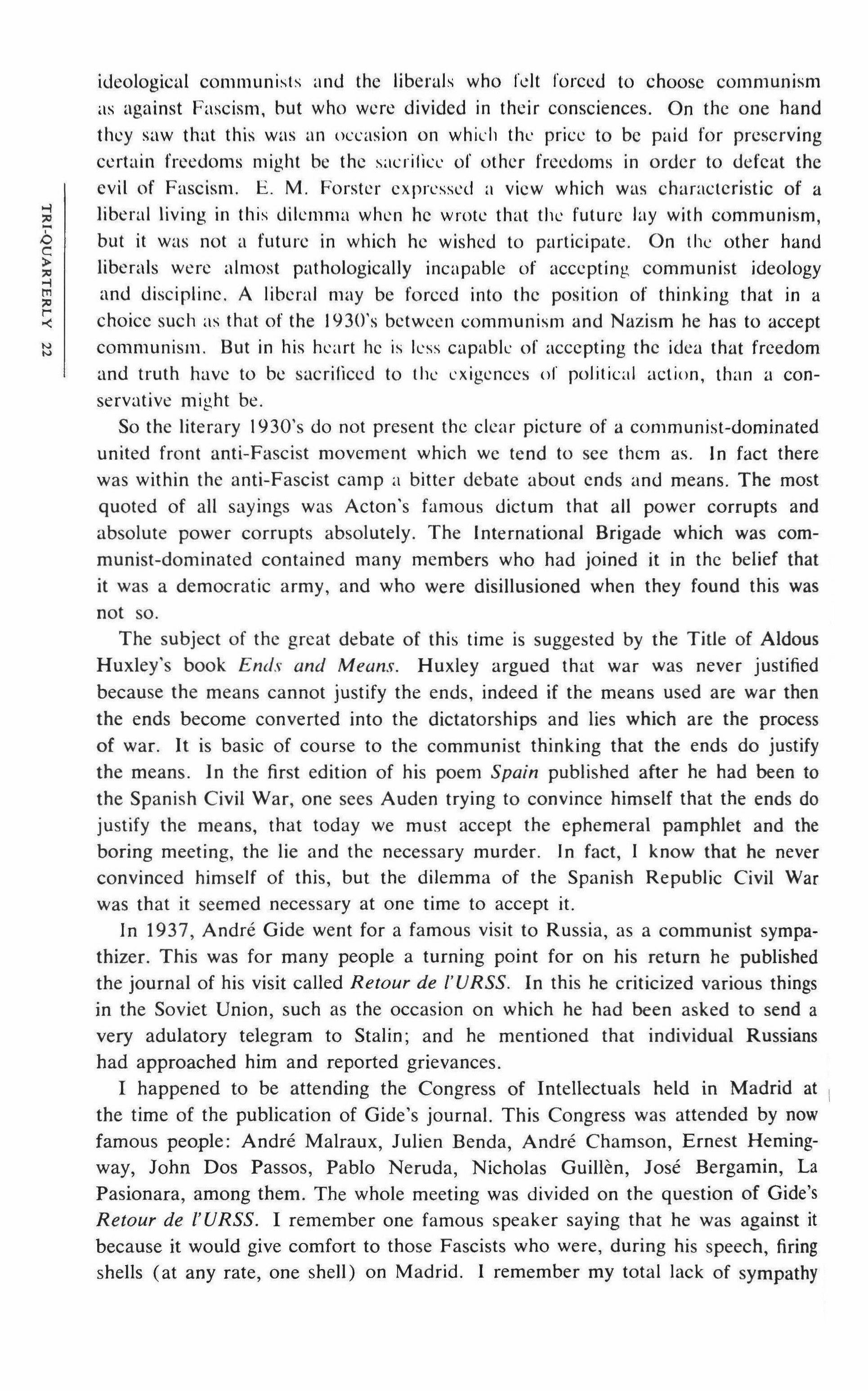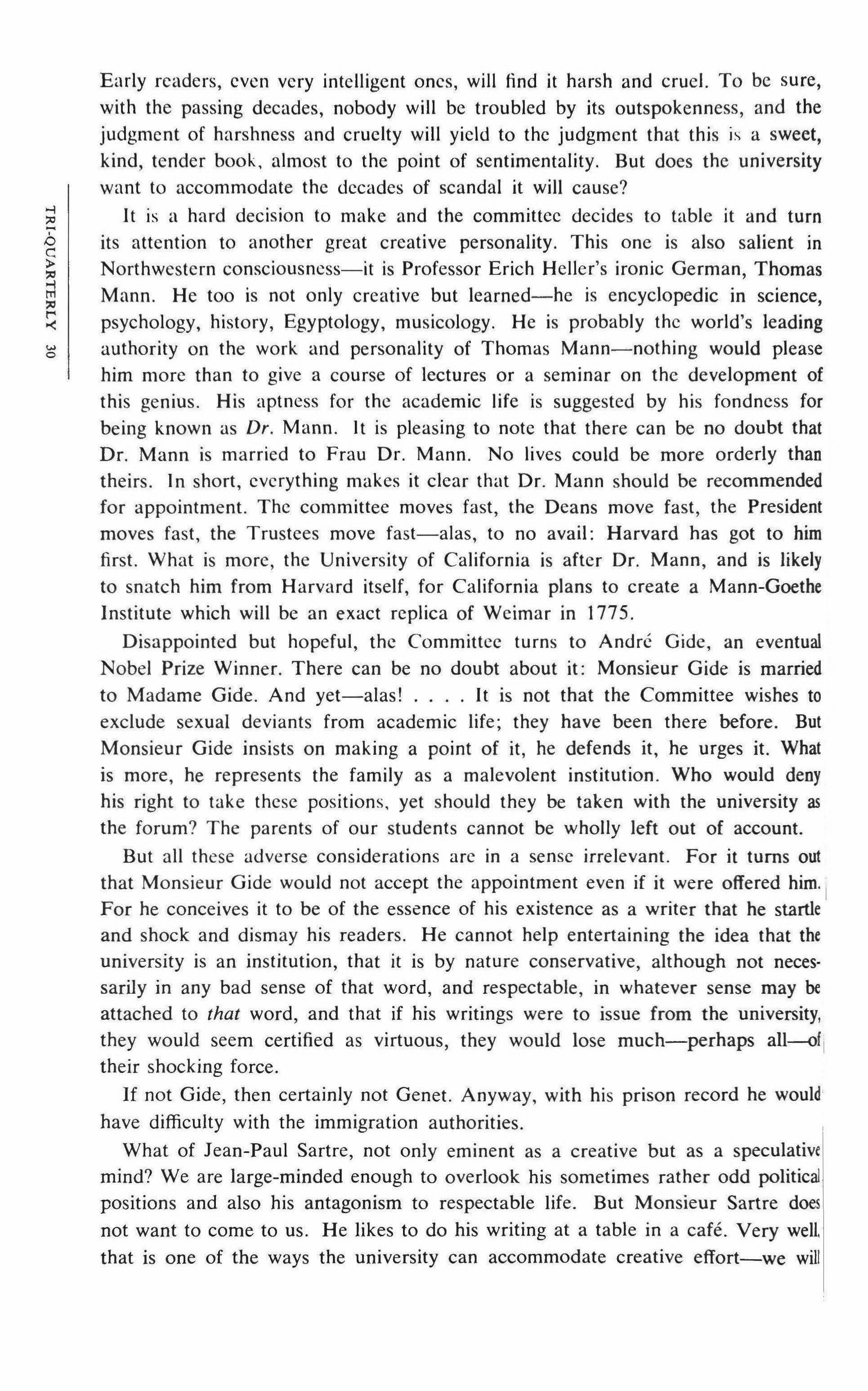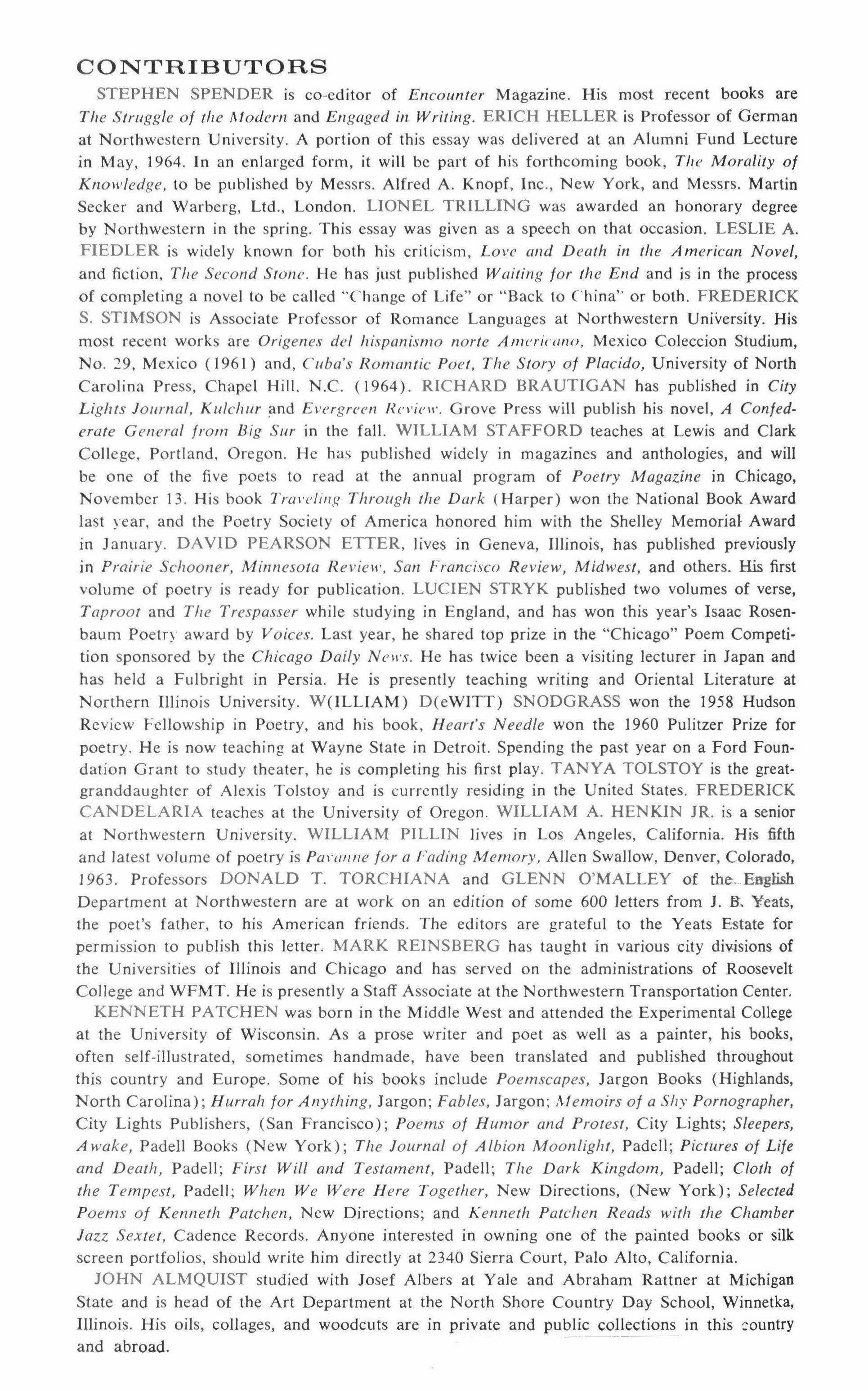 STEPHEN SPENDER is co-editor of Encounter Magazine. His most recent books are The Struggle of the Modern and Engaged in Writing. ERICH HELLER is Professor of German at Northwestern University. A portion of this essay was delivered at an Alumni Fund Lecture in May, 1964. In an enlarged form, it will be part of his forthcoming book, The Morality of Knowledge, to be published by Messrs. Alfred A. Knopf, Inc., New York, and Messrs. Martin Seeker and Warberg, Ltd., London. LIONEL TRILLING was awarded an honorary degree by Northwestern in the spring. This essay was given as a speech on that occasion. LESLIE A. FIEDLER is widely known for both his criticism, Love and Death ill the American Novel, and fiction, The Second Stone, He has just published Waiting for the End and is in the process of completing a novel to be called "Change of Life" or "Back to China" or both. FREDERICK S. STIMSON is Associate Professor of Romance Languages at Northwestern University. His most recent works are Origenes del hispanismo norte Americana, Mexico Coleccion Studium, No. 29, Mexico (1961) and, Cuba's Romantic Poet, The Story of Placido, University of North Carolina Press, Chapel Hill. N.C. (1964). RICHARD BRAUTIGAN has published in City Lights Journal, Kulch ur and Evergreen Review, Grove Press will publish his novel, A Confederate General from Big Sur in the fall. WILLIAM STAFFORD teaches at Lewis and Clark College, Portland, Oregon. He has published widely in magazines and anthologies, and will be one of the five poets to read at the annual program of Poetry Magazine in Chicago, November 13. His book Traveling Through the Dark (Harper) won the National Book Award last year, and the Poetry Society of America honored him with the Shelley Memorial Award in January, DAVID PEARSON ETTER, lives in Geneva, lllinois, has published previously in Prairie Schooner, Minnesota Review, San Francisco Review, Midwest, and others. His first volume of poetry is ready for publication. LUCIEN STRYK published two volumes of verse, Taproot and The Trespasser while studying in England, and has won this year's Isaac Rosenbaum Poetry award by Voices. Last year, he shared top prize in the "Chicago" Poem Competition sponsored by the Chicago Daily News. He has twice been a visiting lecturer in Japan and has held a Fulbright in Persia. He is presently teaching writing and Oriental Literature at Northern Illinois University. W(lLLIAM) D(eWITT) SNODGRASS won the 1958 Hudson Review Fellowship in Poetry, and his book, Heart's Needle won the 1960 Pulitzer Prize for poetry. He is now teaching at Wayne State in Detroit. Spending the past year on a Ford Foundation Grant to study theater, he is completing his first play. TANYA TOLSTOY is the greatgranddaughter of Alexis Tolstoy and is currently residing in the United States, FREDERICK CANDELARIA teaches at the University of Oregon. WILLIAM A. HENKIN JR. is a senior at Northwestern University. WILLIAM PILLIN lives in Los Angeles, California. His fifth and latest volume of poetry is Pavan ne for a Fading Memory, Allen Swallow, Denver, Colorado, 1963. Professors DONALD T. TORCHIANA and GLENN O'MALLEY of the, Eaglish Department at Northwestern are at work on an edition of some 600 letters from J. B.. Yeats, the poet's father, to his American friends. The editors are grateful to the Yeats Estate for permission to publish this letter. MARK REINSBERG has taught in various city divisions of the Universities of Illinois and Chicago and has served on the administrations of Roosevelt College and WFMT. He is presently a Staff Associate at the Northwestern Transportation Center.