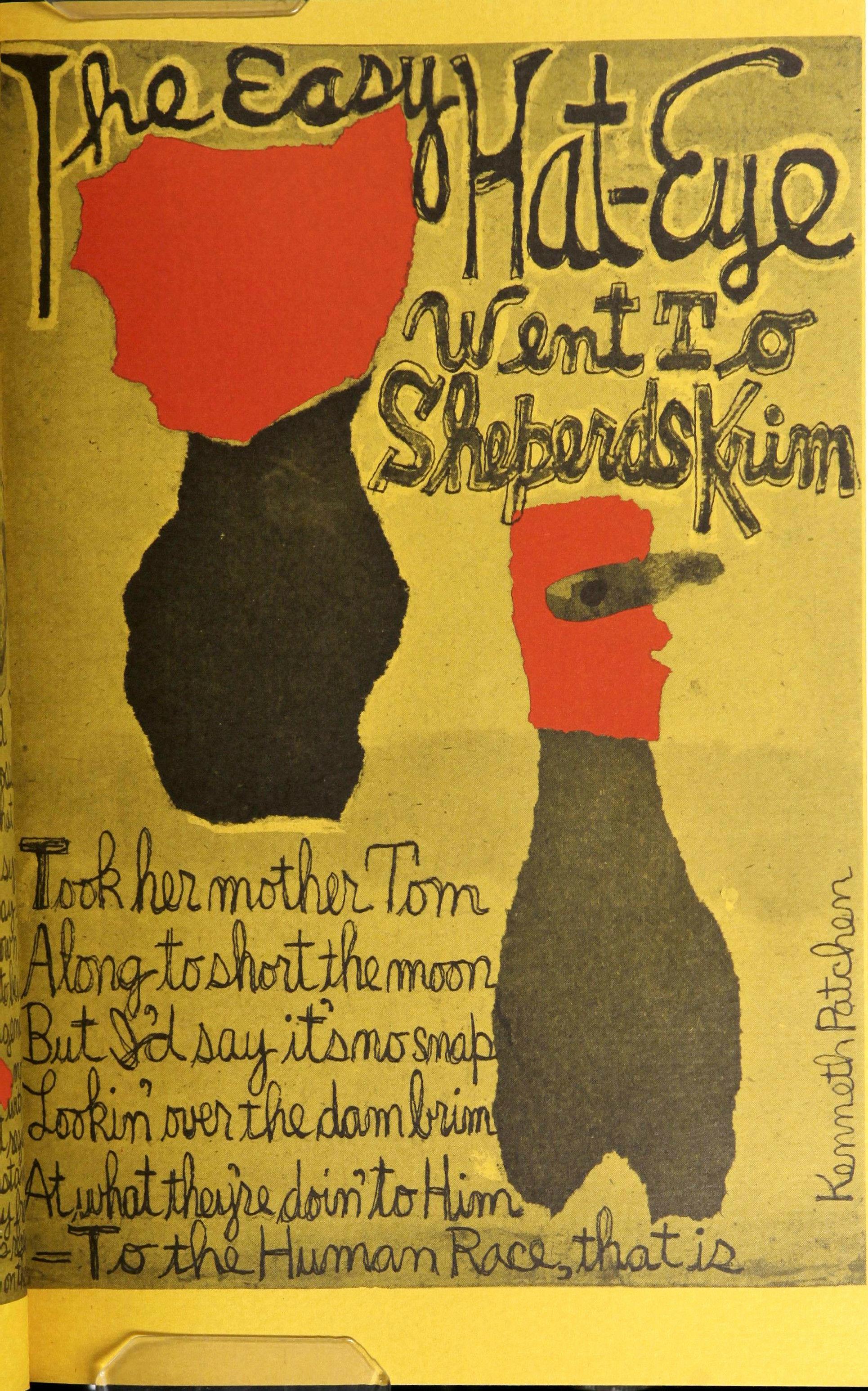 KENNETH PATCHEN was born in the Middle West and attended the Experimental College at the University of Wisconsin, As a prose writer and poet as well as a painter, his books, often self-illustrated, sometimes handmade, have been translated and published throughout this country and Europe. Some of his books include Poemscapes, Jargon Books (Highlands, North Carolina) ; Hurrah for Anything, Jargon; Fables, Jargon; Memoirs of a Shy Pornographer, City Lights Publishers, (San Francisco); Poems of Humor and Protest, City Lights; Sleepers, Awake, Padell Books (New York); The Journal of Albion Moonlight, Padell; Pictures of Life and Death, Padell; First Will and Testament, Padell; The Dark Kingdom, Padell; Cloth of the Tempest, Padell; When We Were Here Together, New Directions, (New York); Selected Poems of Kenneth Patchen, New Directions; and Kenneth Patchen Reads with the Chamber Jazz Sextet, Cadence Records. Anyone interested in owning one of the painted books or silk screen portfolios, should write him directly at 2340 Sierra Court, Palo Alto, California.