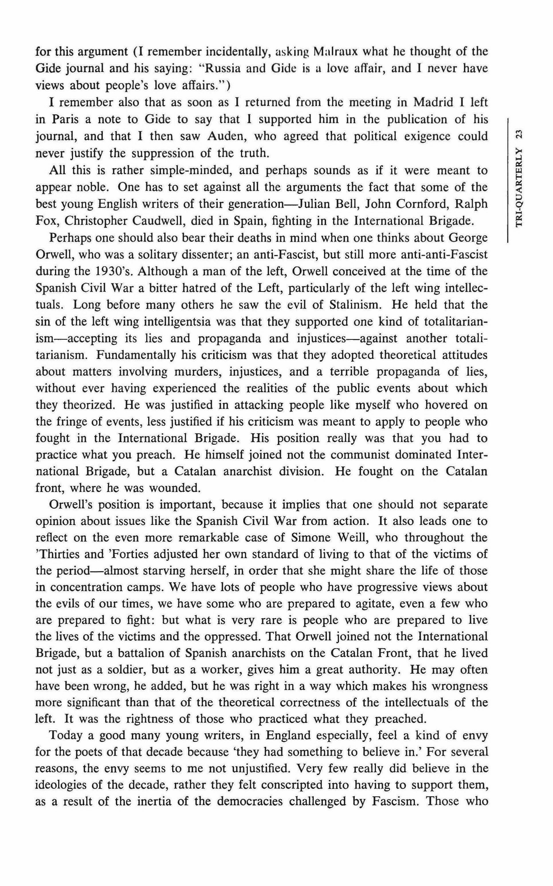 long established (by George Orwell, for instance) that such willed political naivete at best proves powerless in the defense of freedom, lit worst conceals a yearning for some New Totalitarianism that will inscribe, say, Marxist slogans on its walls and banners. Perhaps it is a dim awareness of this that cues Mr. Snow's special virulence toward Orwell, his insistence on the superiority to 1984 of J. D. Bernal's World Without War-not because the latter is a truer book (the word does not occur to Mr. Snow) but because it expresses a greater "love of the Future," a Future in which Mr. Snow persists in believing that more and more and more science will mitigate the terror which merely more and more science has created.