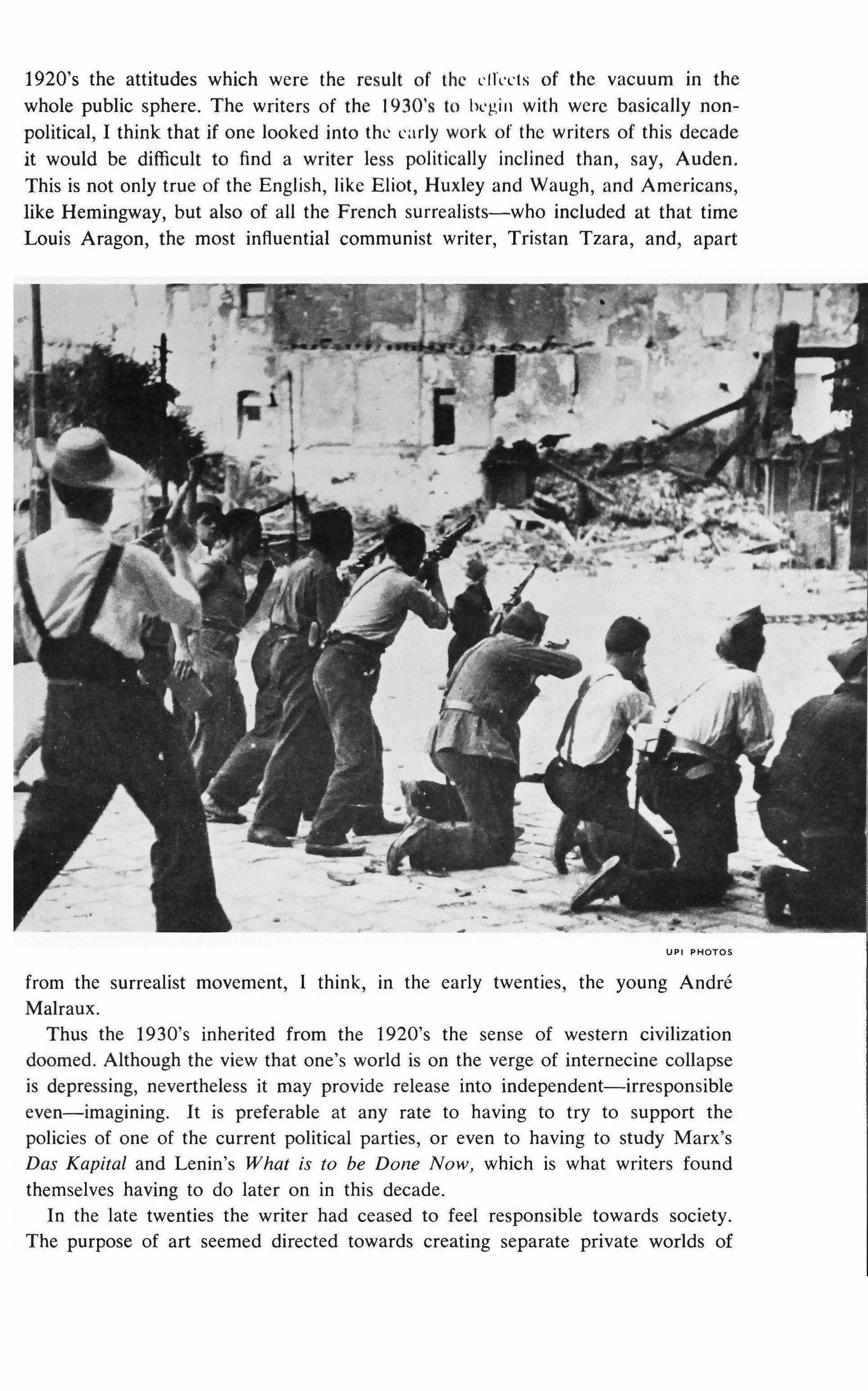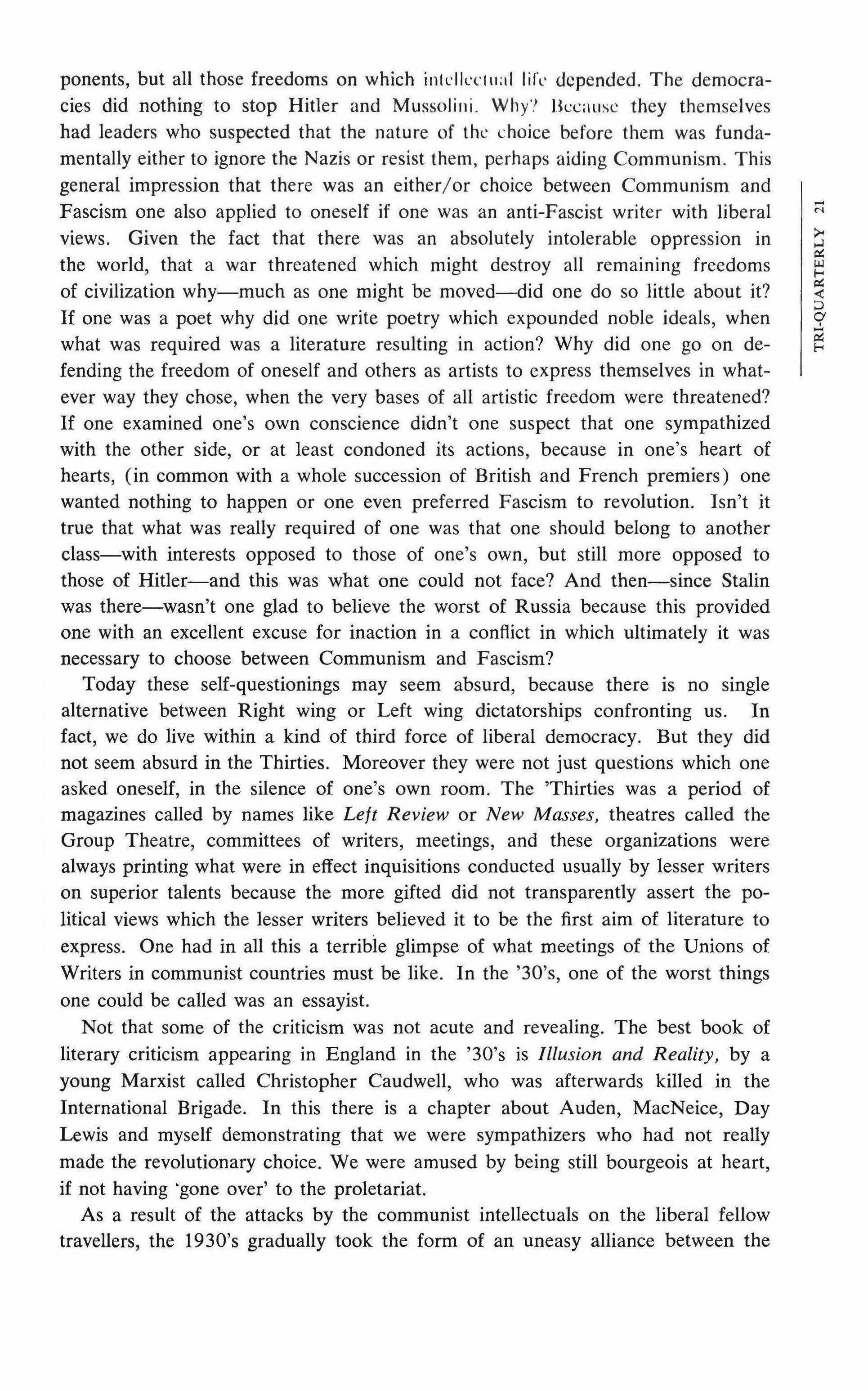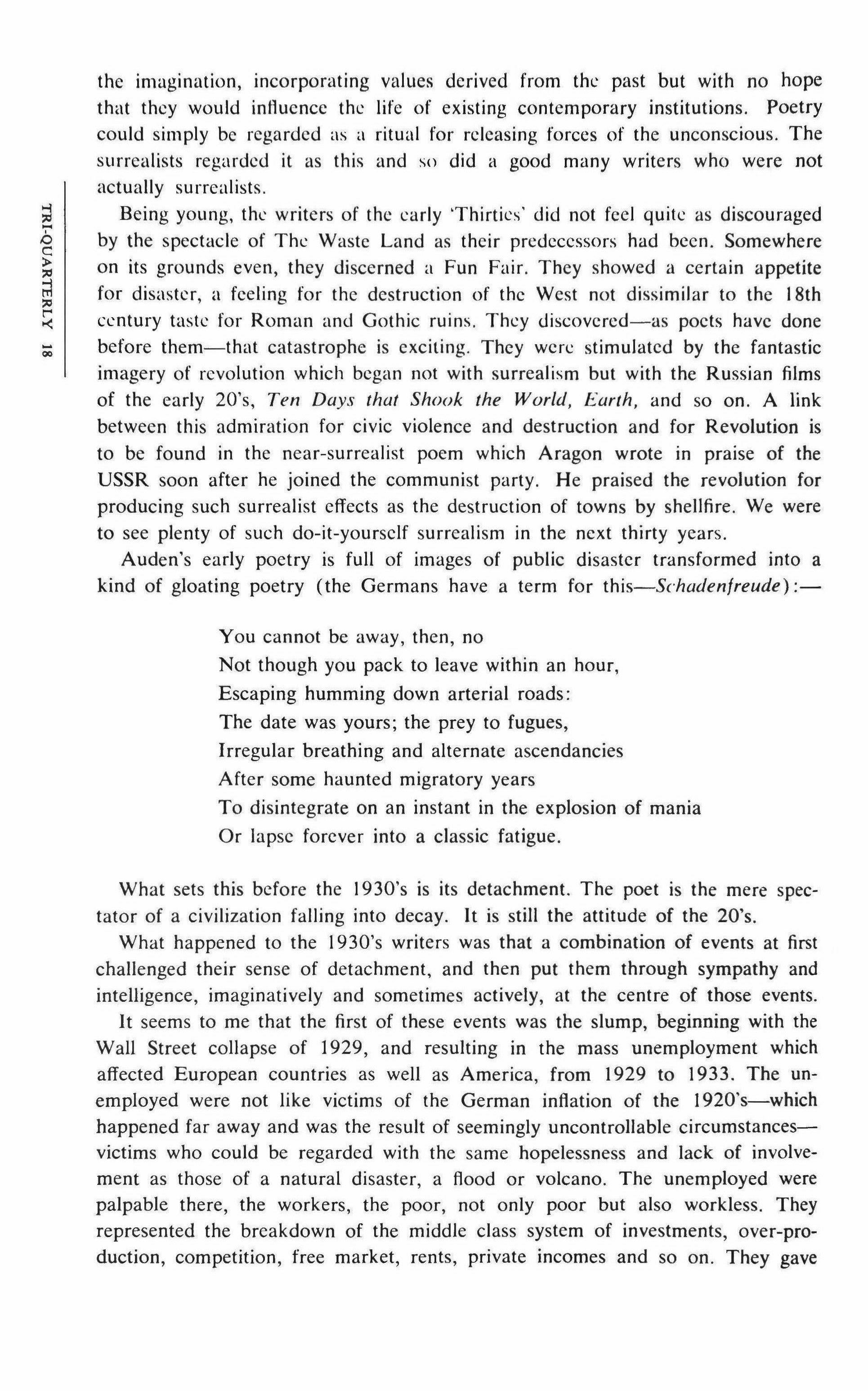 In the world of mass culture and the assault on standards, poetry is not immune to vulgarization. It, too, becomes a trade, a means of social-climbing; and the New Literary Men may well be drawn from the status-hungry, imperfectly-literate new middle classes who justify their economic success to their consciences by pledging allegiance to the lost radicalism of their fathers who had hoped better of them. But poetry is, as such, a means of self-criticism, especially in the area of language; it is language which the poet redeems and attempts to make his own. The poet, moreover, unlike the scientist, does not distinguish between a world of work in which precision and respect for truth reign, and a world of "life" where sentimentality and a vague love for the Future are regarded as sufficient. And, finally, the poet is not driven endlessly to find and declare himself (with all the rest of mankind) Innocent, Innocent, Innocent!