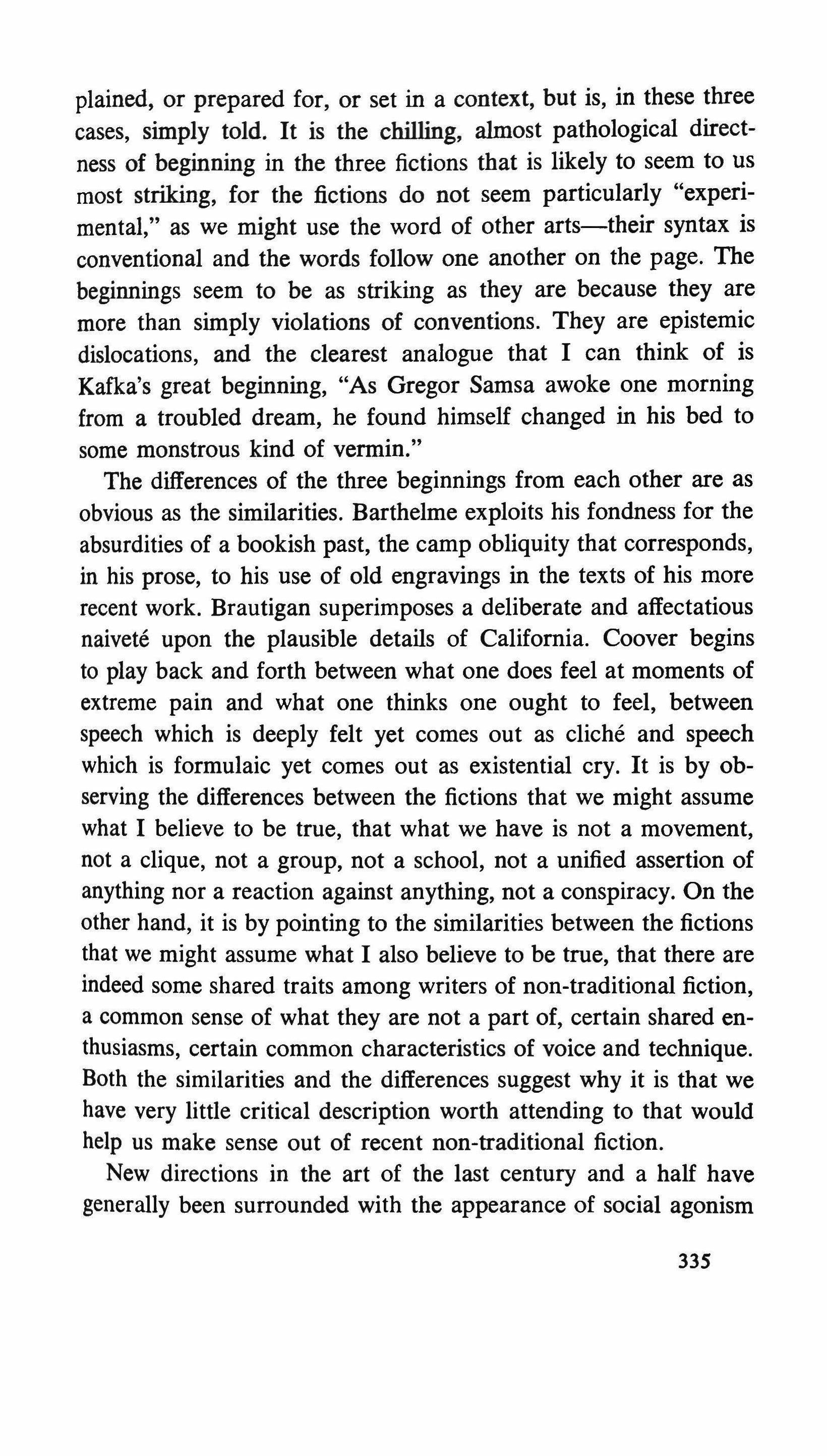 In place of James' earnest dedication to his craft, Barthelme assumes an irreverent stance toward his own work, conceding the arbitrary and artificial nature of what he creates. Literature retracts any Jamesian claims to deal "seriously" with the world and reverts -for quite different reasons-to the kind of open confessions of the artificial, make-believe status of the novel which so annoyed James in his reading of Thackeray and Trollope. The writer's very inability to transcend the solipsism of his perception and the circularity of his medium determines both his subject-matter and his structural principles.