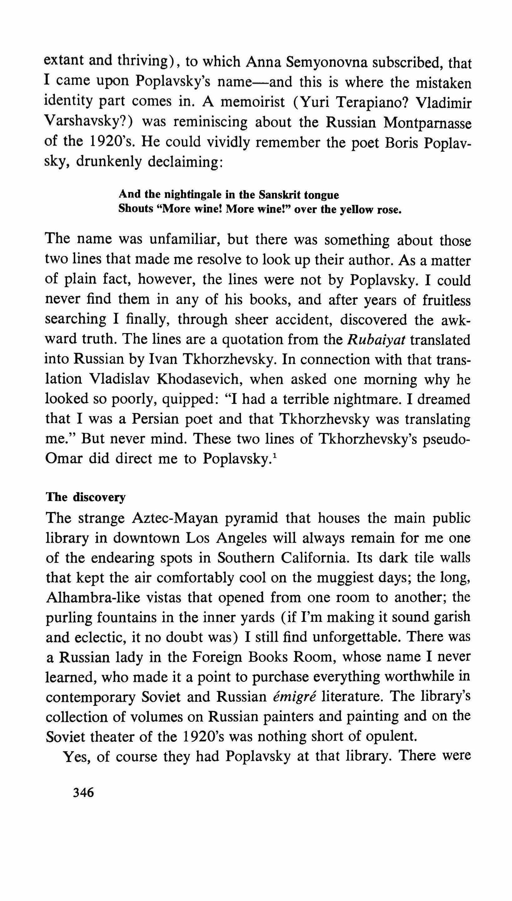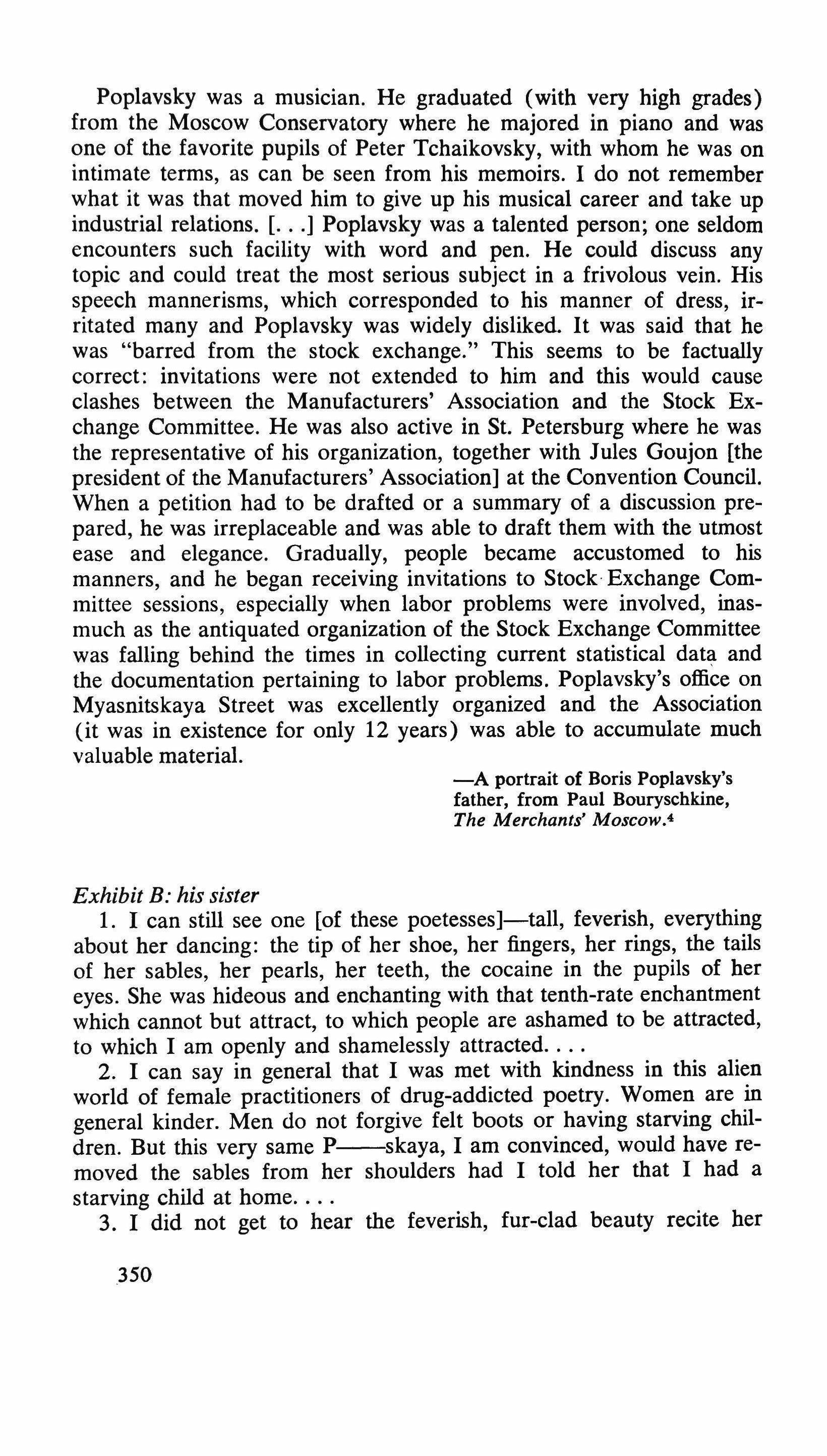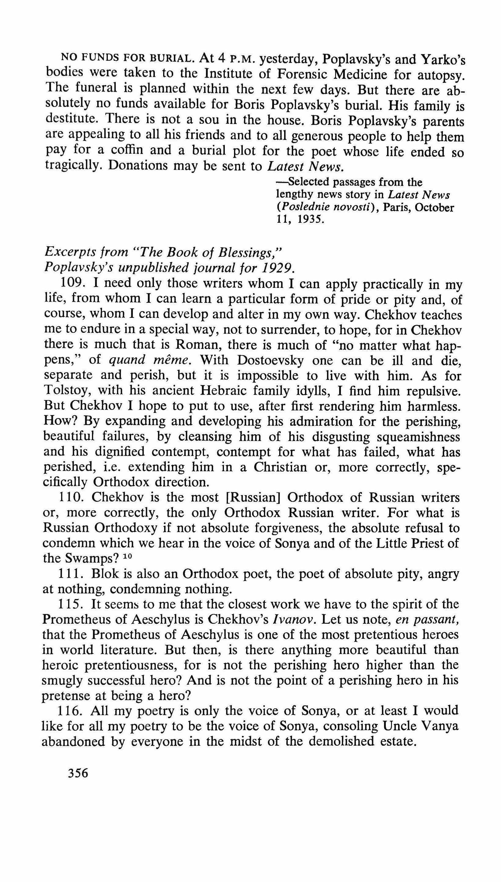 importance among the younger emigres," At Poplavsky's funeral, homage was paid to him by such diverse figures as Mark Aldanov, Alexei Remizov, and Vladislav Khodasevich, whose eloquent obituary of Poplavsky was later reprinted in a collection of his critical essays." And yet, if we were to take a count, there would probably be fewer people in the world today who are aware of Poplavsky's existence than in 1935.