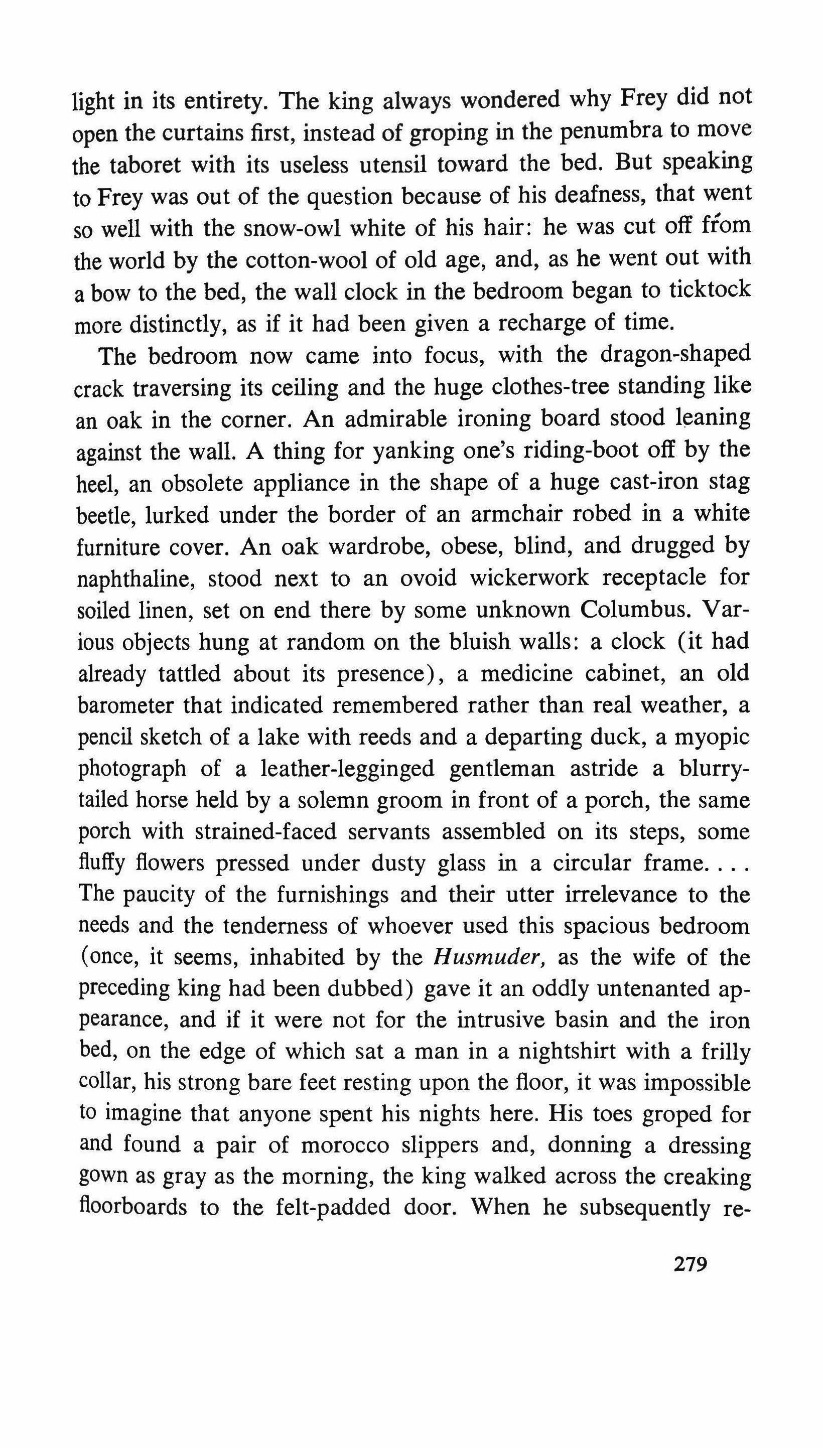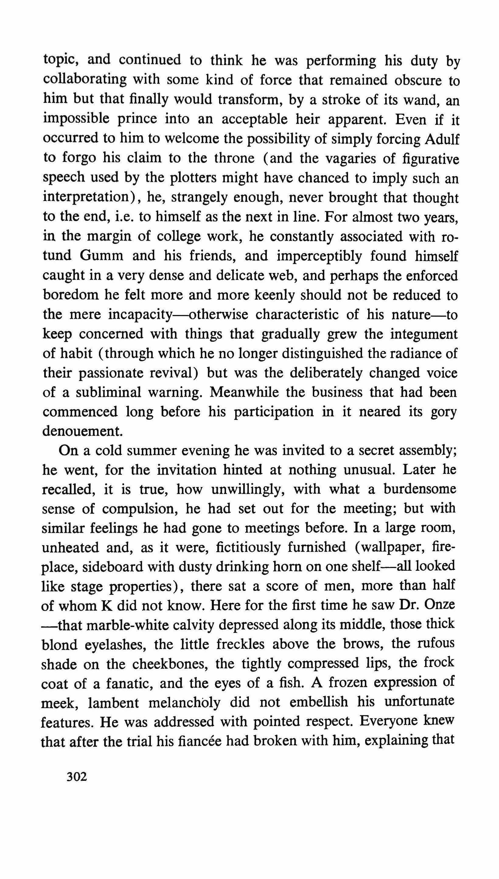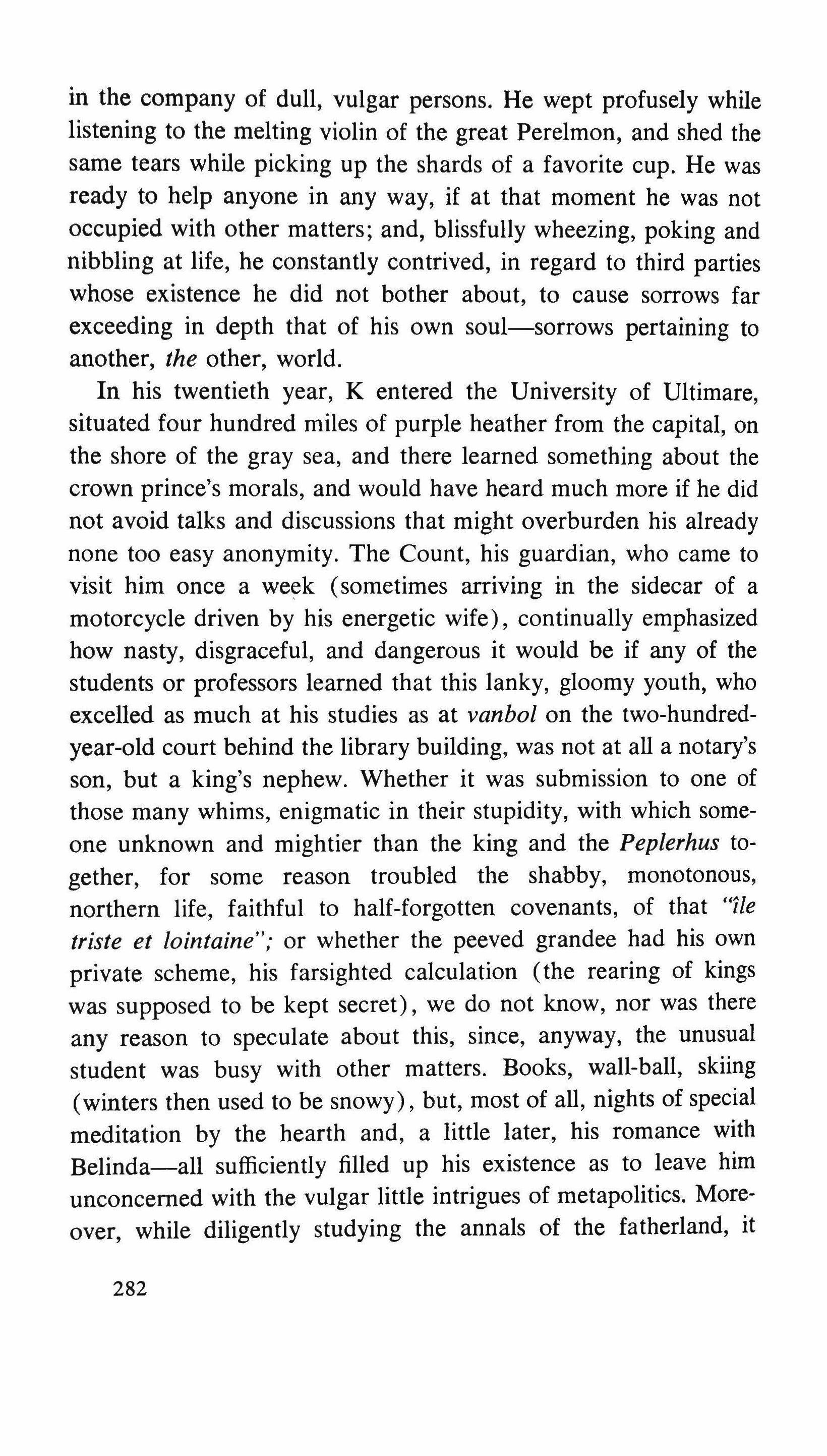1. "Poverty is a sin, retribution, impotence, while luxury is like a kingdom in which everything reflects, extends, incarnates the slightest flutter of God's eyelashes. And nevertheless, stoically, heroically, Oleg managed to bring his life to a realization, extricated it out of its wraps, despite poverty, inertia, and the obscurity of his underground destiny. Having received no education, he wrenched one for himself from the stained, poorly illuminated library books, read while his behind grew numb on the uncomfortable benches. Anemic and emaciated, by abstinence and daily wrestling with heavy iron weights, he forced life to yield him cupola-like shoulder muscles and an iron handgrip. Not handsome, unsure of himself, he used his hellish solitude, know-it-allism, valor, asceticism to master that fierce eye mechanism which was able to subjugate, at times to his own amazement, female heads radiant with youth. For Oleg, like all ascetics, was extraordinarily attractive, and his ugliness, rudeness, and self-assurance only enhanced his charm. Life refused him everything and he created everything for himself, reigning and enjoying himself now amidst the invisible labors of his IS-year effort. Thus, in a conversation he would calmly and slyly radiate the universality of his knowledge, which astounded his listeners as much as did the ease with which he could, while sitting on a sofa, lift and toss