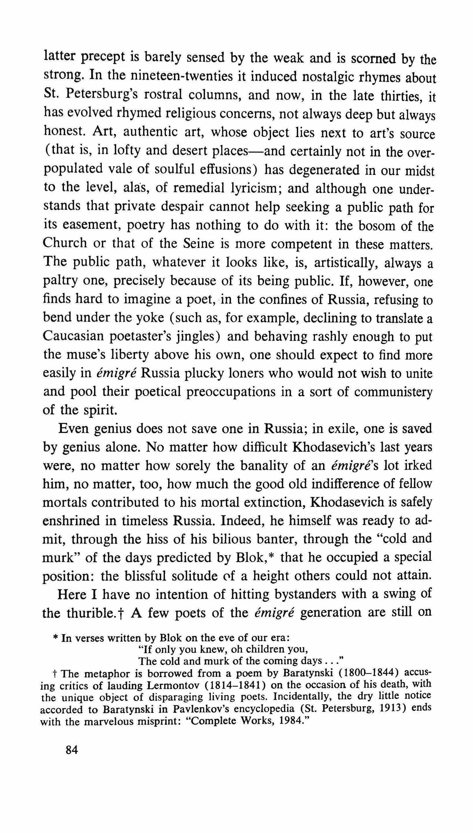 1. recently The Will of Russia (Volya Rossii) discovered the amazingly gifted B. Poplavsky. Of all his delightful poems it printed, not a single one could have possibly appeared in Contemporary Annals (Sovremennye zapiski)-they are far too good and uniquely original for it.